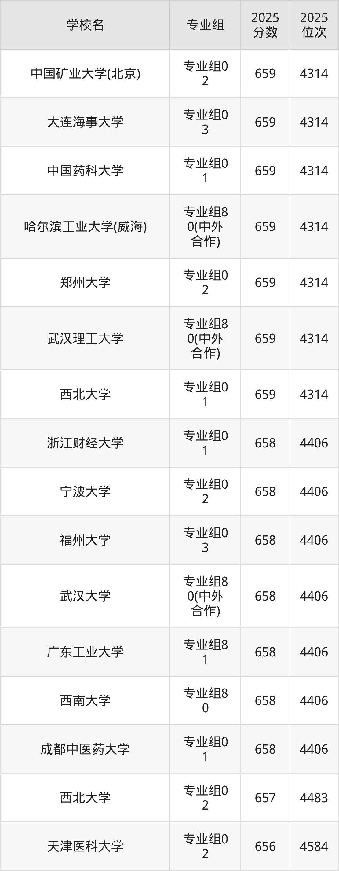 657分可以冲一冲的大学:中国矿业大学(北京)659分、大连海事大学659分、中国药科大学659分、哈尔滨工业大学(威海)659分等;