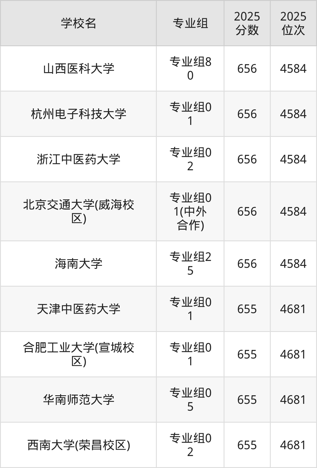 657分较稳妥的大学:天津医科大学656分、山西医科大学656分、杭州电子科技大学656分、浙江中医药大学656分等。