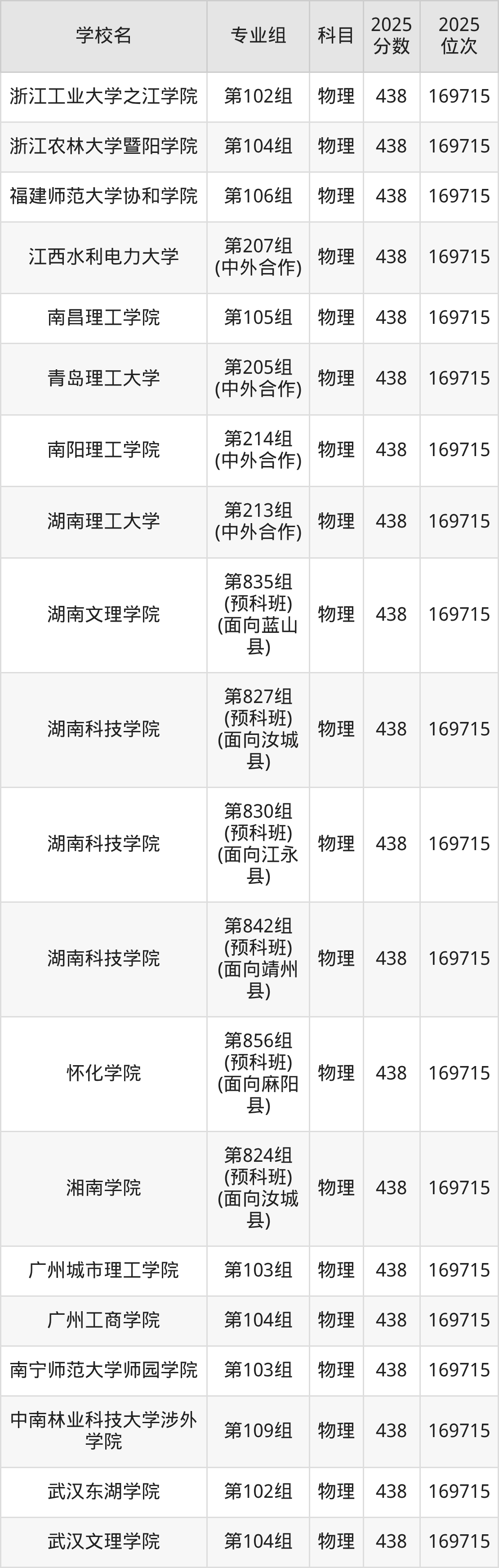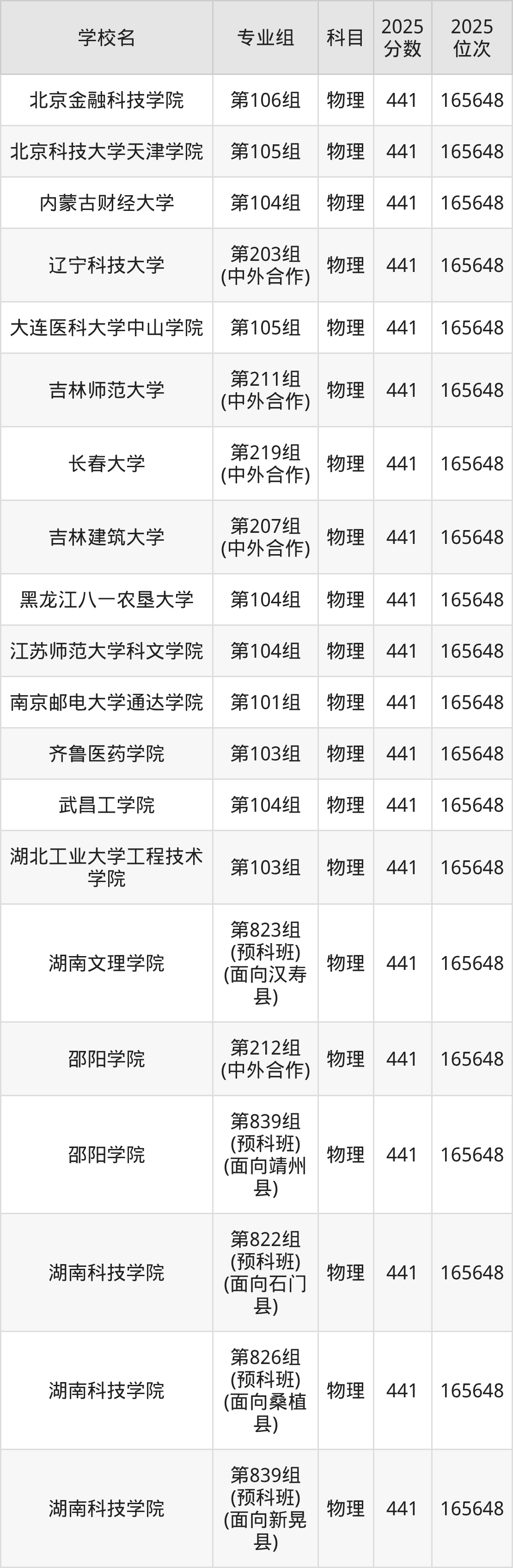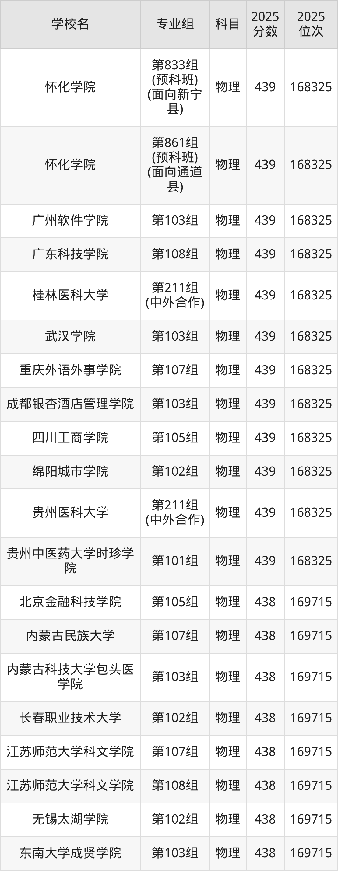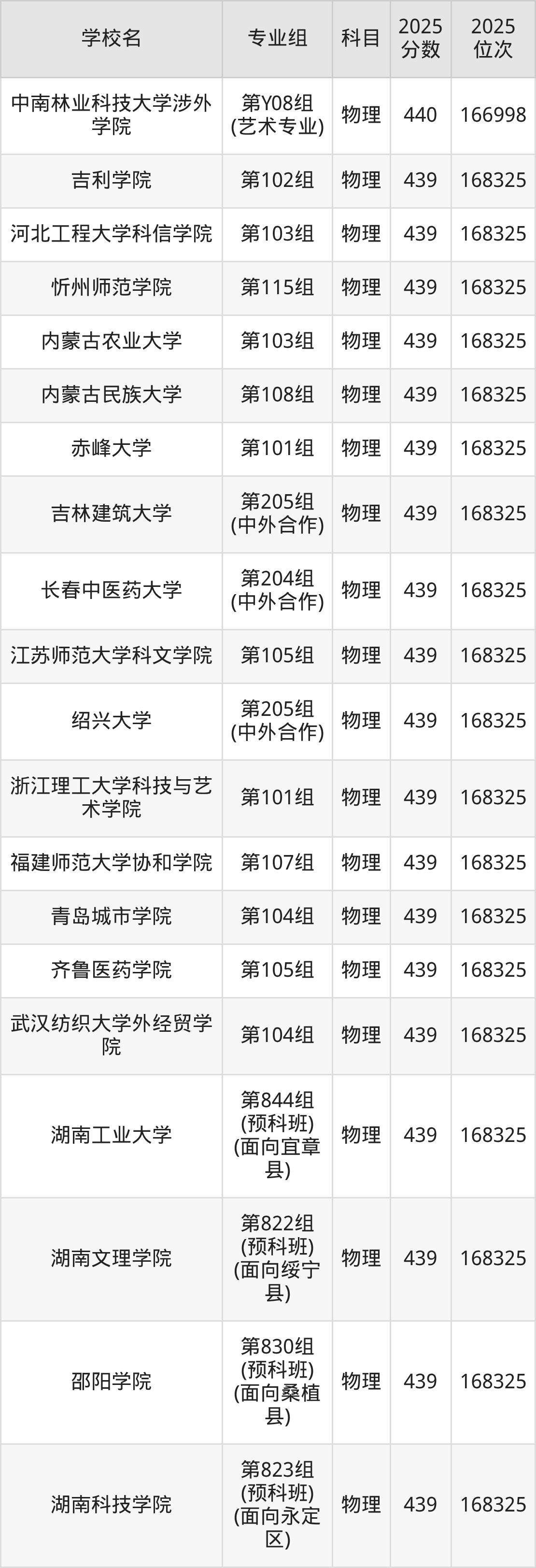 湖南物理类439分对应的位次排名是168325名,因此建议2026年位次排在这附近的考生考虑这些大学。