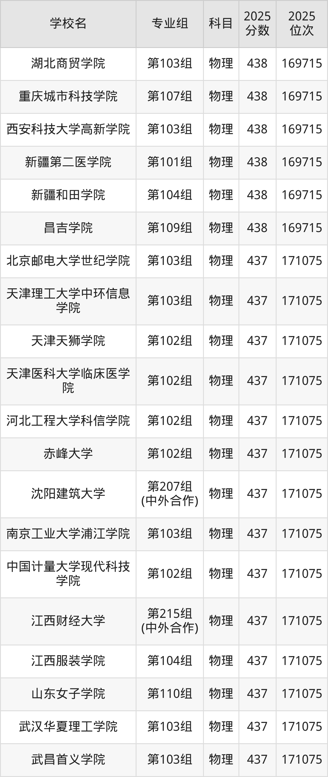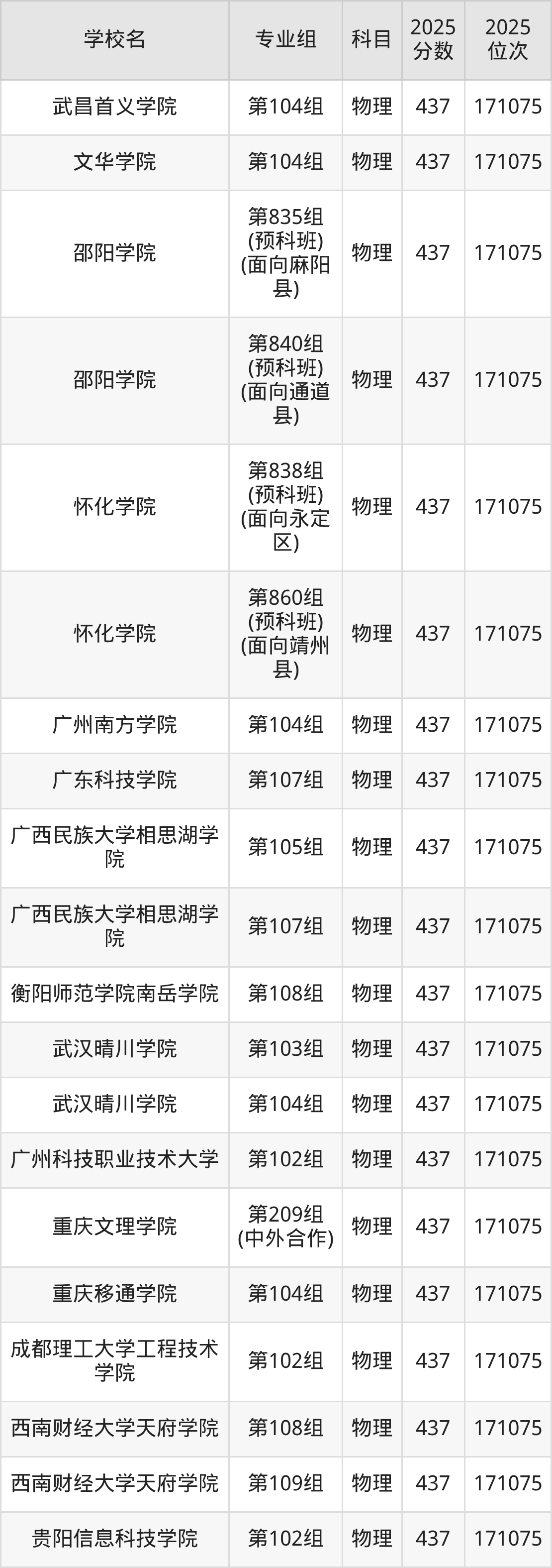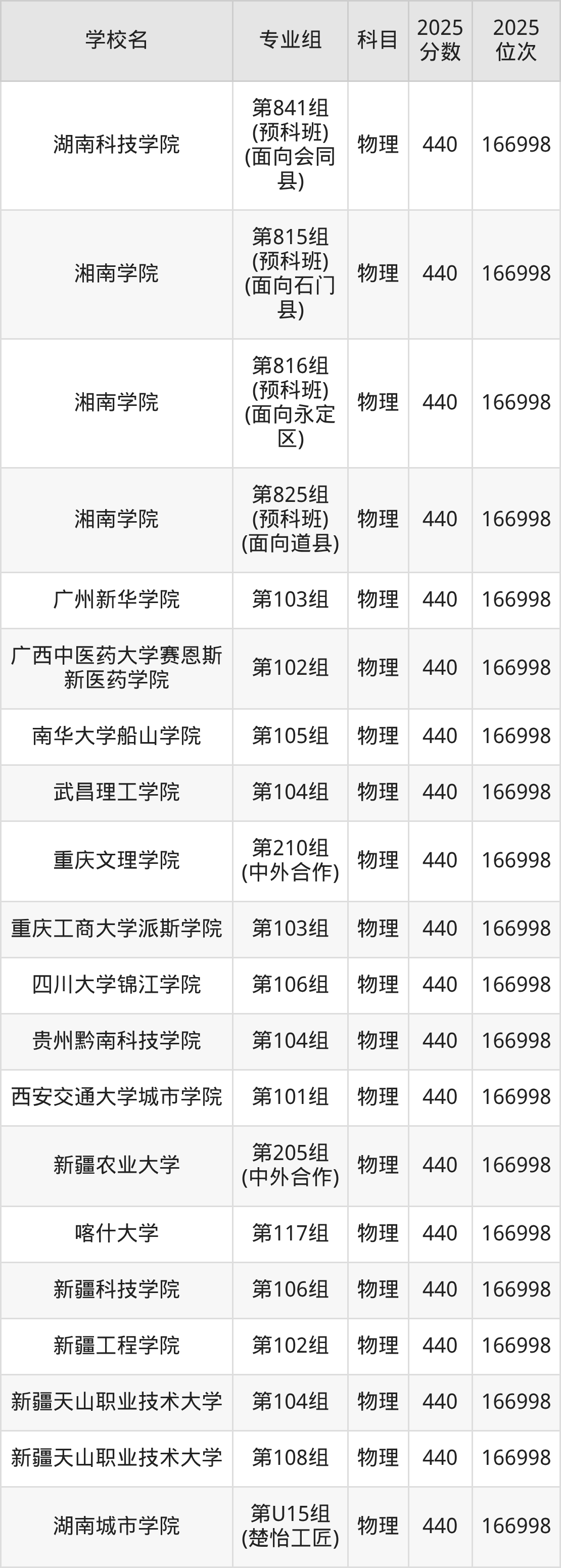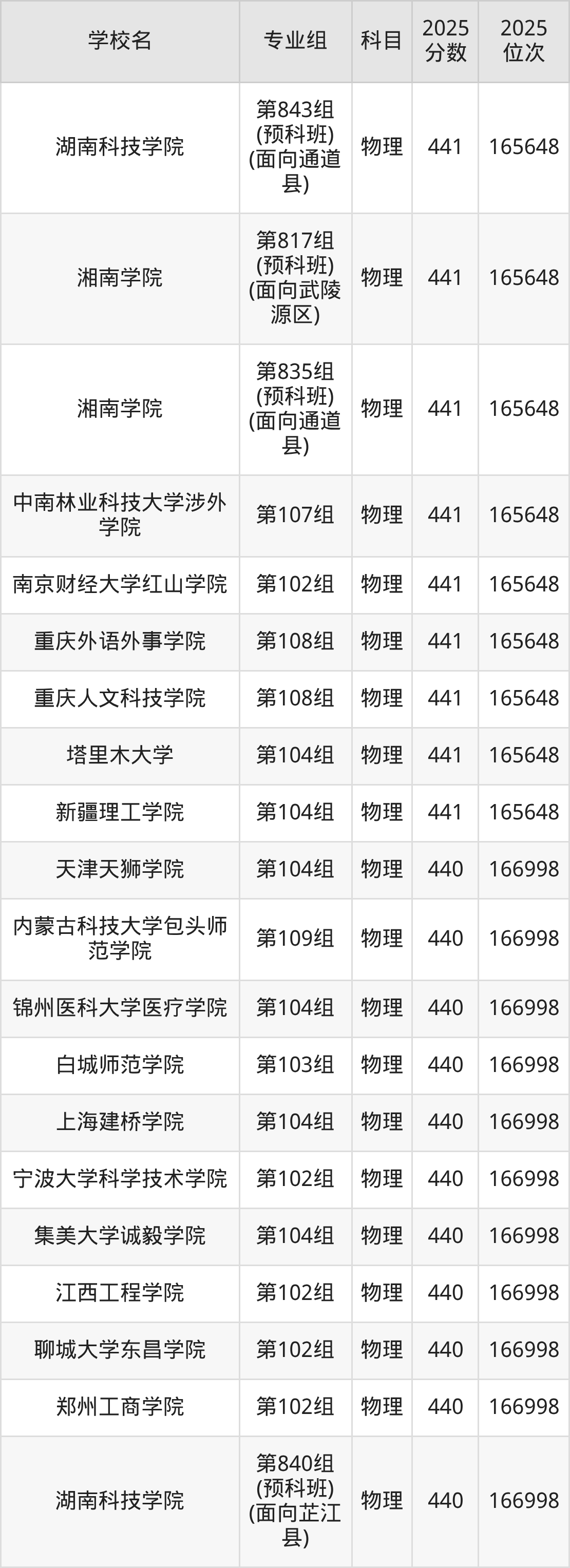 湖南物理类439分对应的位次排名是168325名,因此建议2026年位次排在这附近的考生考虑这些大学。