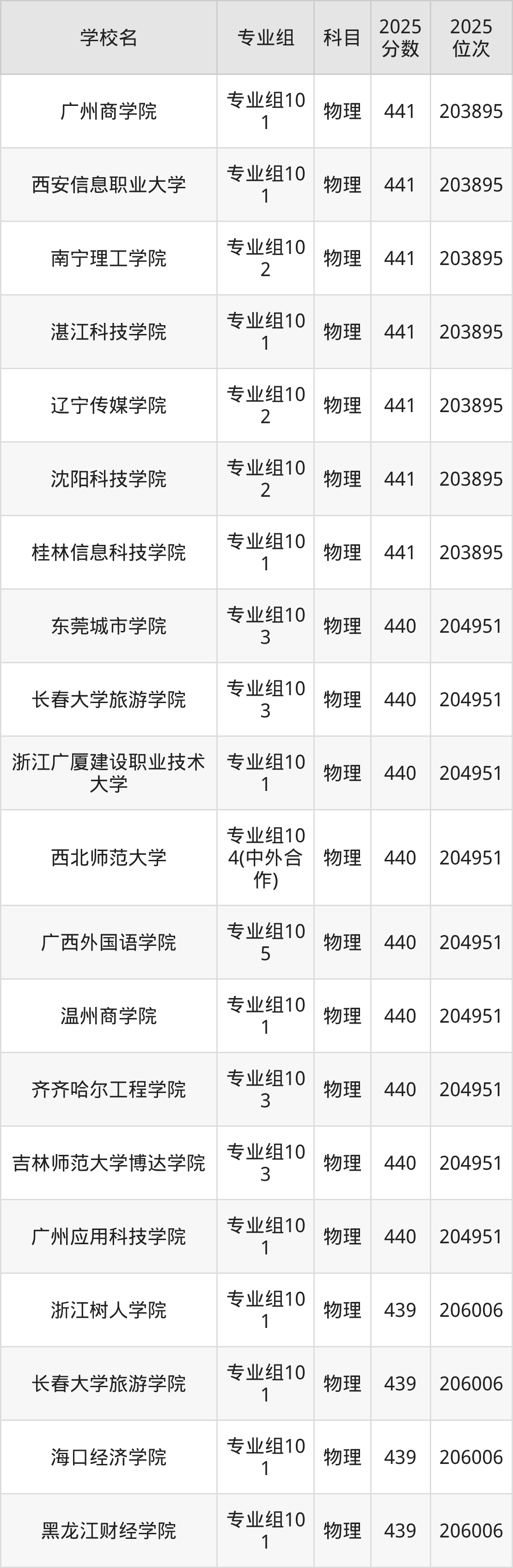 439分可以冲一冲的大学:广州商学院441分、西安信息职业大学441分、南宁理工学院441分、湛江科技学院441分等;