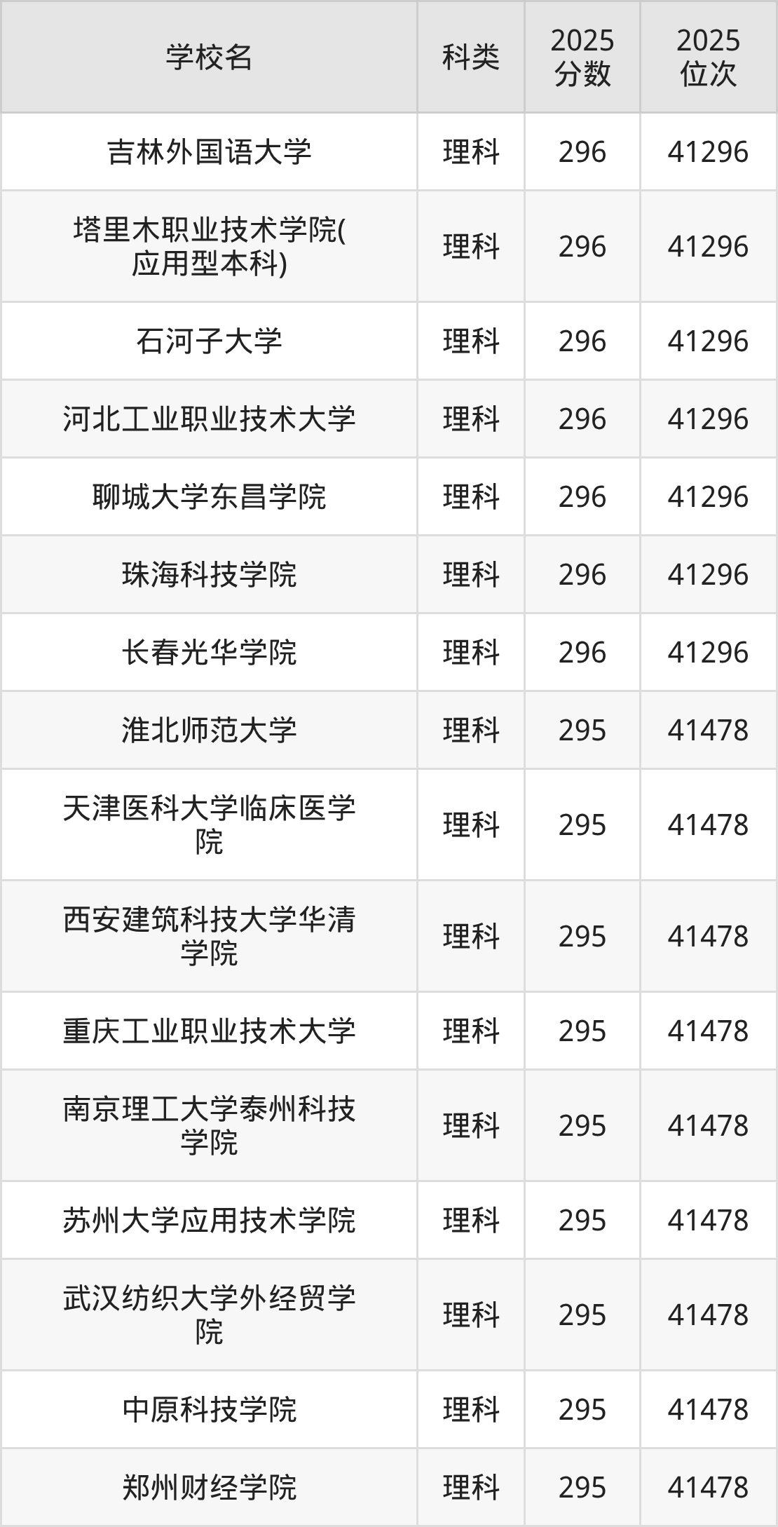 294分可以冲一冲的大学:吉林外国语大学296分、塔里木职业技术学院(应用型本科)296分、石河子大学296分、河北工业职业技术大学296分等;