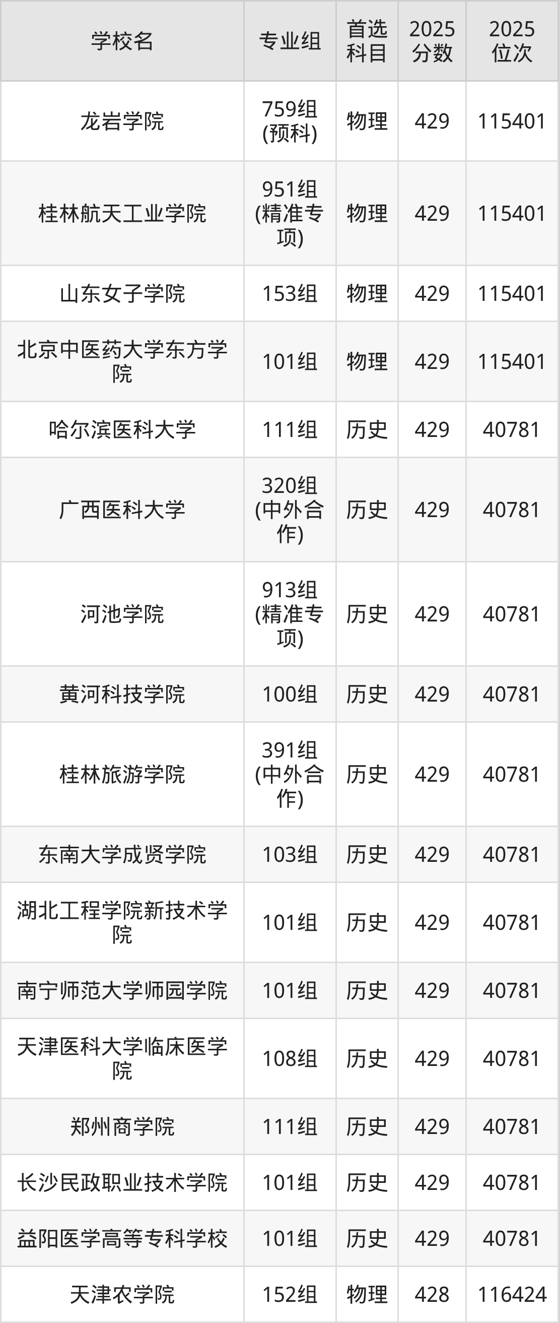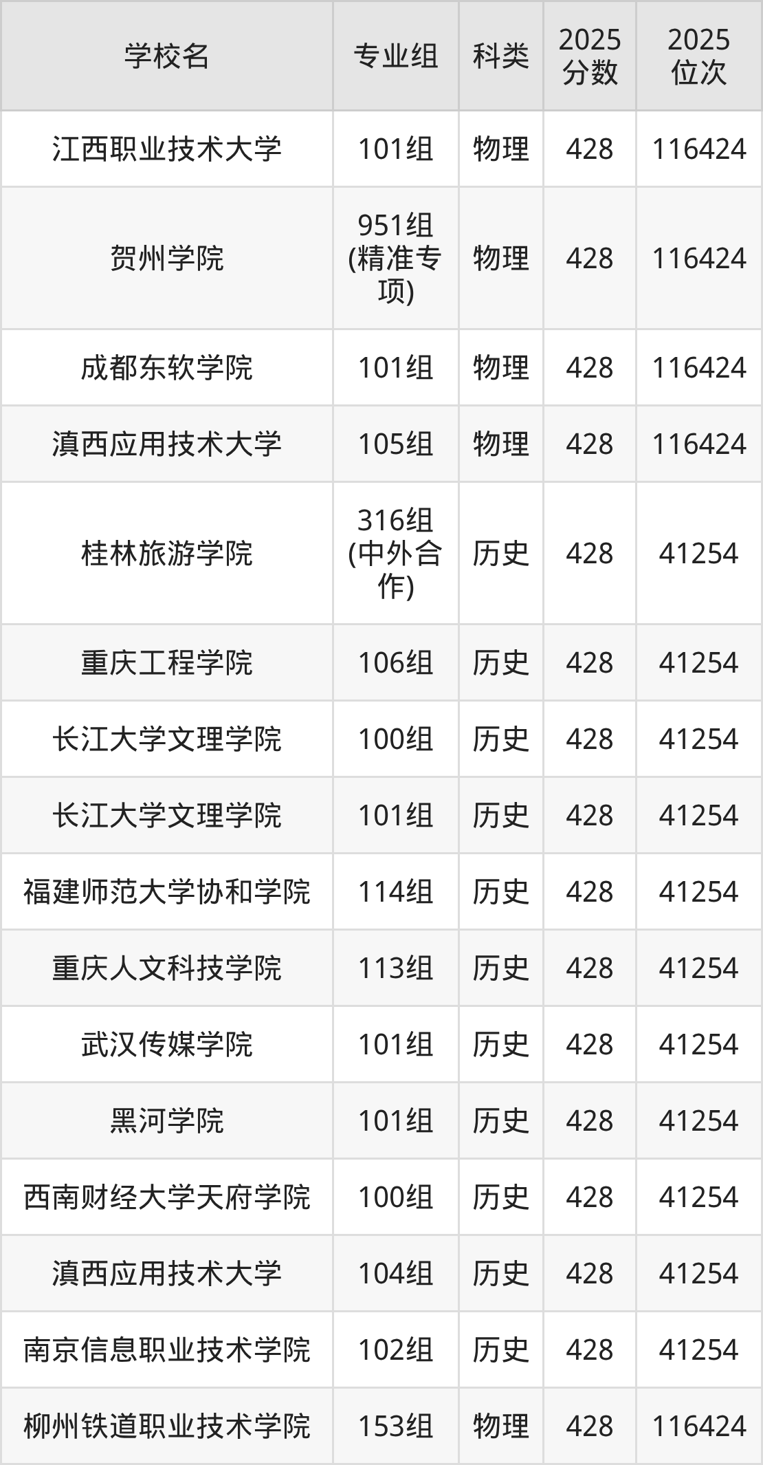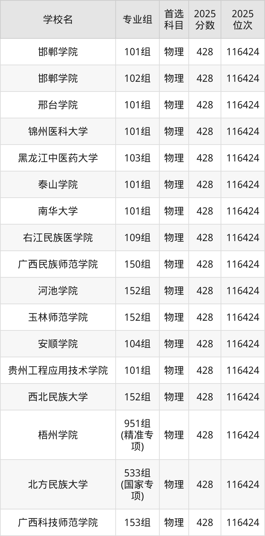 广西高考物理类430分对应的位次排名是114422名,历史类430分对应的位次排名是40358名,因此建议2026年位次排在这附近的同学考虑这些大学。