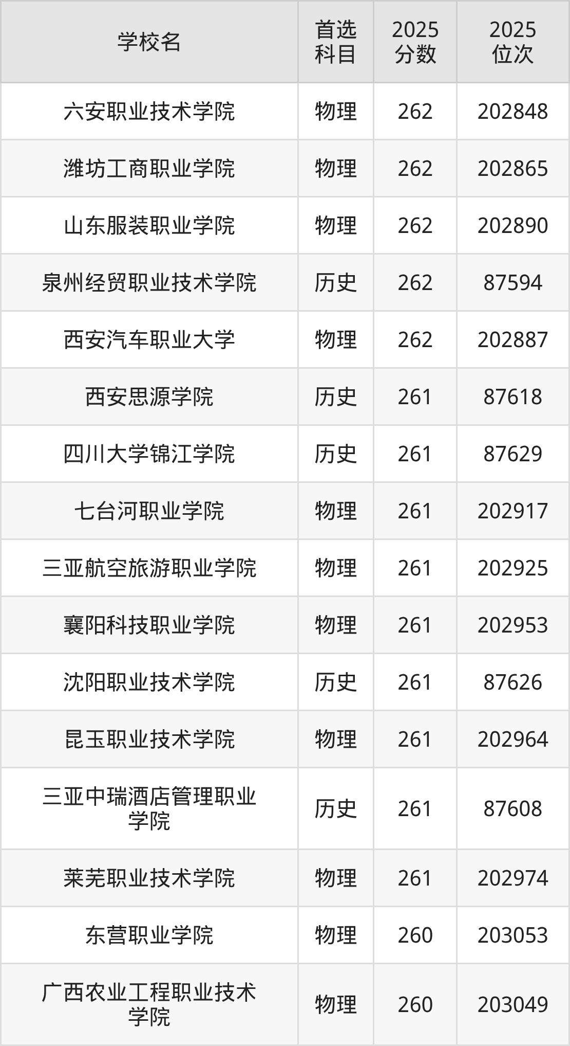 贵州高考物理类260分对应的位次排名是202989名-203053名,历史类260分对应的位次排名是87635名-87641名,因此建议2026年位次排在这附近的同学考虑这些大学。