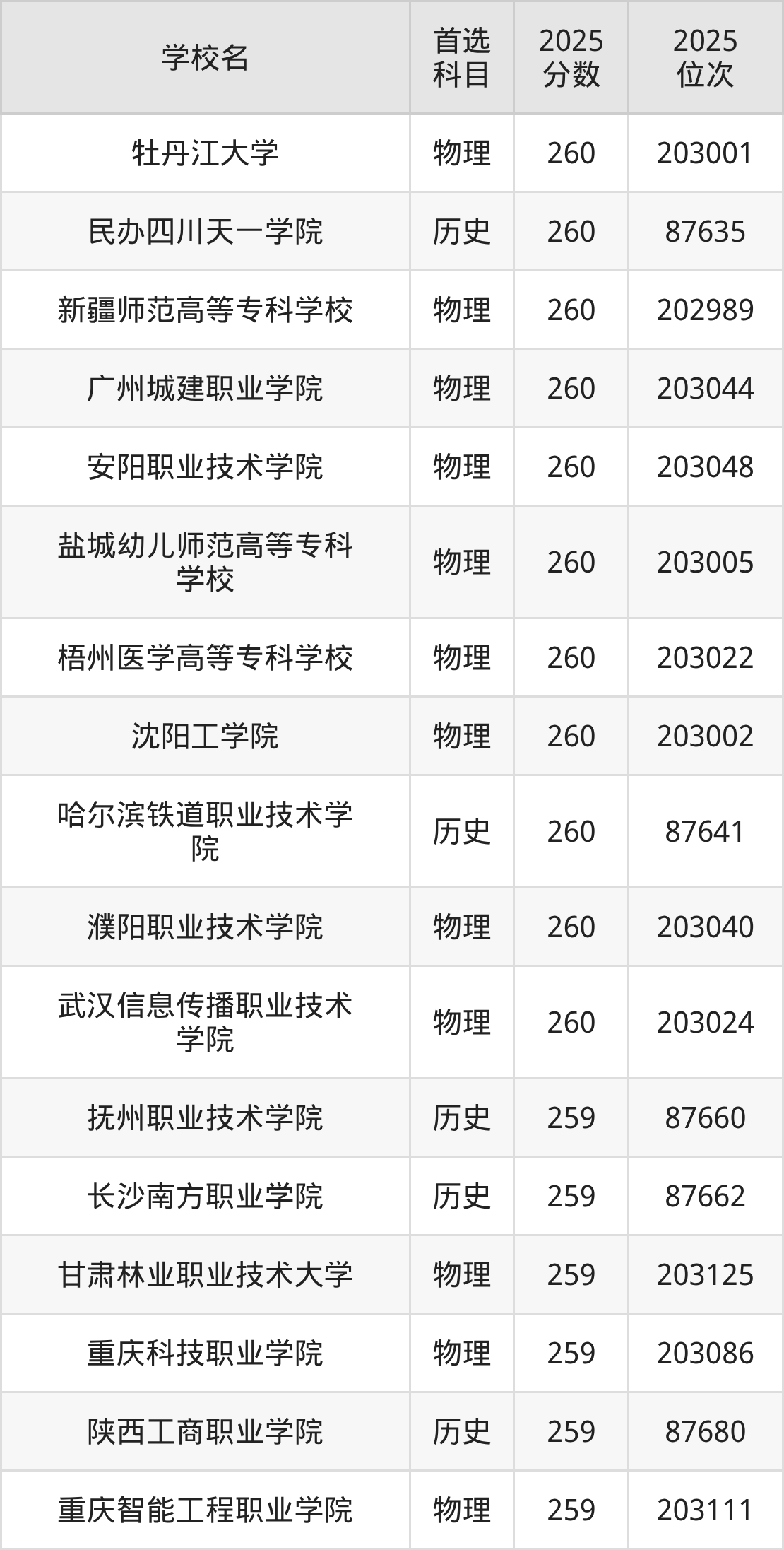 2025年在贵州高考物理类录取分数线是260分的大学有东营职业学院、广西农业工程职业技术学院、牡丹江大学、新疆师范高等专科学校、广州城建职业学院、安阳职业技术学院、盐城幼儿师范高等专科学校、梧州医学高等专科学校、沈阳工学院、濮阳职业技术学院等。历史类录取分数线是260分的大学有民办四川天一学院、哈尔滨铁道职业技术学院。
