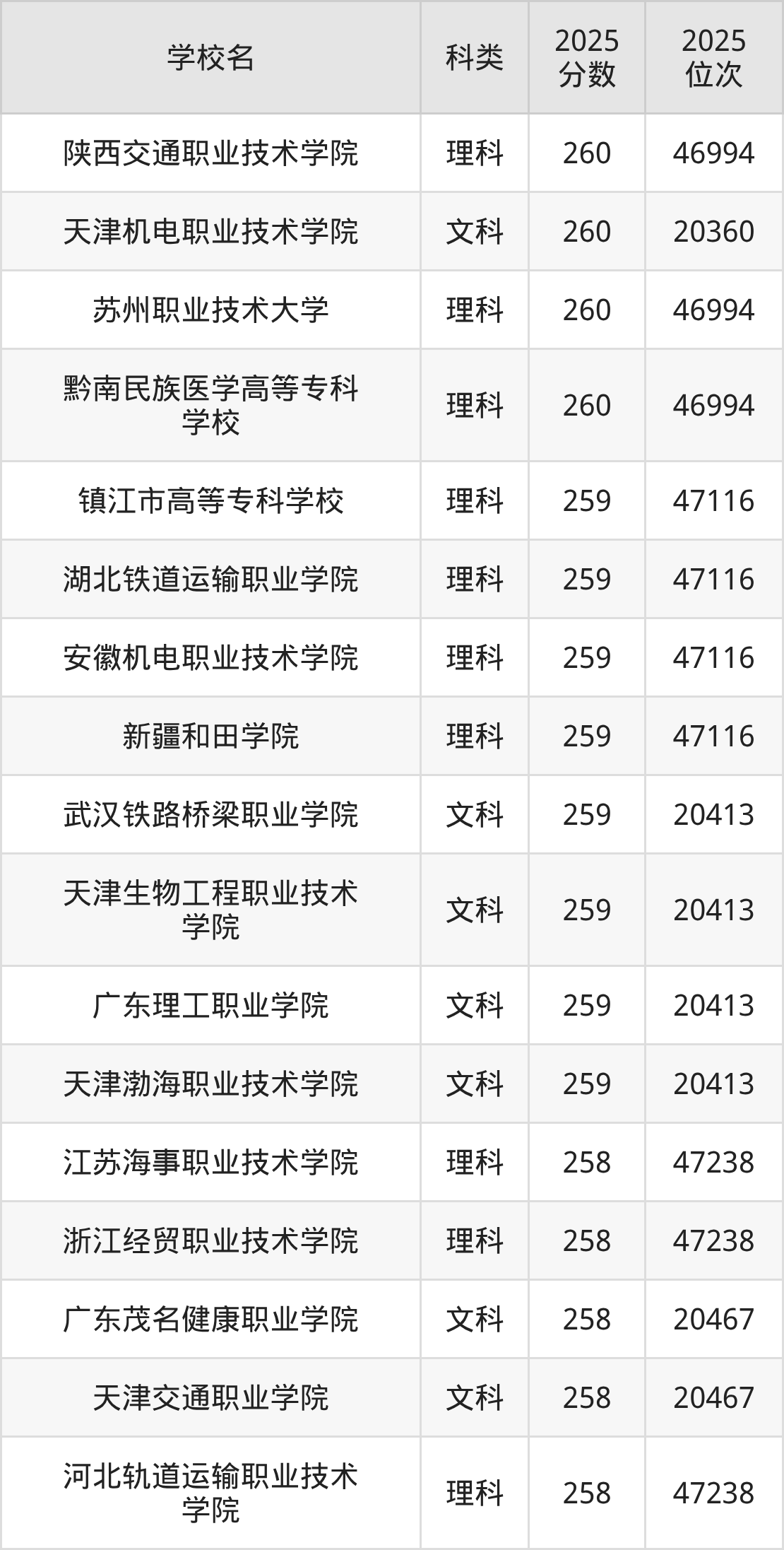 2025年在新疆高考文科录取分数线是260分的大学有武汉航海职业技术学院、天津机电职业技术学院。理科录取分数线是260分的大学有山东畜牧兽医职业学院、陕西交通职业技术学院、苏州职业技术大学、黔南民族医学高等专科学校。