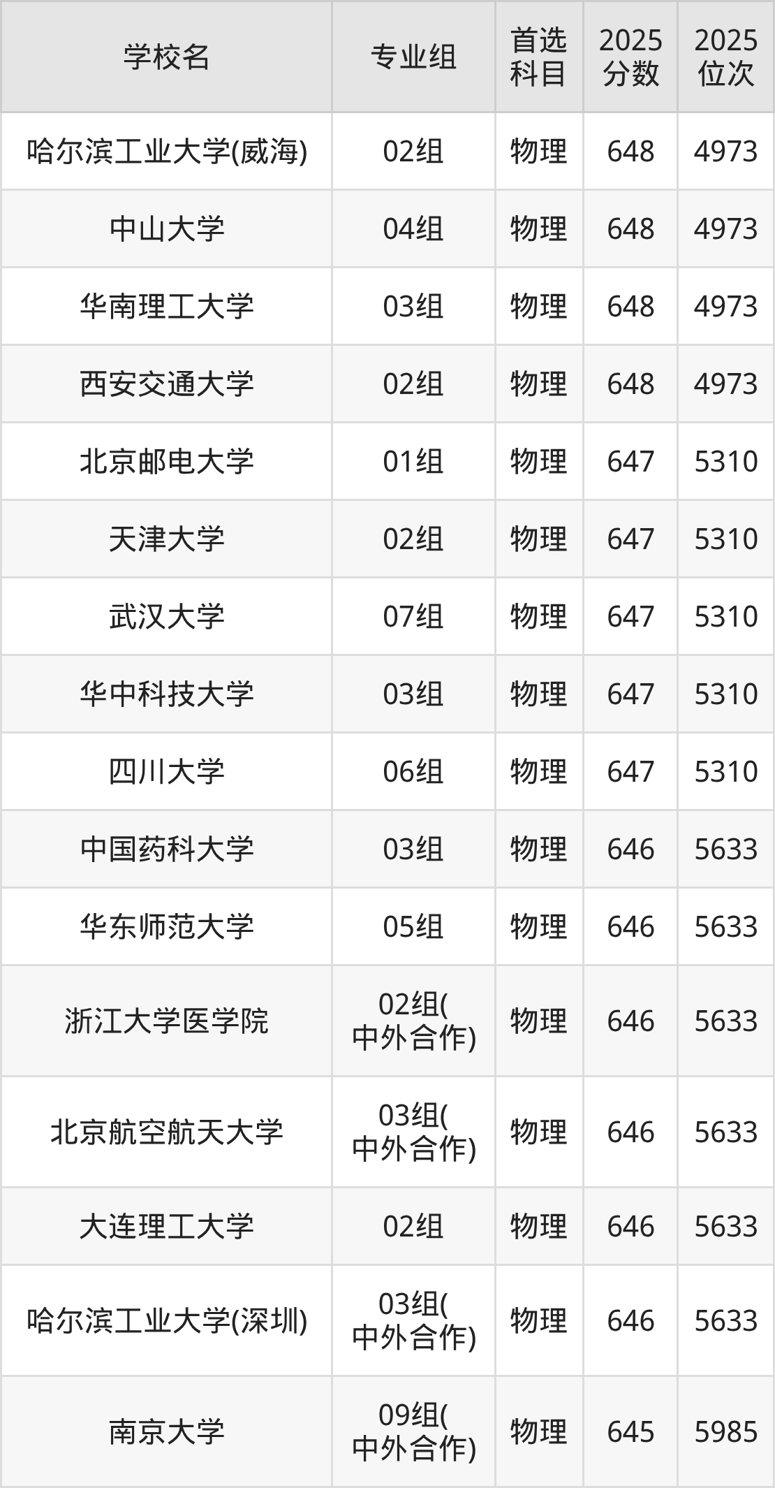 江苏物理类646分对应的位次排名是5633名,因此建议2026年位次排在这附近的考生考虑这些大学。