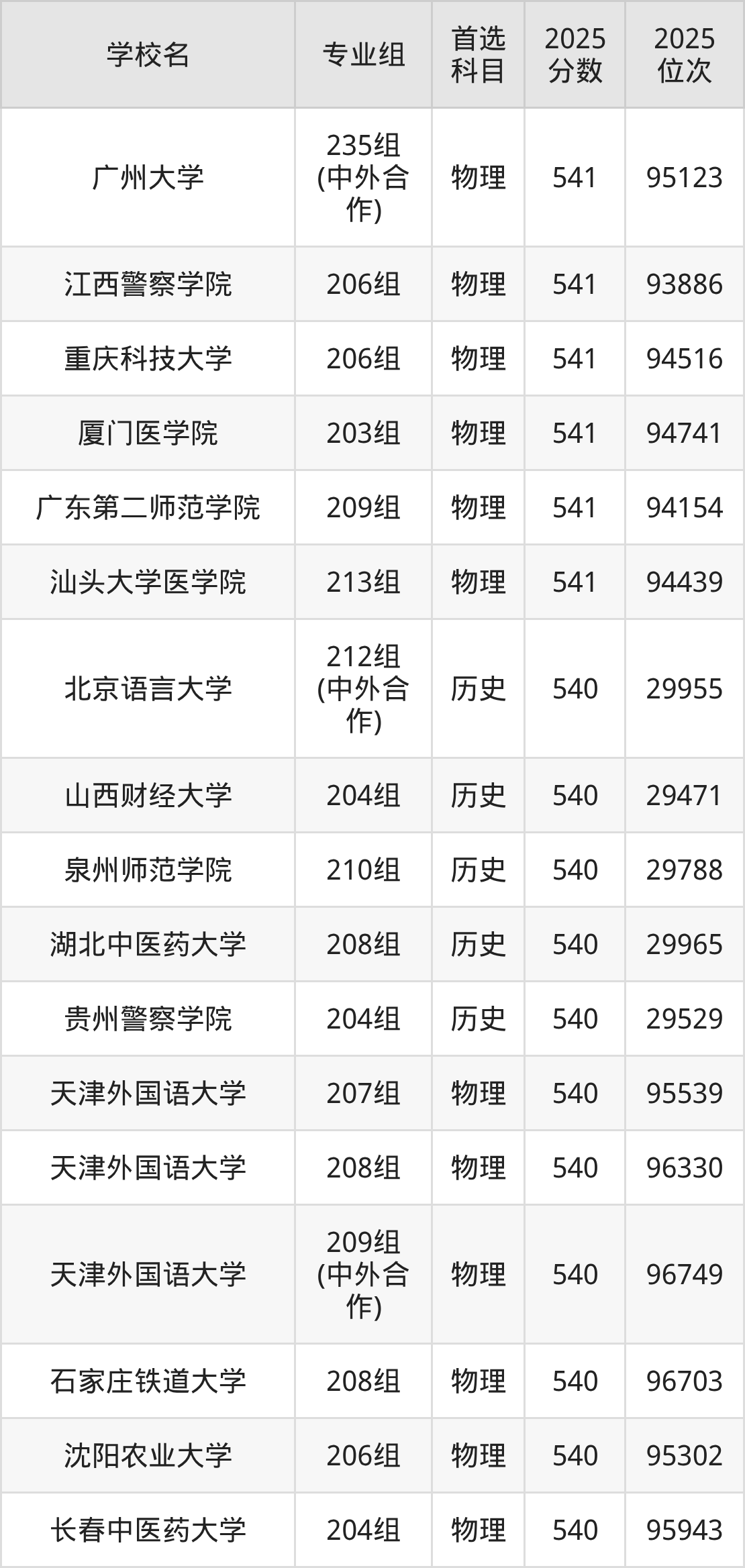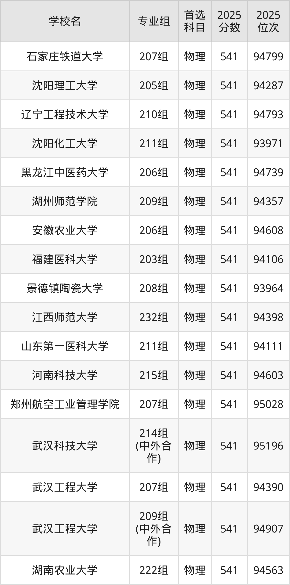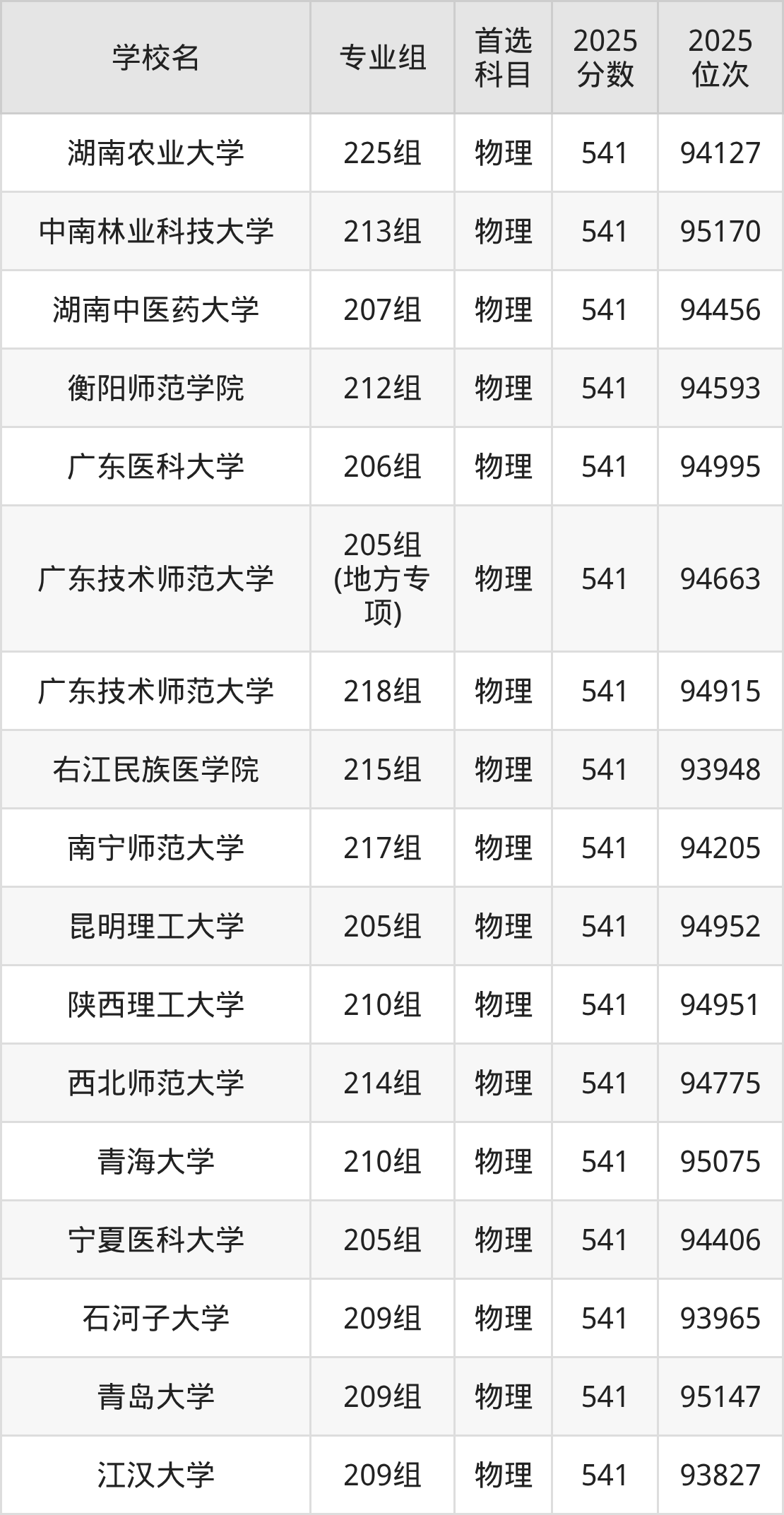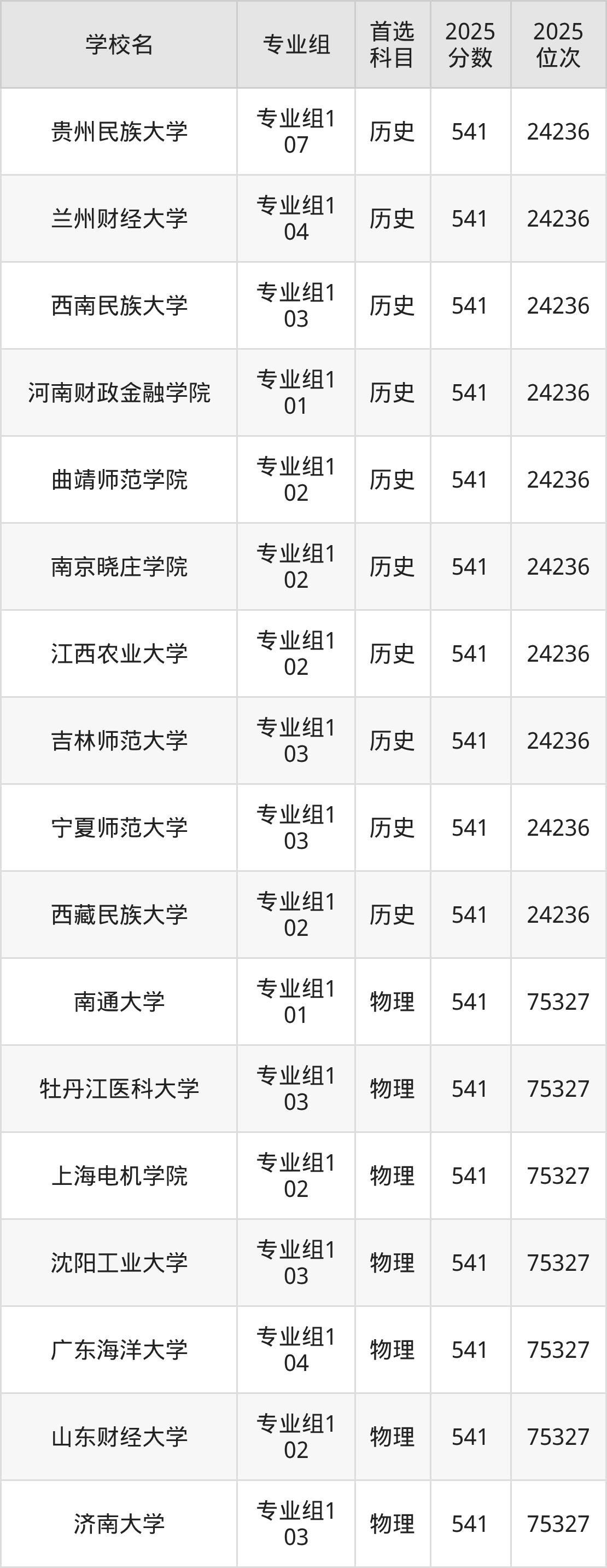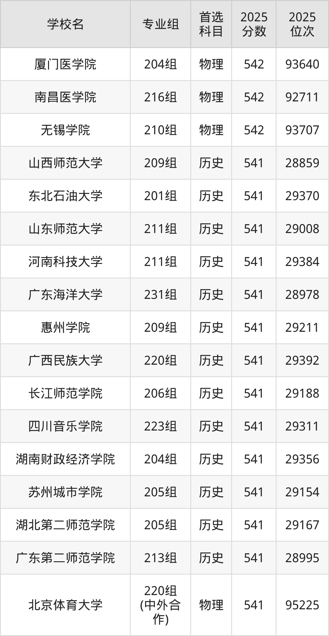 广东高考历史类541分对应的位次排名是28859名-29392名,物理类541分对应的位次排名是93827名-95225名,因此建议2026年位次排在这附近的同学考虑这些大学。