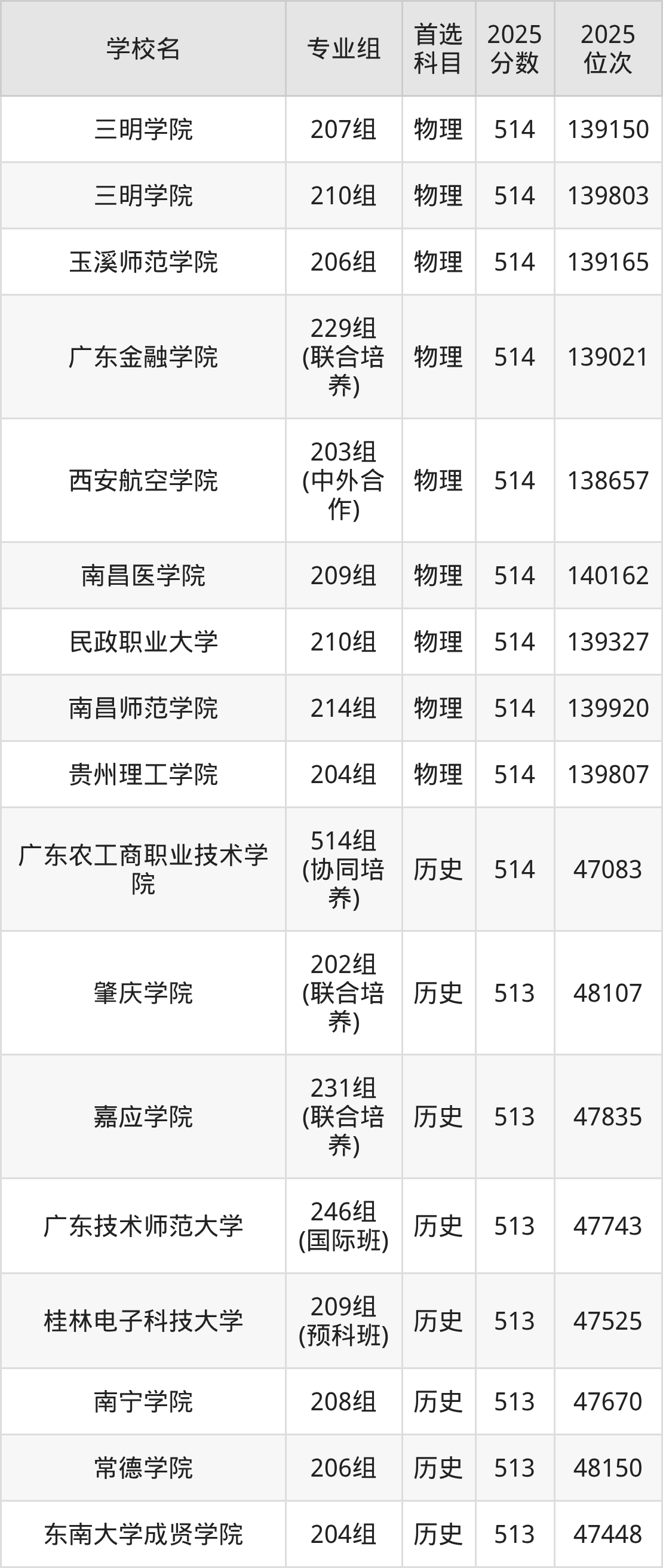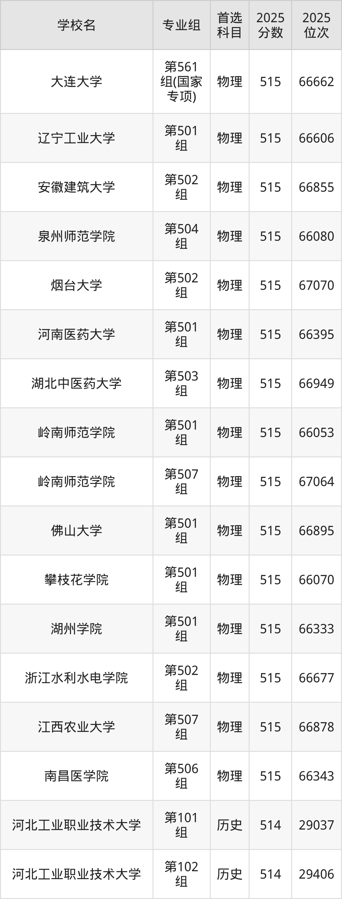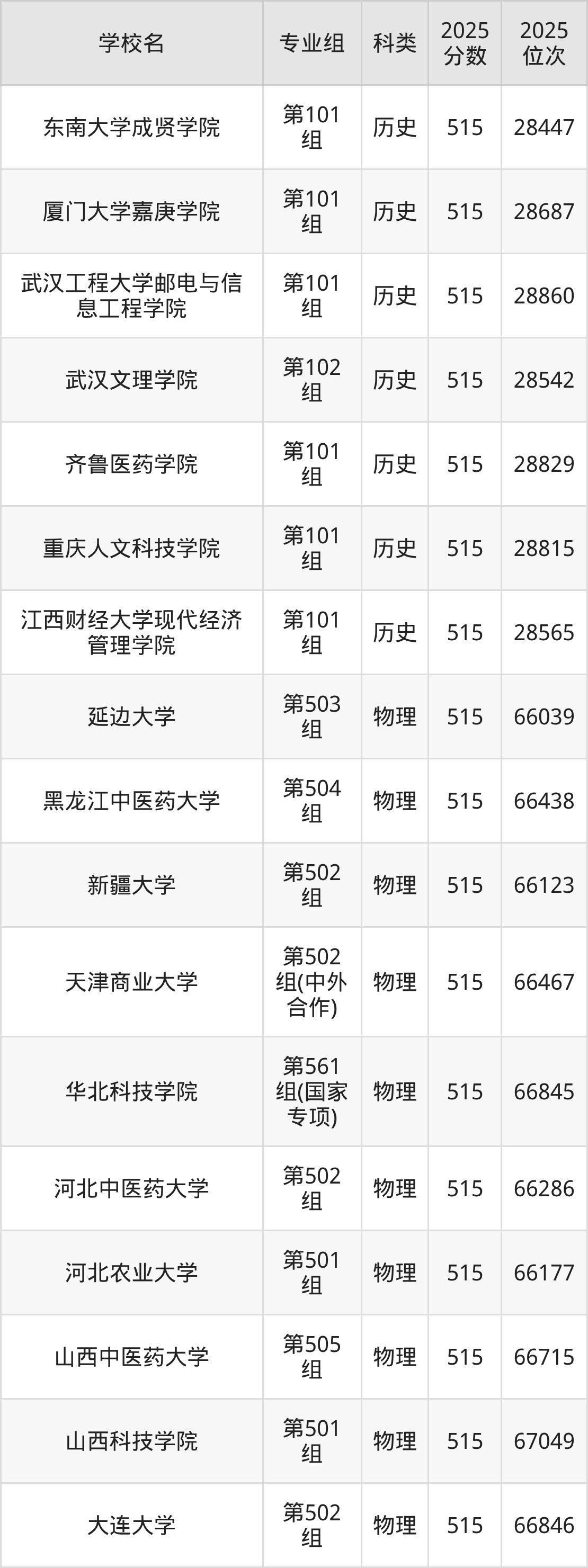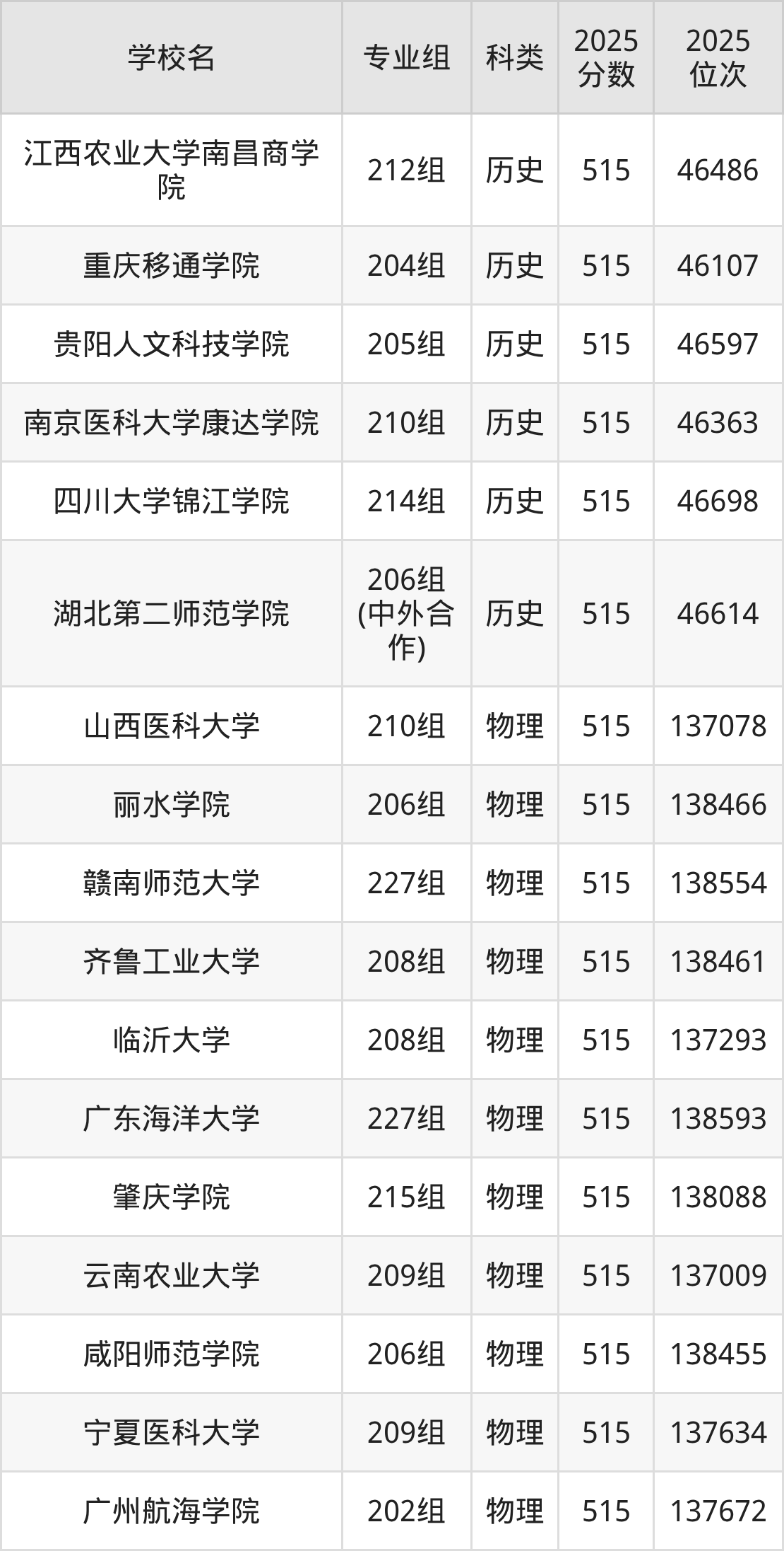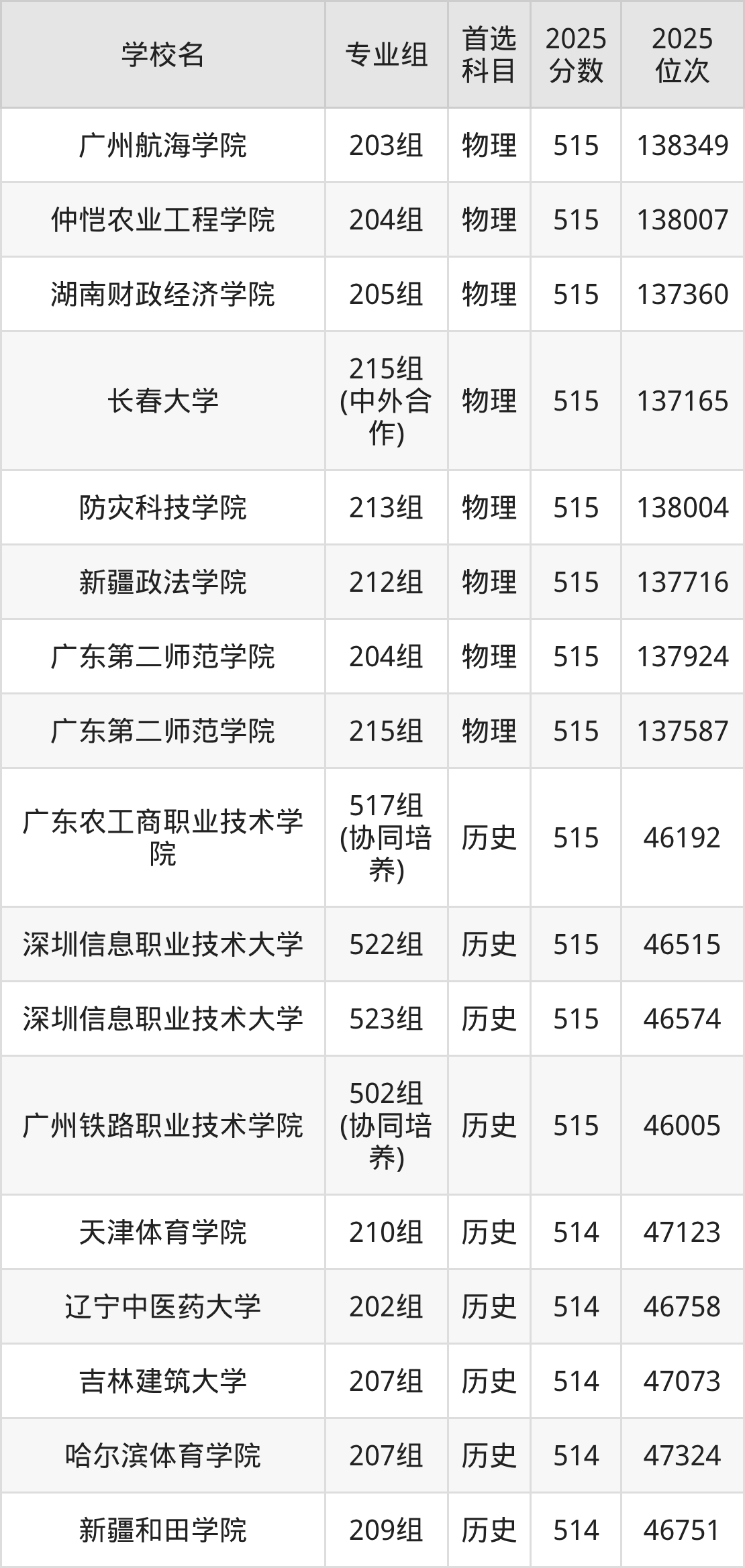 广东高考历史类515分对应的位次排名是46005名-46706名,物理类515分对应的位次排名是137009名-138593名,因此建议2026年位次排在这附近的同学考虑这些大学。