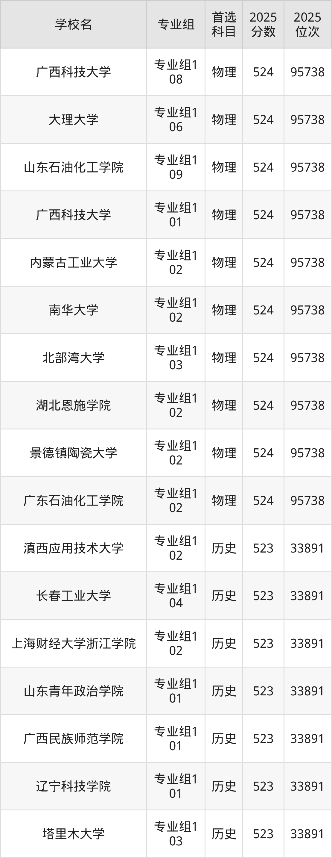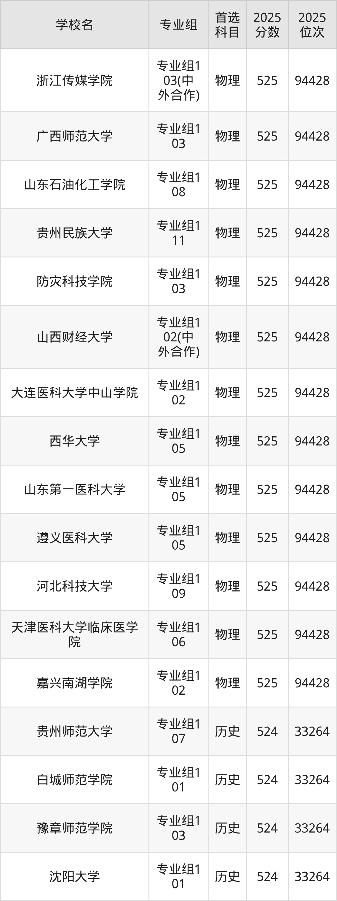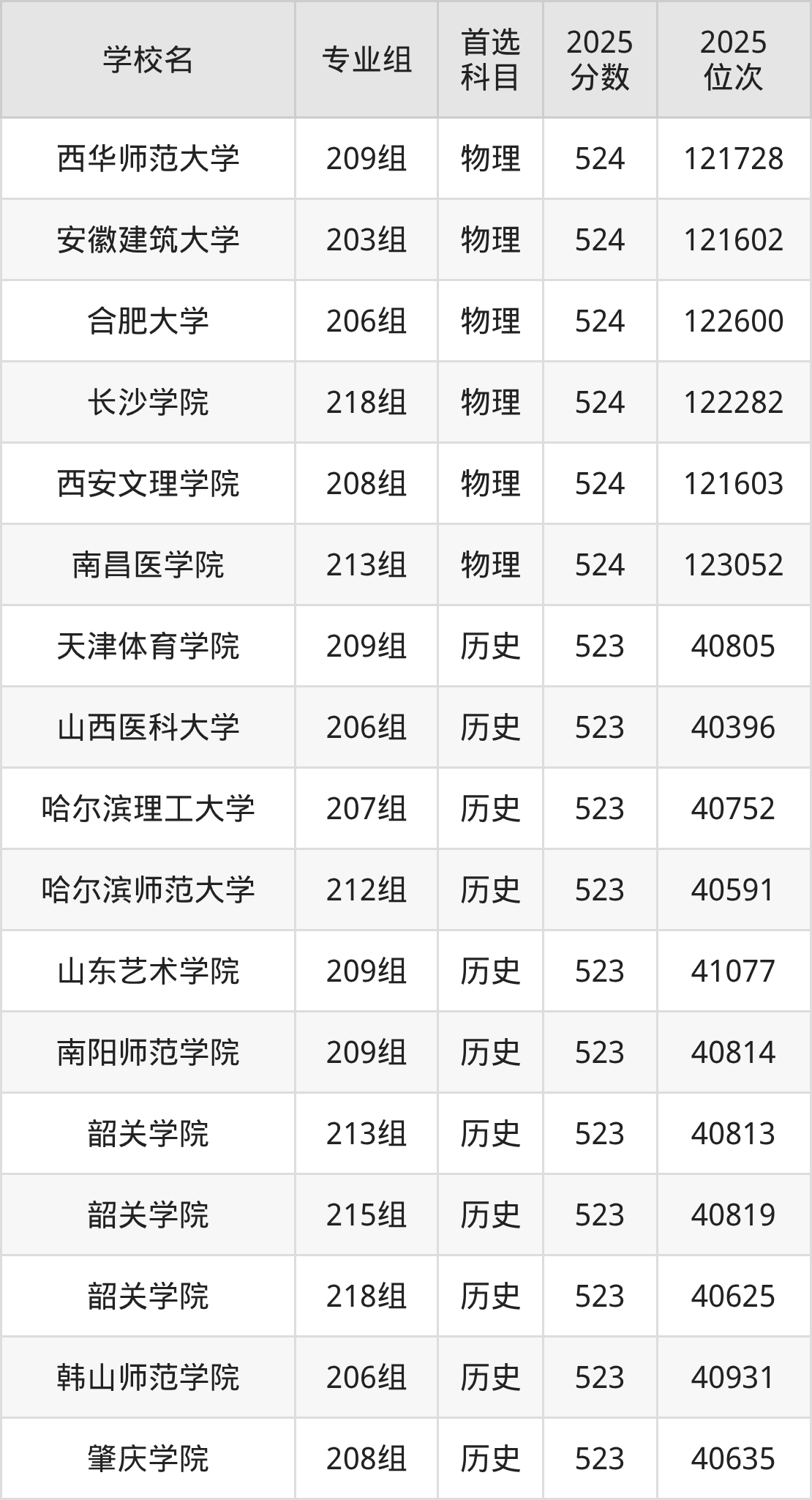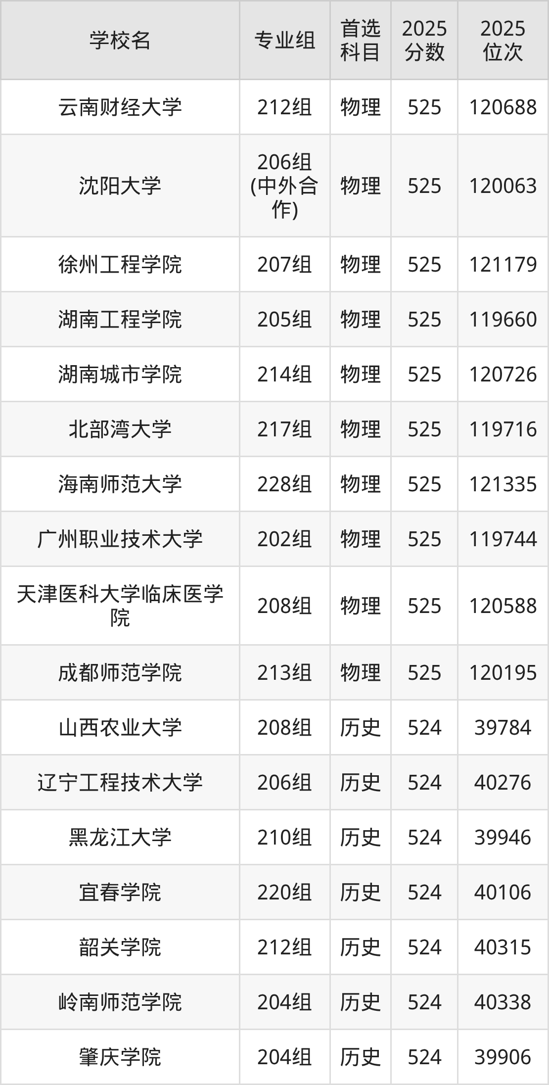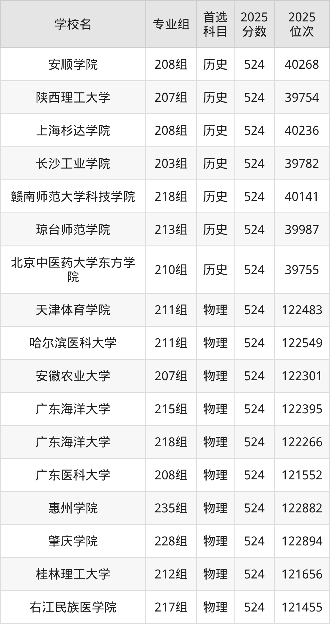 广东高考历史类524分对应的位次排名是39754名-40338名,物理类524分对应的位次排名是121455名-123052名,因此建议2026年位次排在这附近的同学考虑这些大学。