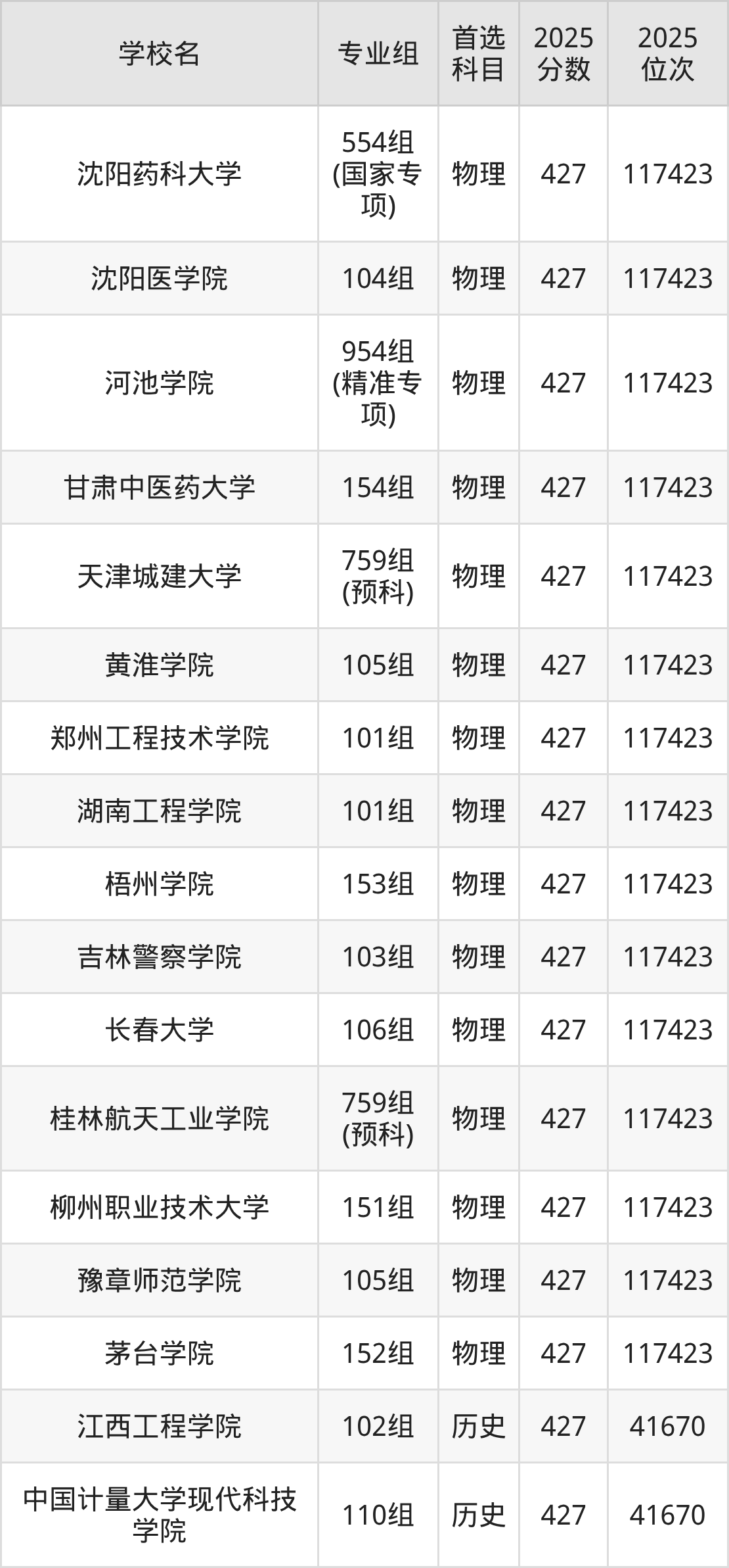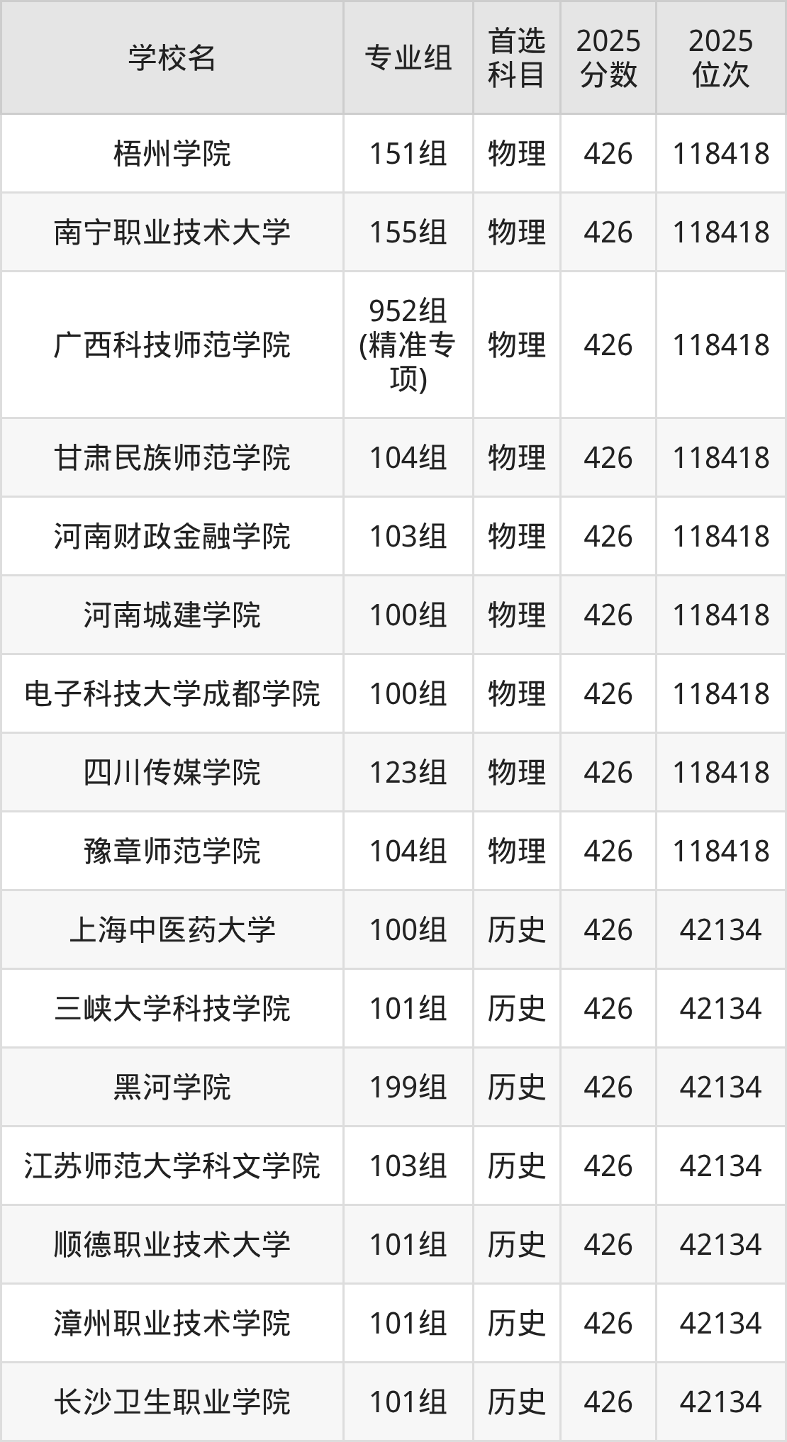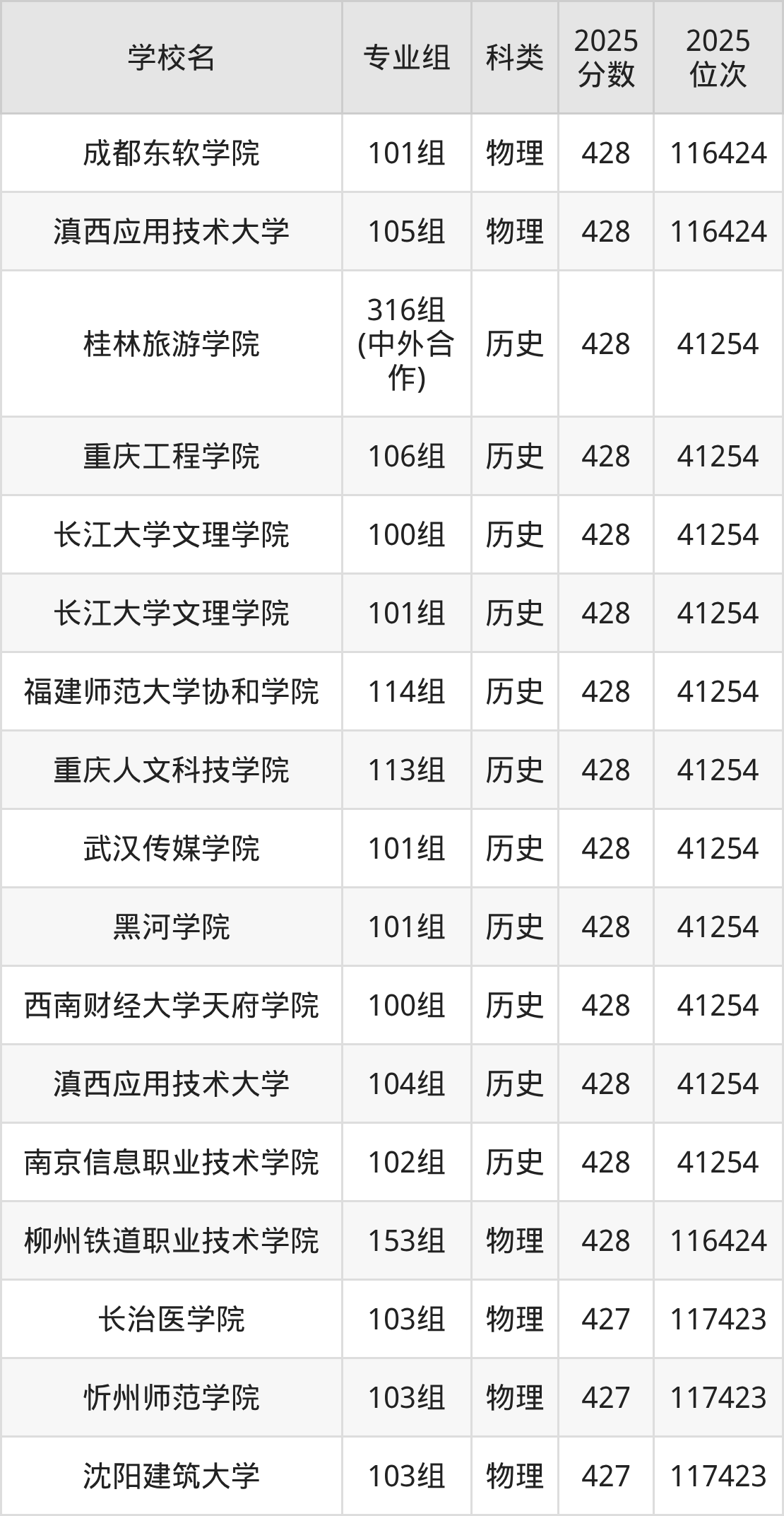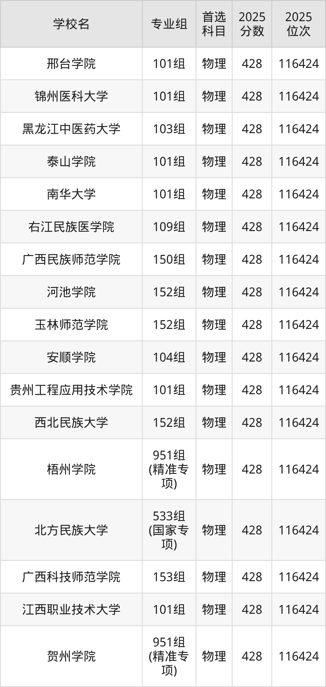 广西高考物理类428分对应的位次排名是116424名,历史类428分对应的位次排名是41254名,因此建议2026年位次排在这附近的同学考虑这些大学。