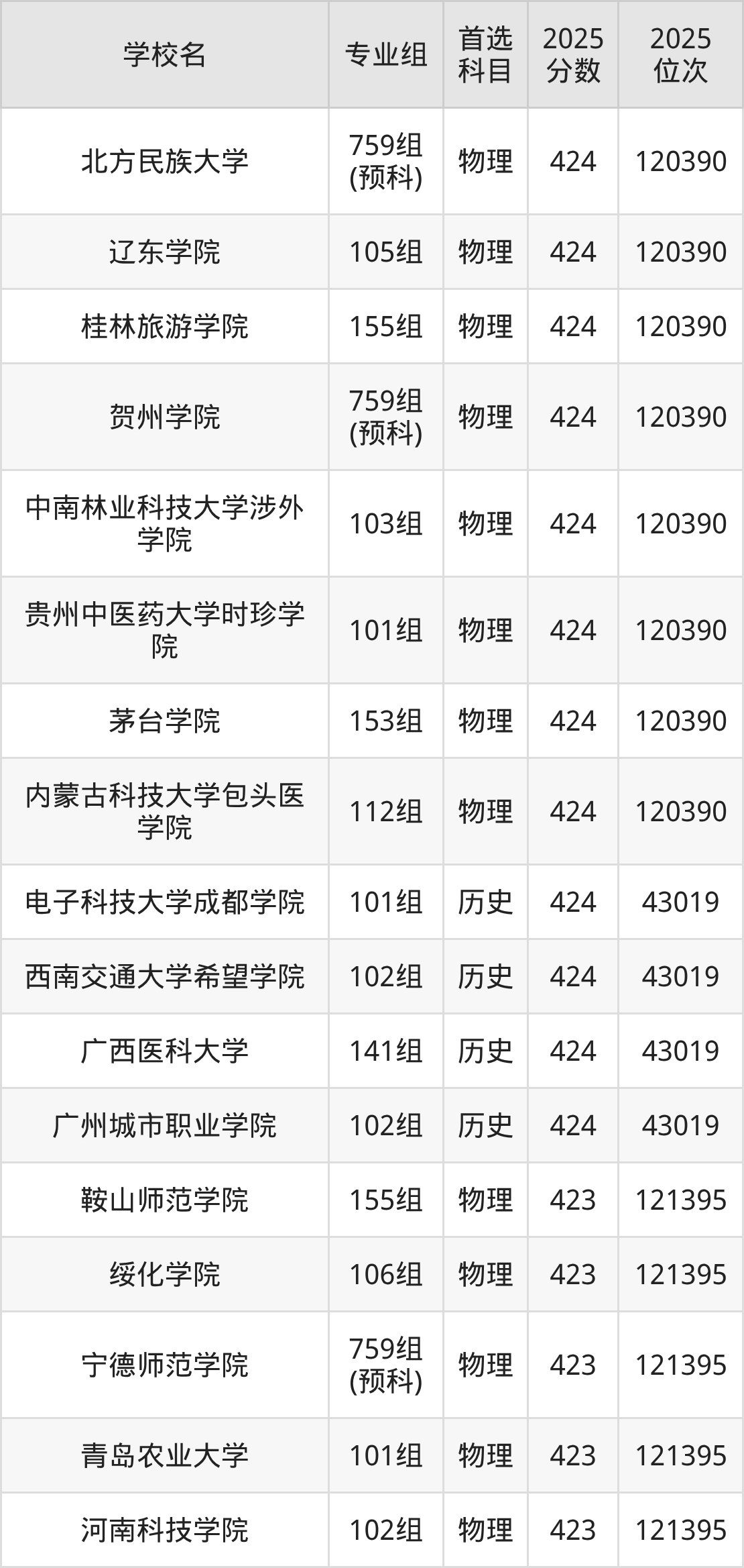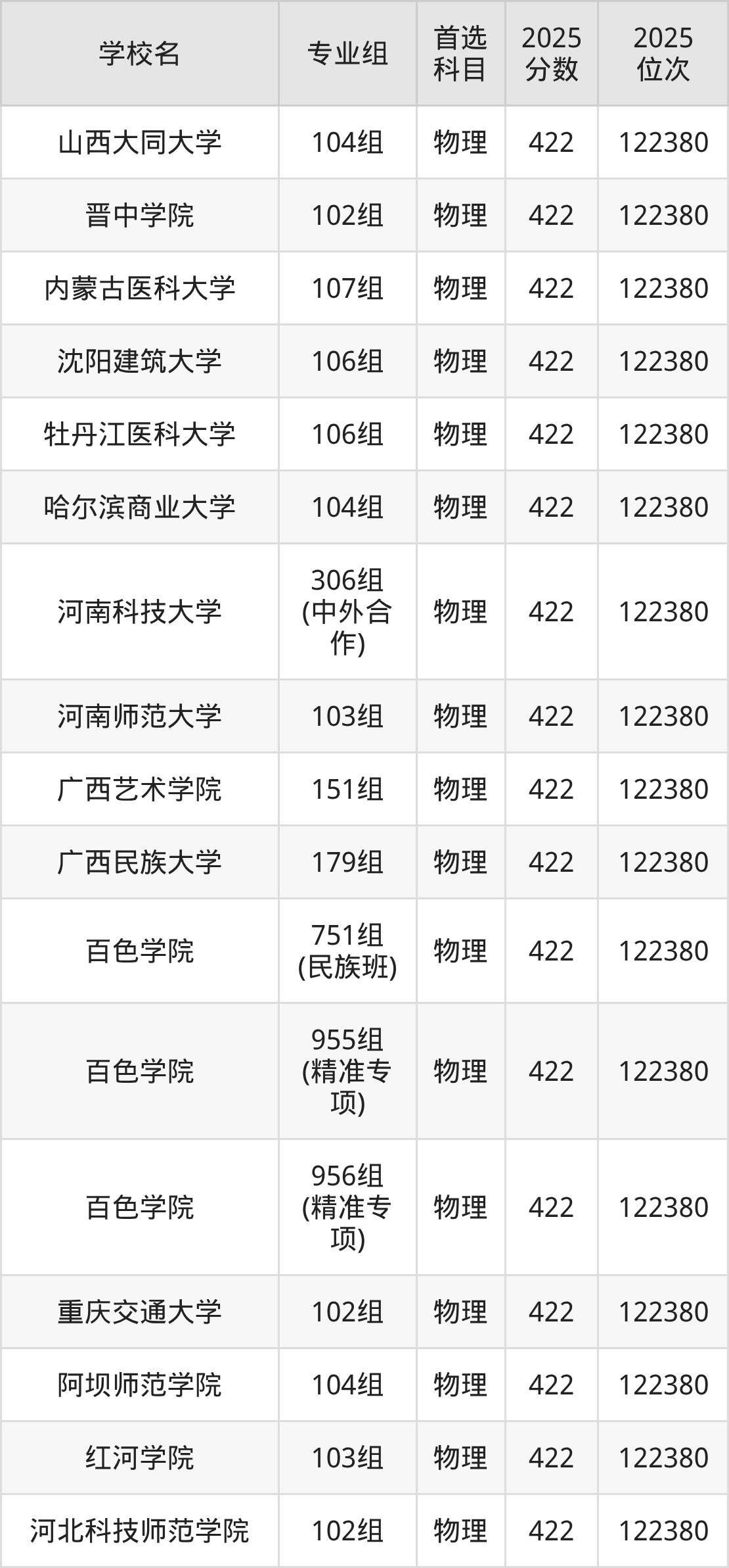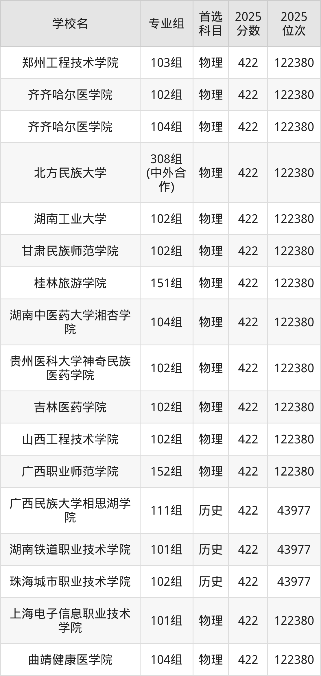 广西高考物理类422分对应的位次排名是122380名,历史类422分对应的位次排名是43977名,因此建议2026年位次排在这附近的同学考虑这些大学。