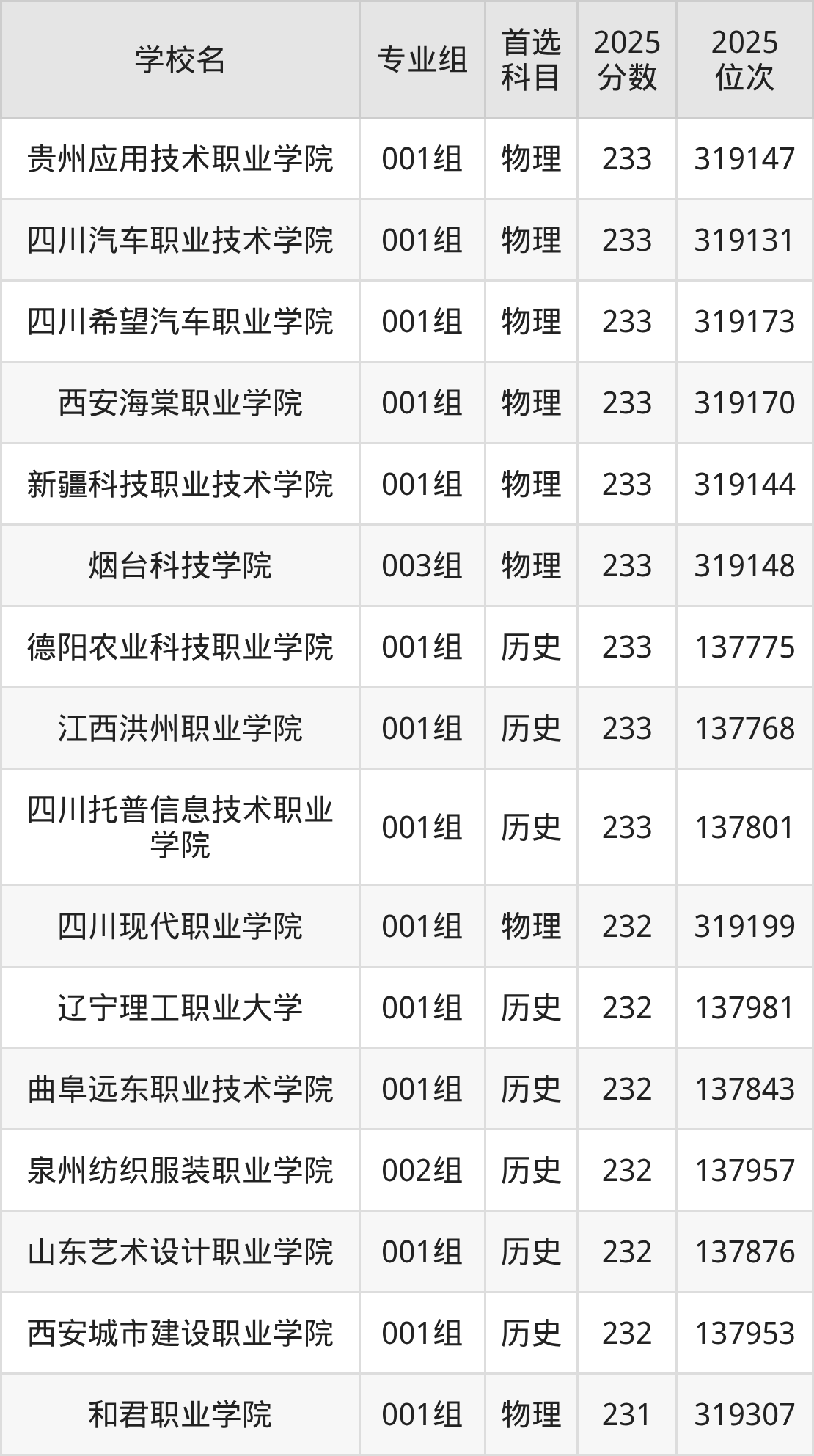 物理类231分可以冲的大学:贵州应用技术职业学院233分、四川汽车职业技术学院233分、四川希望汽车职业学院233分、西安海棠职业学院233分等;较稳妥的大学:山东外国语职业技术大学230分、无锡南洋职业技术学院230分、广东岭南职业技术学院229分、江海职业技术学院229分等。