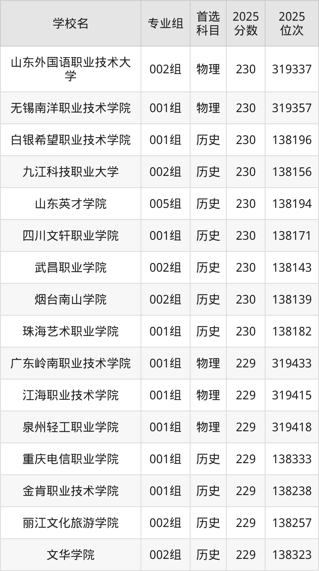 下面老师将以上文整理的其中两个省份为例,为大家具体展示231分左右能上的专科大学名单。