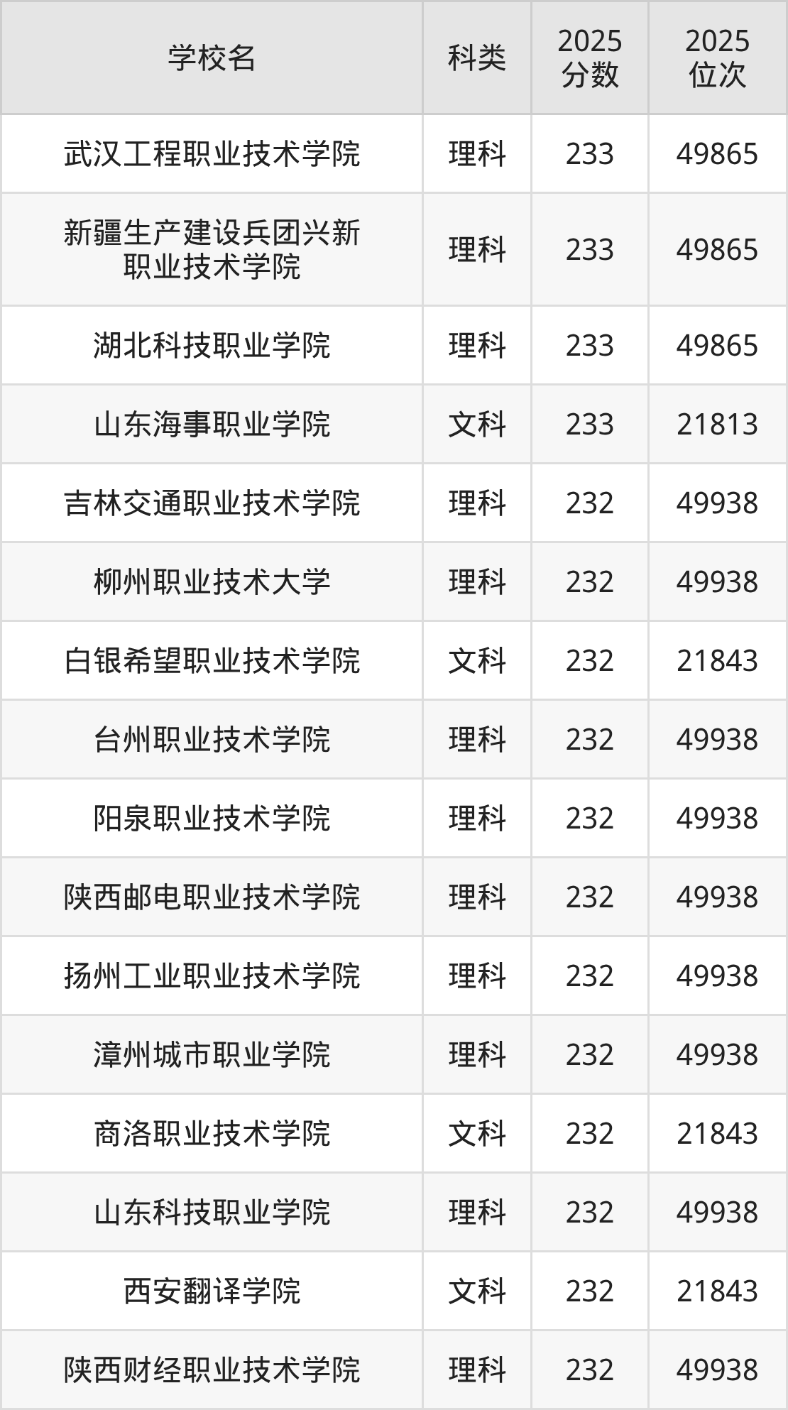2025年在新疆高考文科录取分数线是231分的大学有南充文化旅游职业学院、乌鲁木齐职业技术学院、大庆职业学院、永州职业技术学院。理科录取分数线是231分的大学有漯河职业技术学院。