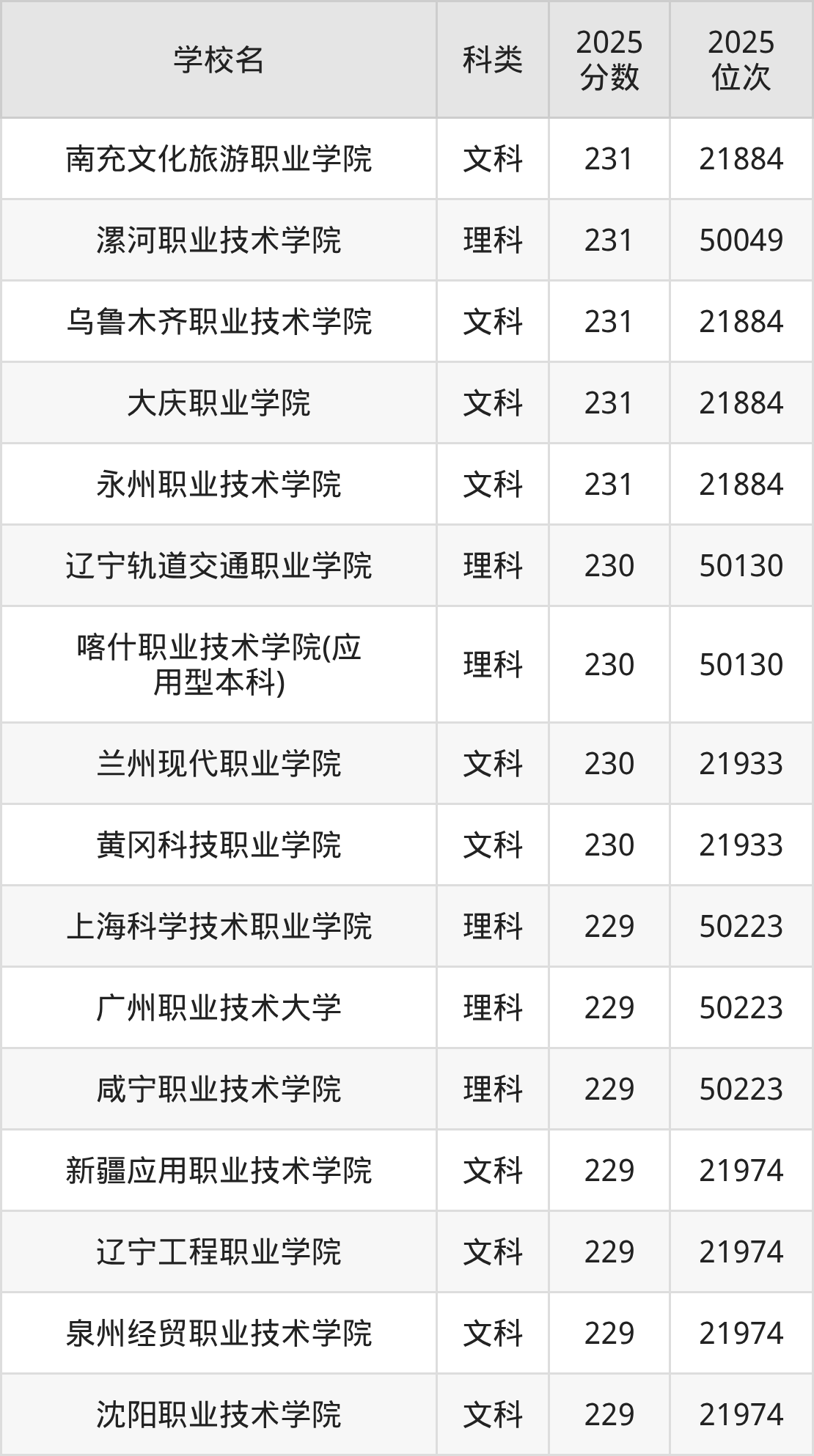 从2025年划定的批次线来看,231分在以下地区可以上专科大学,2025年专科线不超过231分的地区有22个,具体如下: