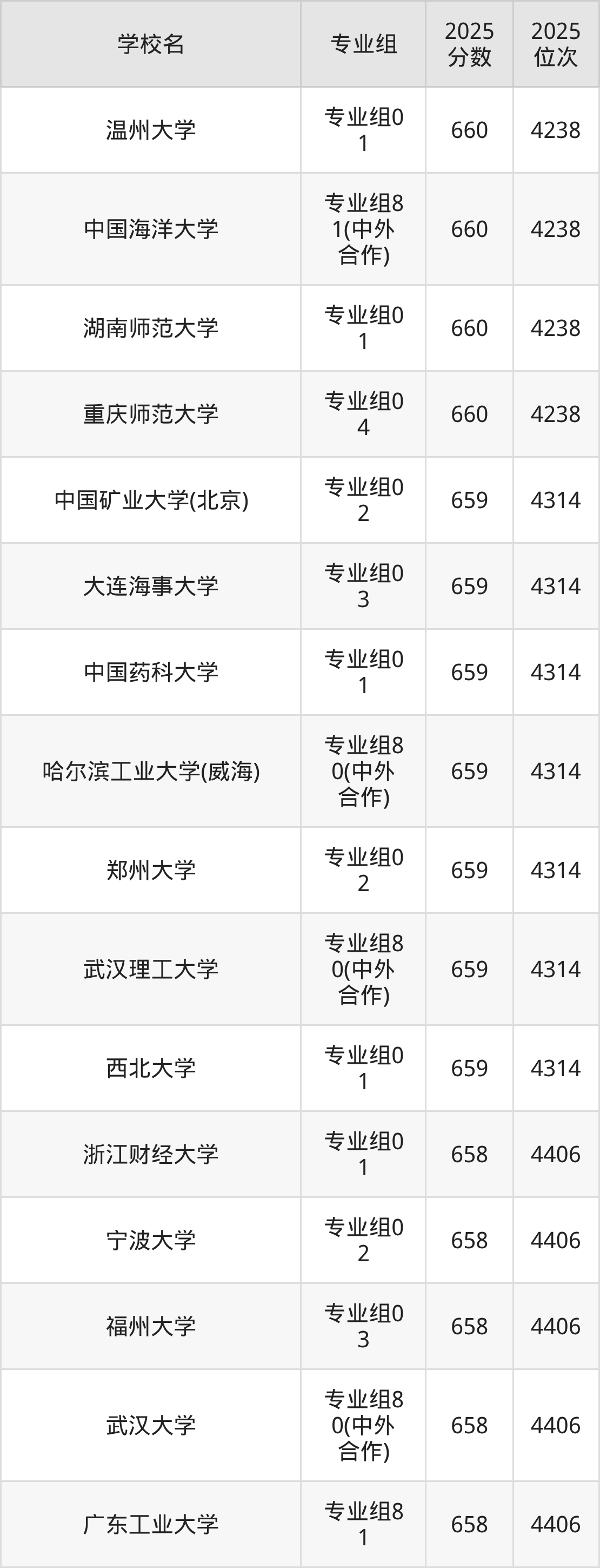 658分可以冲一冲的大学:温州大学660分、中国海洋大学660分、湖南师范大学660分、重庆师范大学660分等;