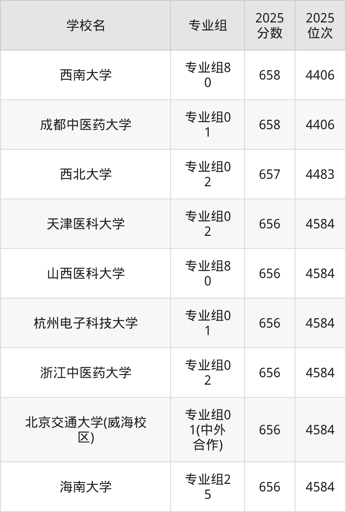 658分较稳妥的大学:西北大学657分、天津医科大学656分、山西医科大学656分、杭州电子科技大学656分等。