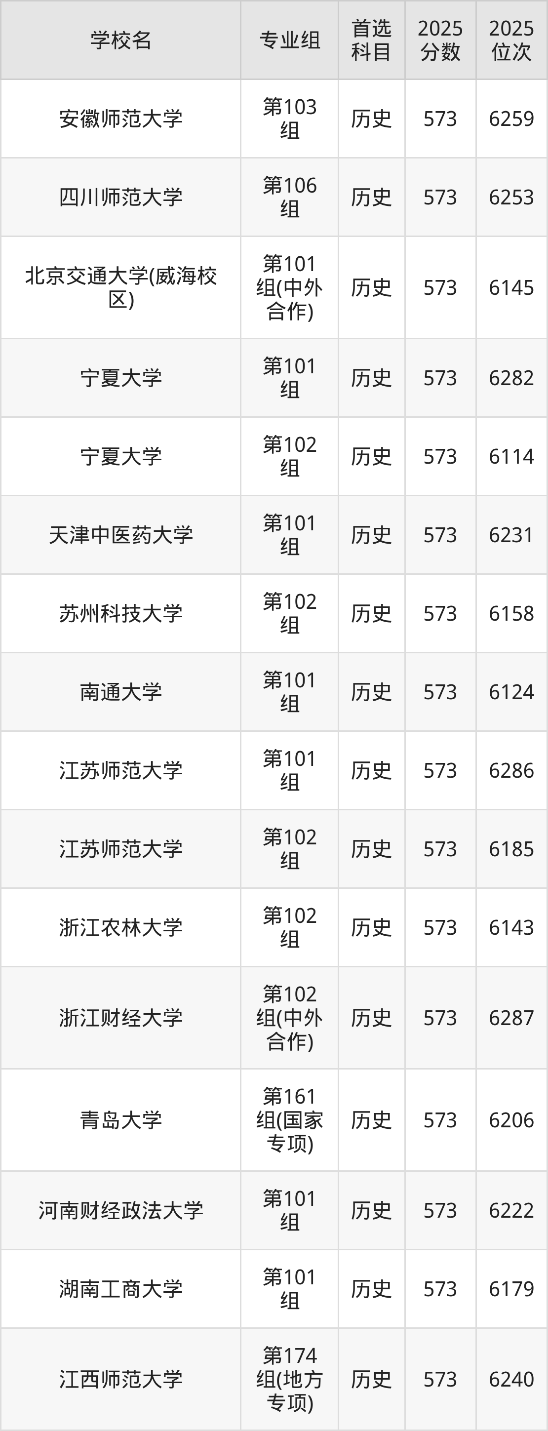历史类571分可以冲的大学:安徽师范大学573分、四川师范大学573分、北京交通大学(威海校区)573分、宁夏大学573分等;较稳妥的大学:天津师范大学570分、东北财经大学570分、辽宁大学570分、石河子大学570分等。
