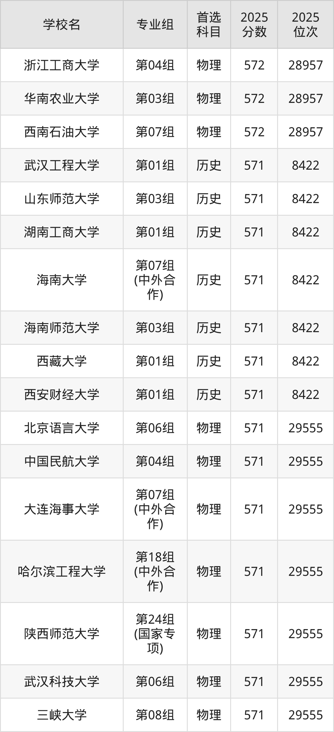 2025年在湖北高考历史类录取分数线是571分的大学有武汉工程大学、山东师范大学、湖南工商大学、海南大学、海南师范大学、西藏大学、西安财经大学。物理类录取分数线是571分的大学有北京语言大学、中国民航大学、大连海事大学、哈尔滨工程大学、陕西师范大学、武汉科技大学、三峡大学、南京中医药大学、浙江理工大学、湖南中医药大学等。