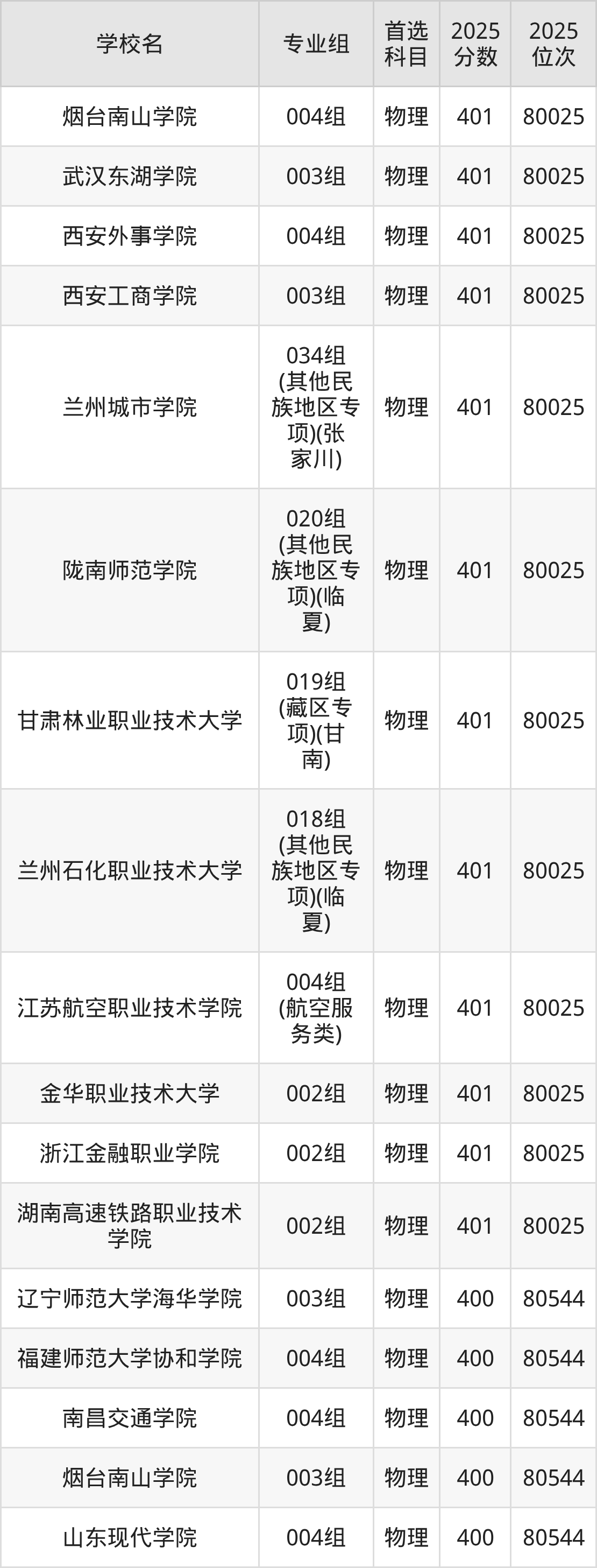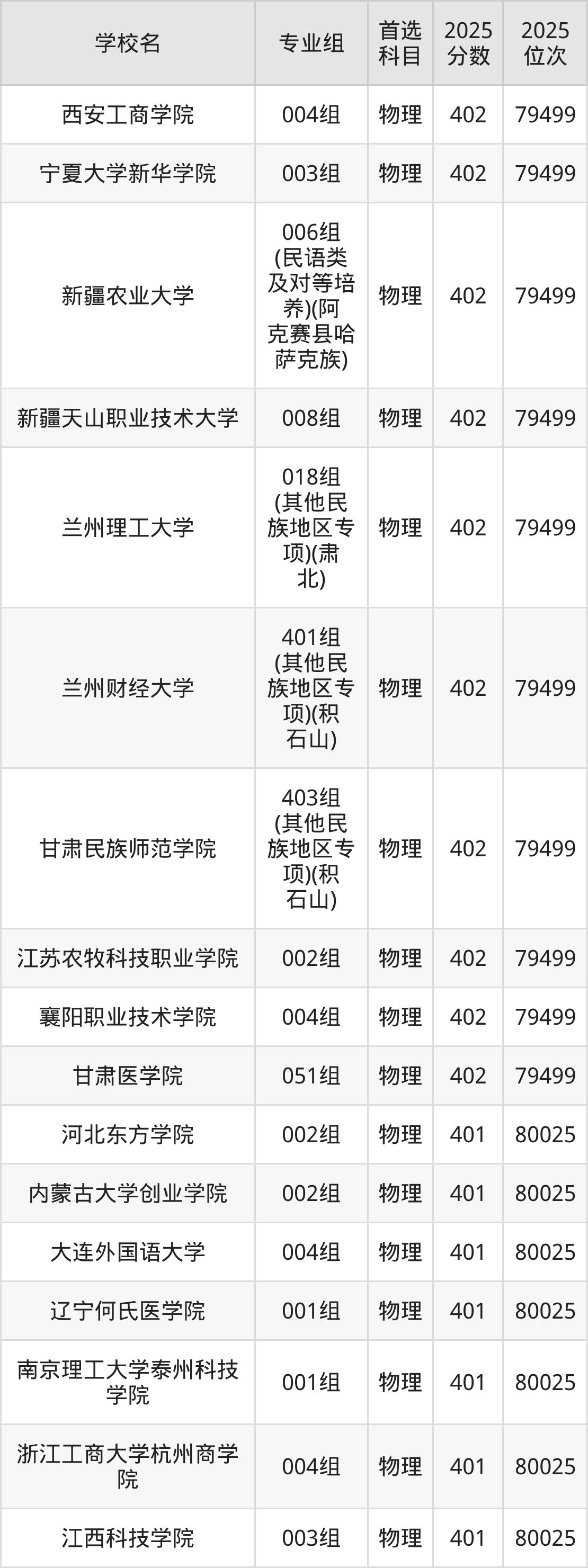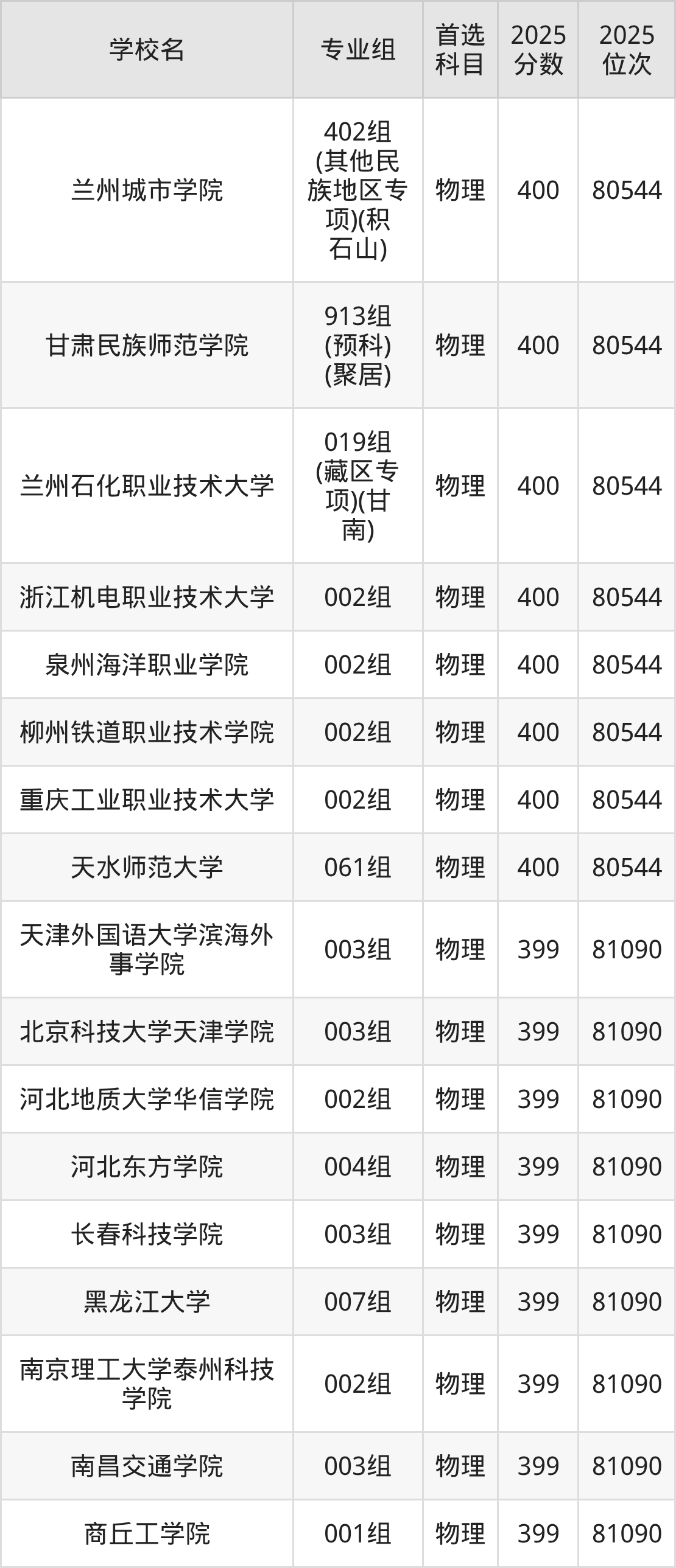 甘肃物理类401分对应的位次排名是80025名,因此建议2026年位次排在这附近的考生考虑这些大学。