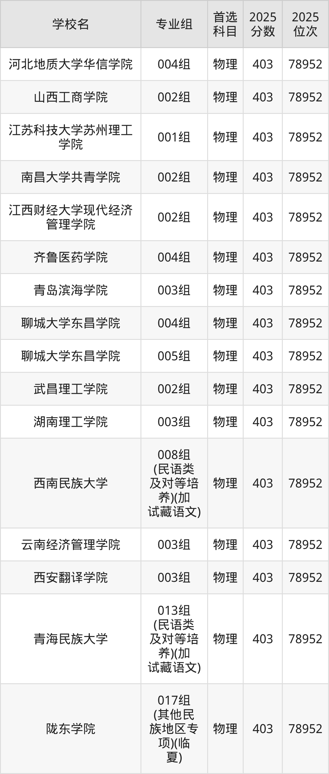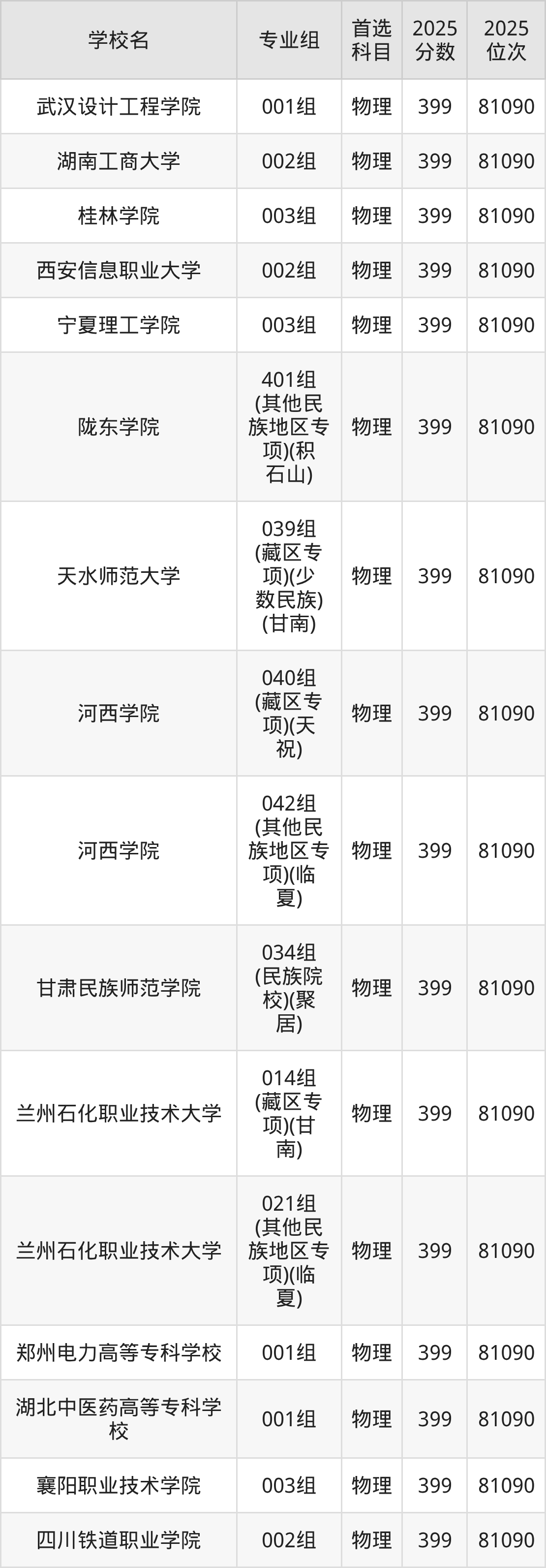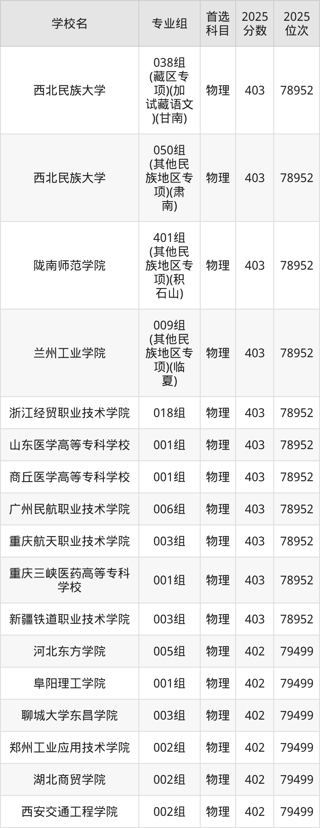 甘肃物理类401分对应的位次排名是80025名,因此建议2026年位次排在这附近的考生考虑这些大学。