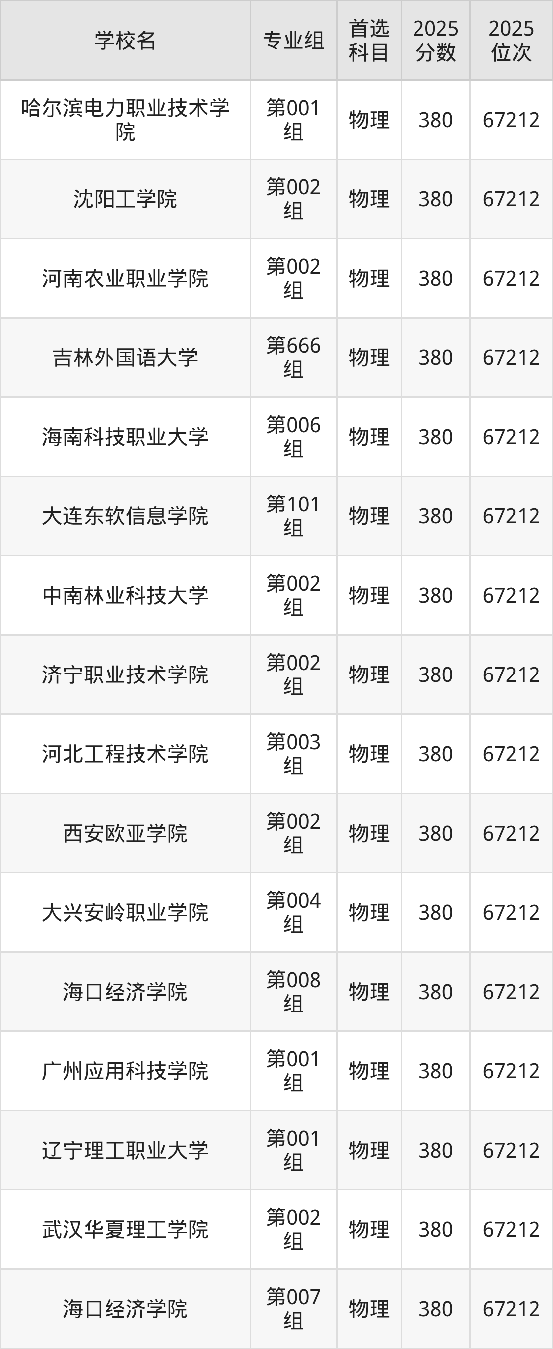 378分可以冲一冲的大学:哈尔滨电力职业技术学院380分、沈阳工学院380分、河南农业职业学院380分、吉林外国语大学380分等;
