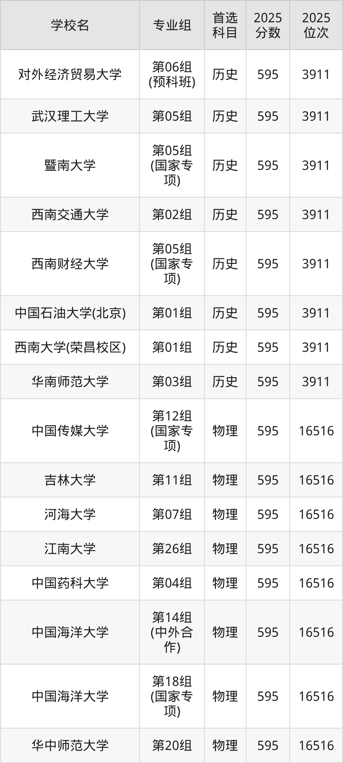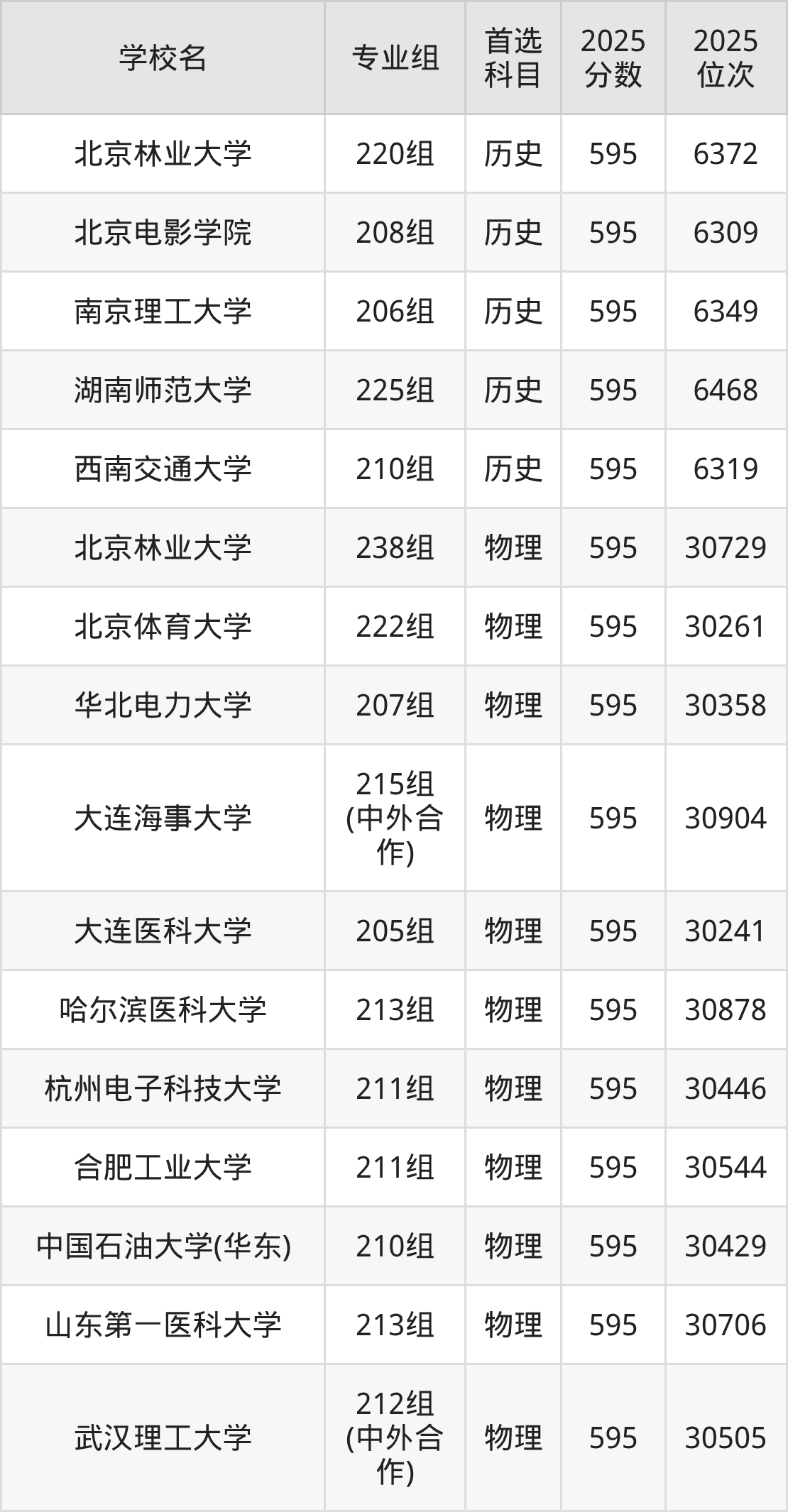 2025年在湖北高考物理类录取分数线是593分的大学有北京交通大学、北京林业大学、江南大学、中国地质大学(武汉)、重庆大学、西北农林科技大学、兰州大学、首都师范大学、沈阳药科大学、湖南师范大学等。历史类录取分数线是593分的大学有大连海事大学、哈尔滨工程大学、中国矿业大学、中国地质大学(武汉)、中国地质大学(北京)、北京电影学院、东北财经大学、苏州大学、安徽大学、郑州大学。