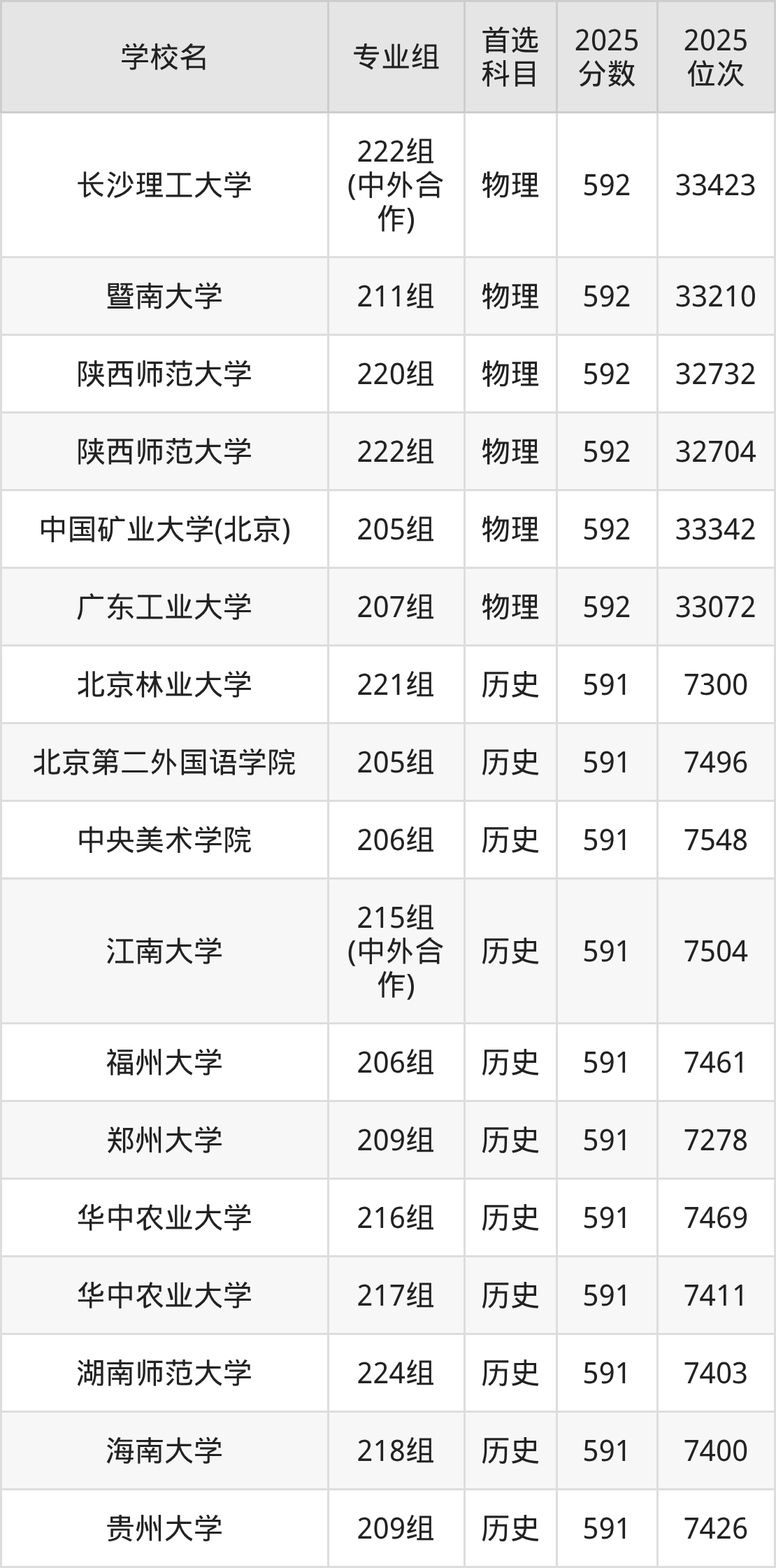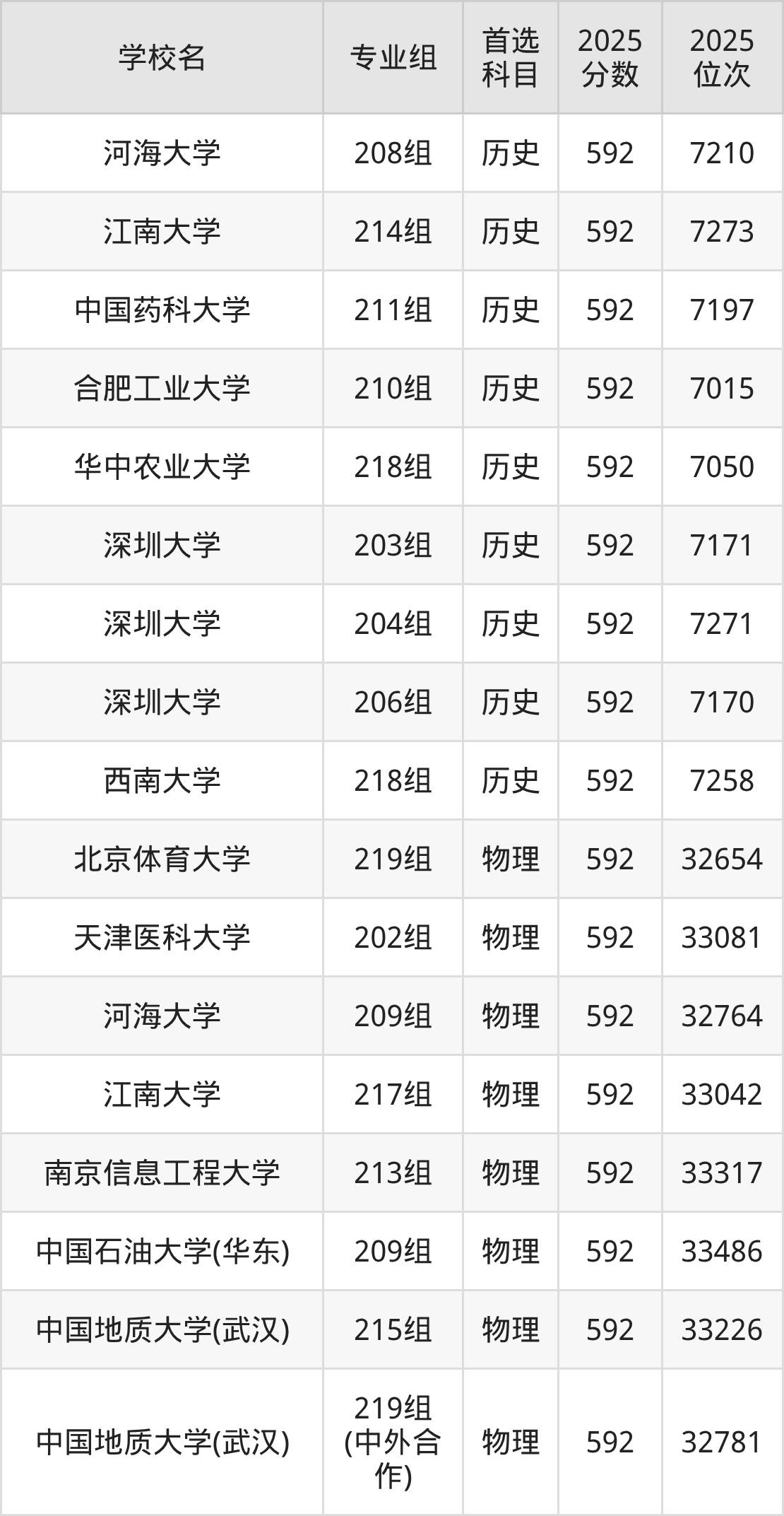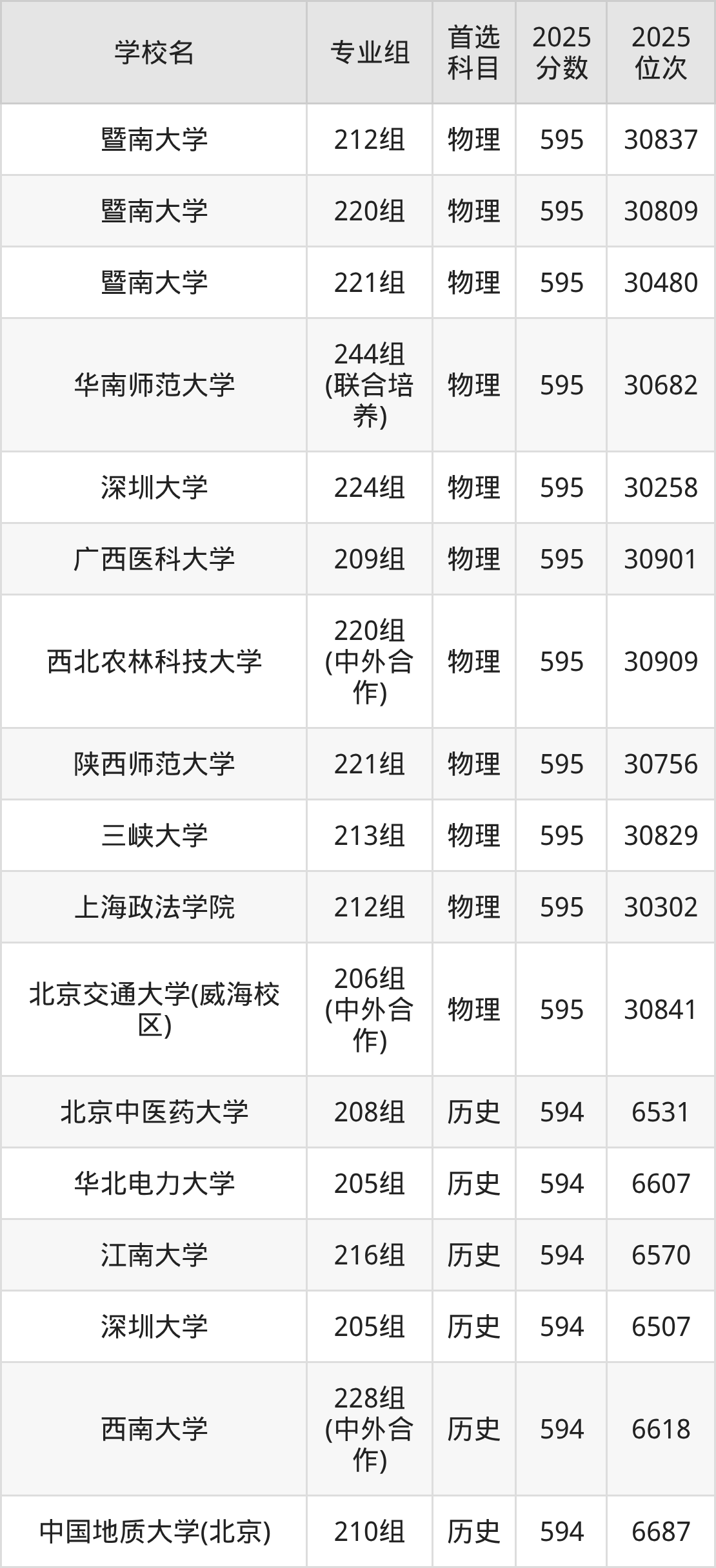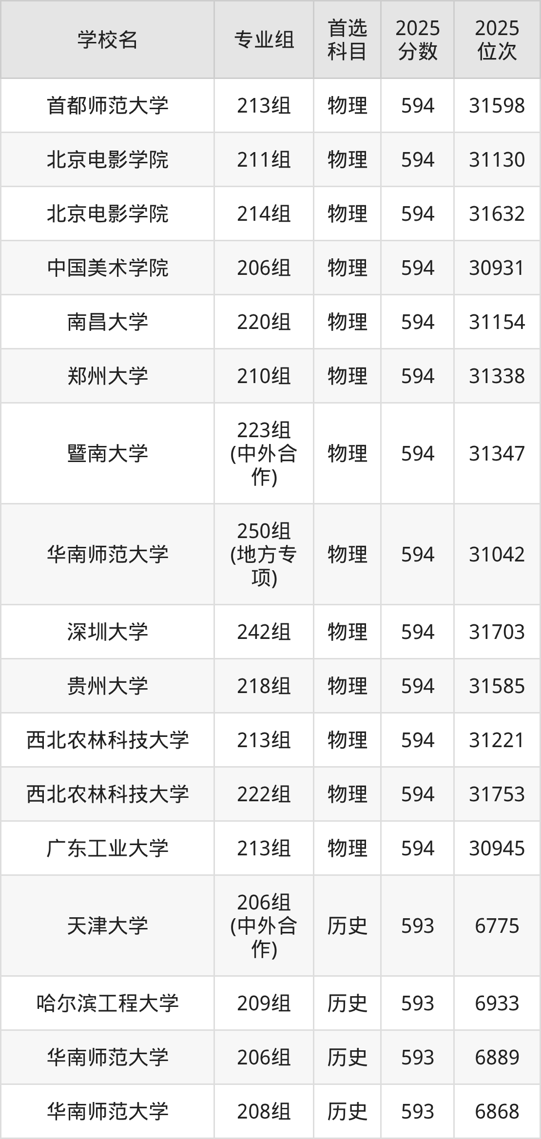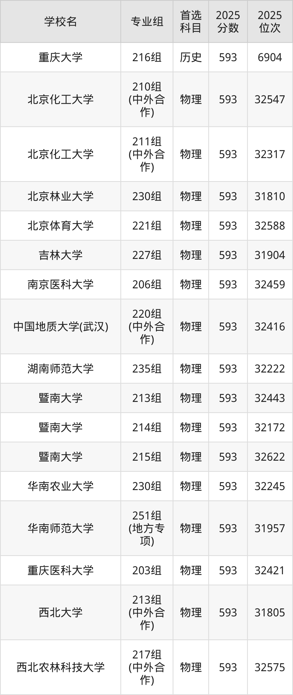 2025年在广东高考物理类录取分数线是593分的大学有北京化工大学、北京林业大学、北京体育大学、吉林大学、南京医科大学、中国地质大学(武汉)、湖南师范大学、暨南大学、华南农业大学、华南师范大学等。历史类录取分数线是593分的大学有天津大学、哈尔滨工程大学、华南师范大学、重庆大学。