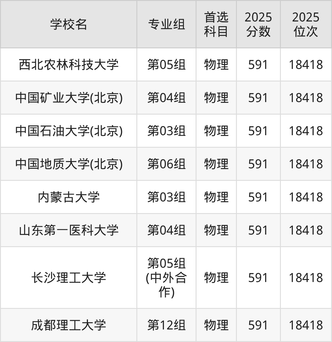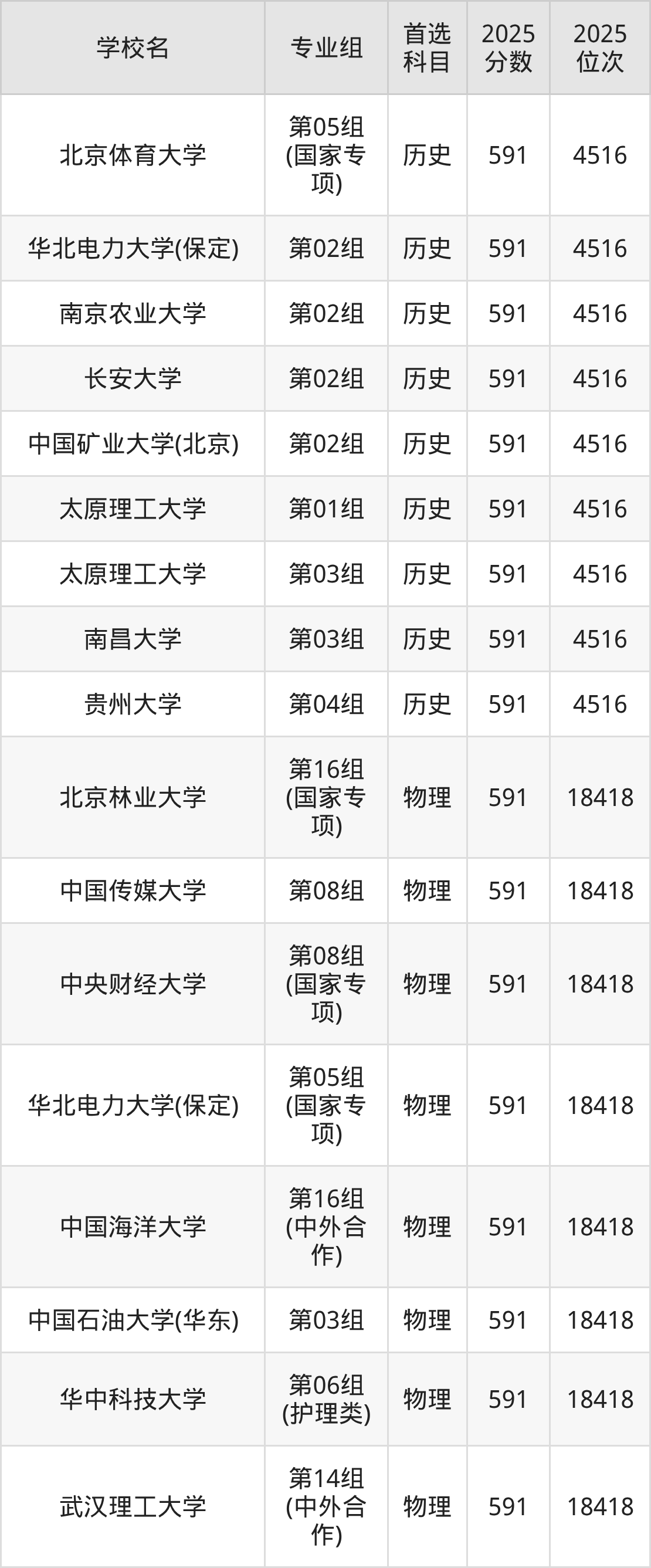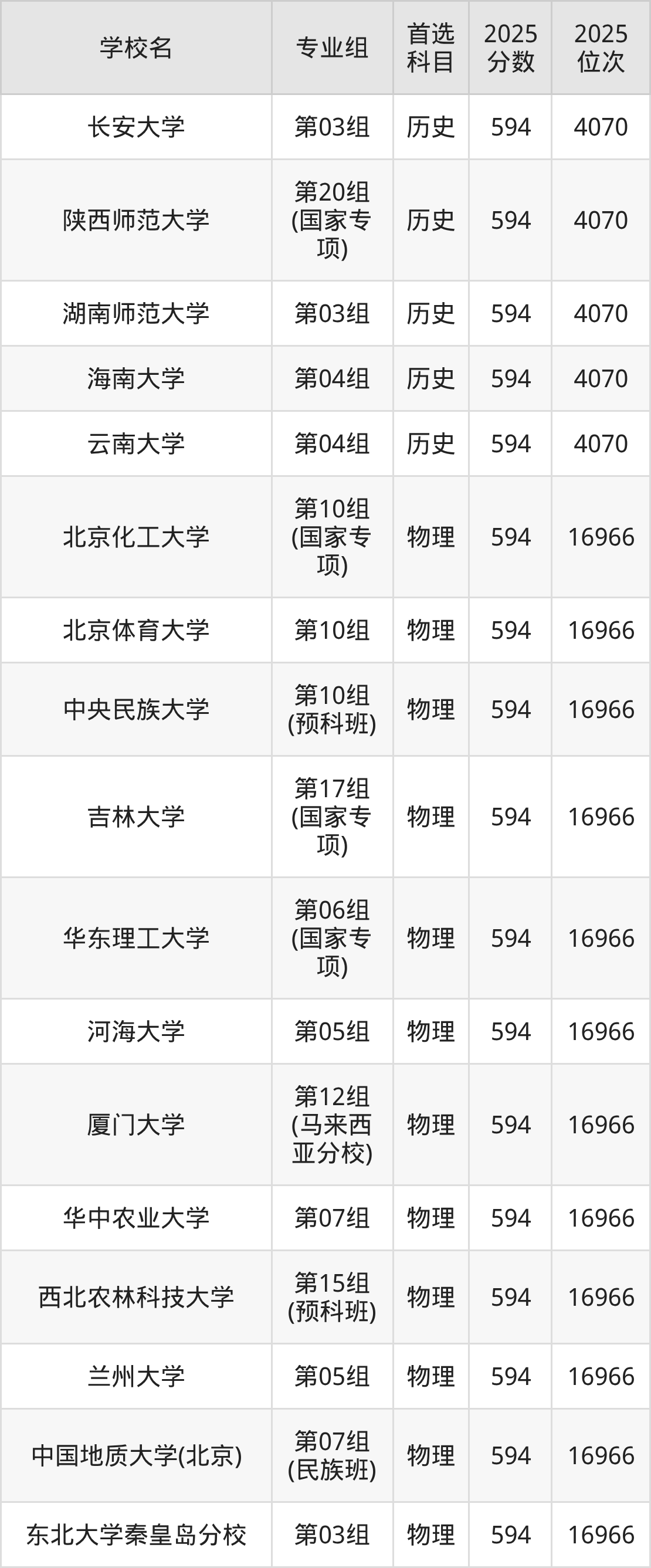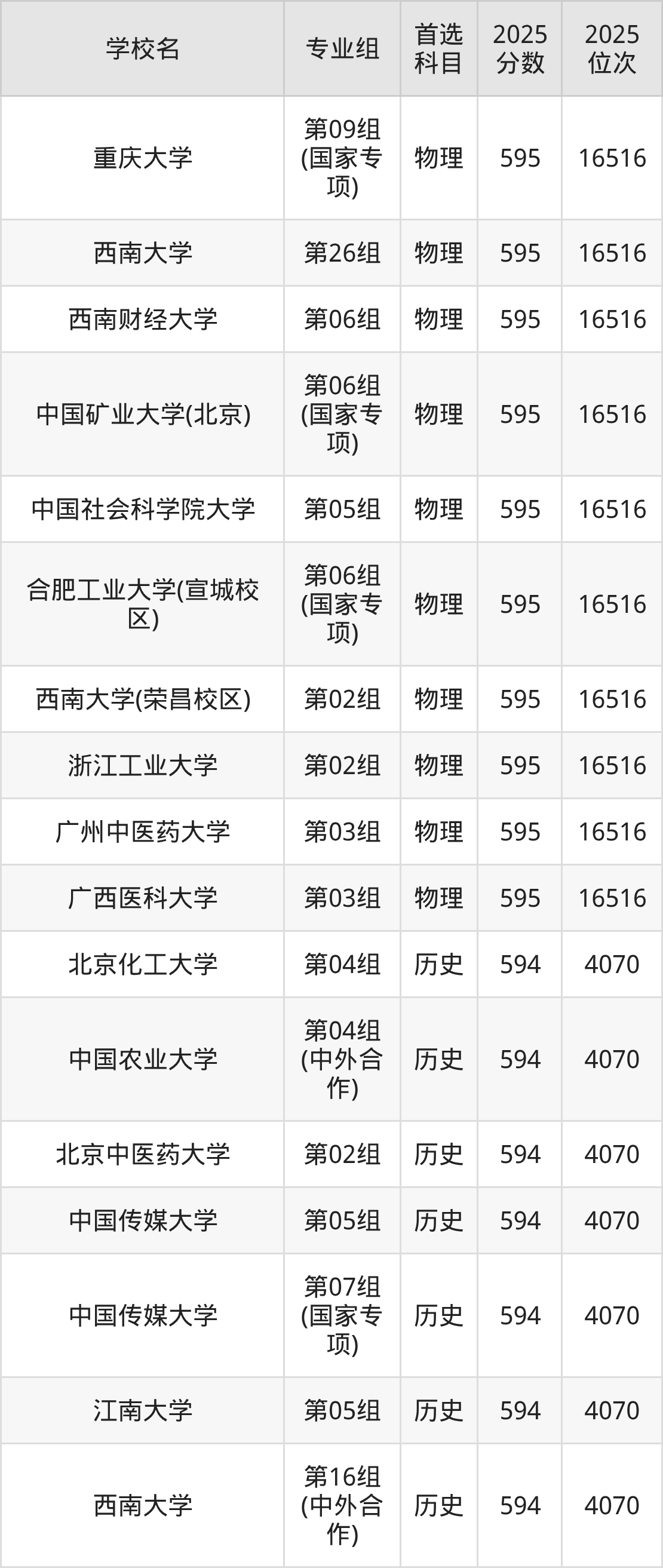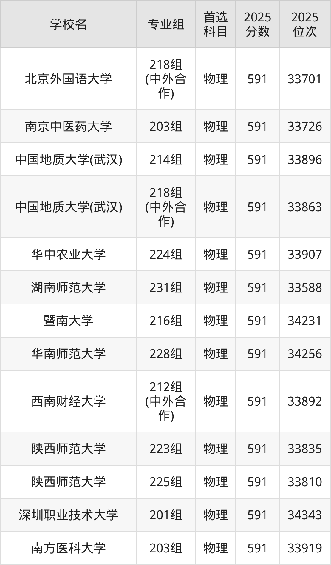 2025年在广东高考物理类录取分数线是593分的大学有北京化工大学、北京林业大学、北京体育大学、吉林大学、南京医科大学、中国地质大学(武汉)、湖南师范大学、暨南大学、华南农业大学、华南师范大学等。历史类录取分数线是593分的大学有天津大学、哈尔滨工程大学、华南师范大学、重庆大学。