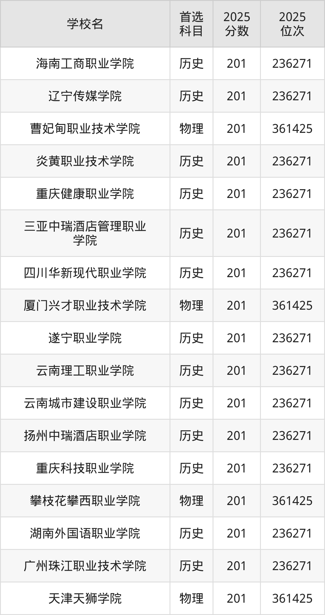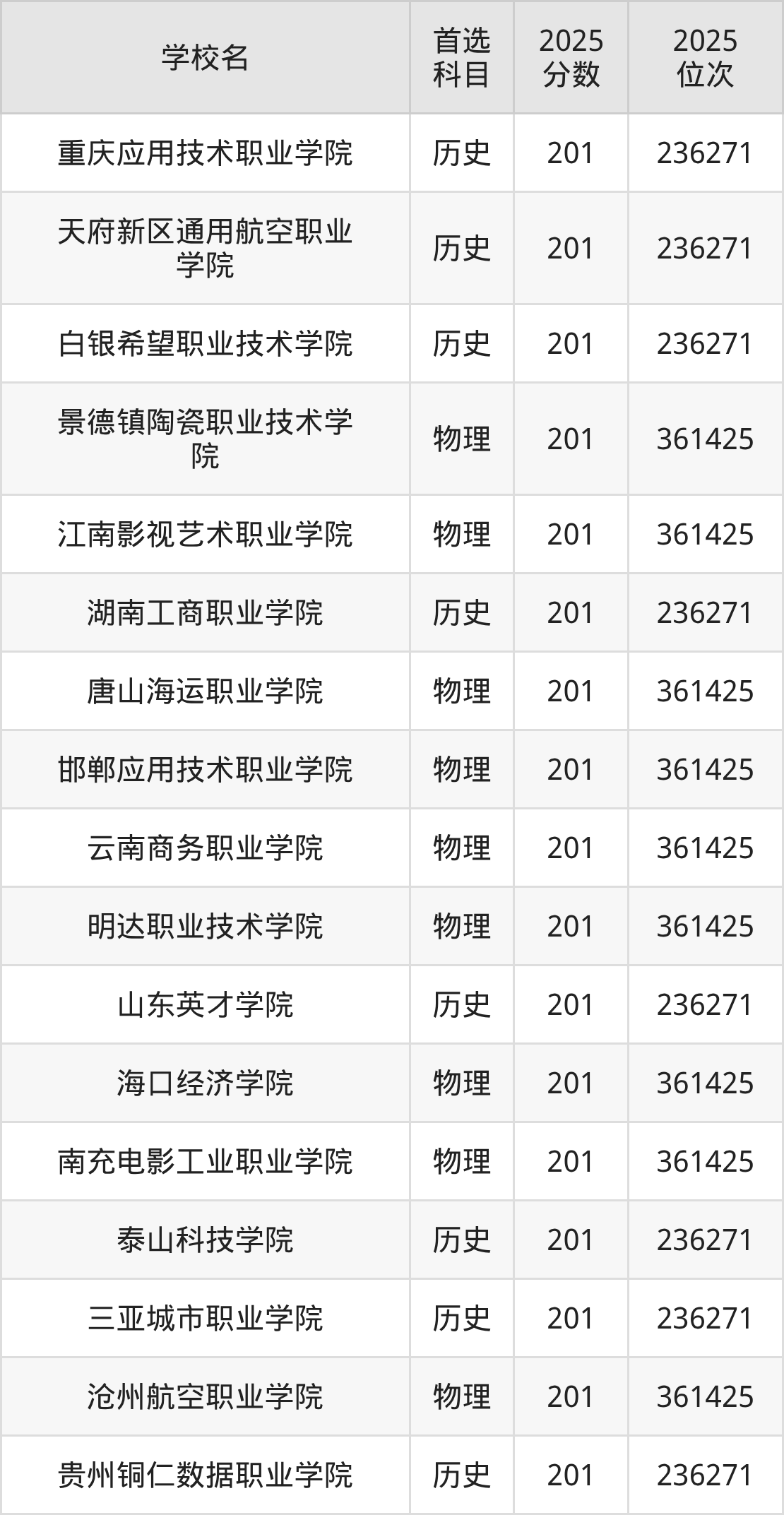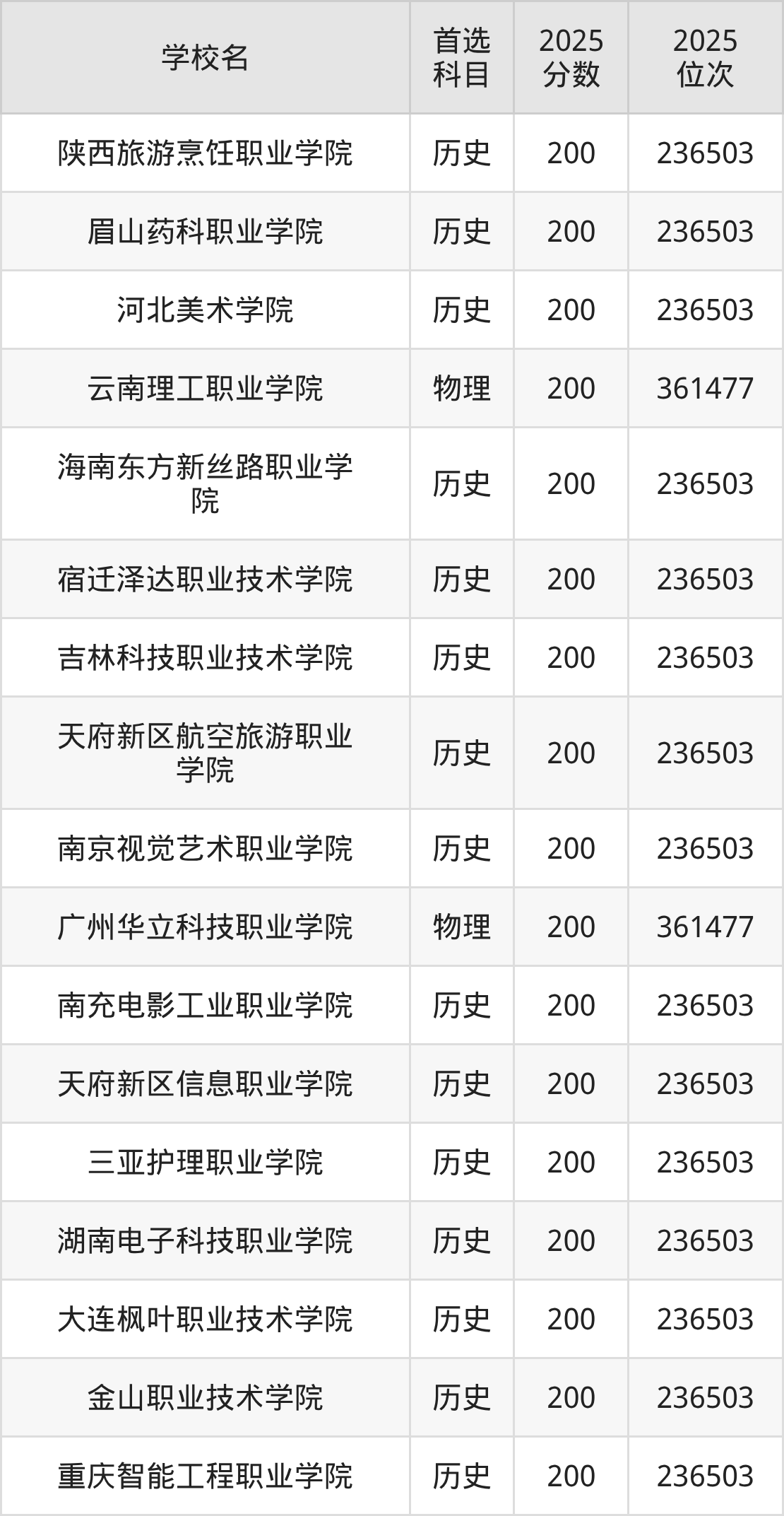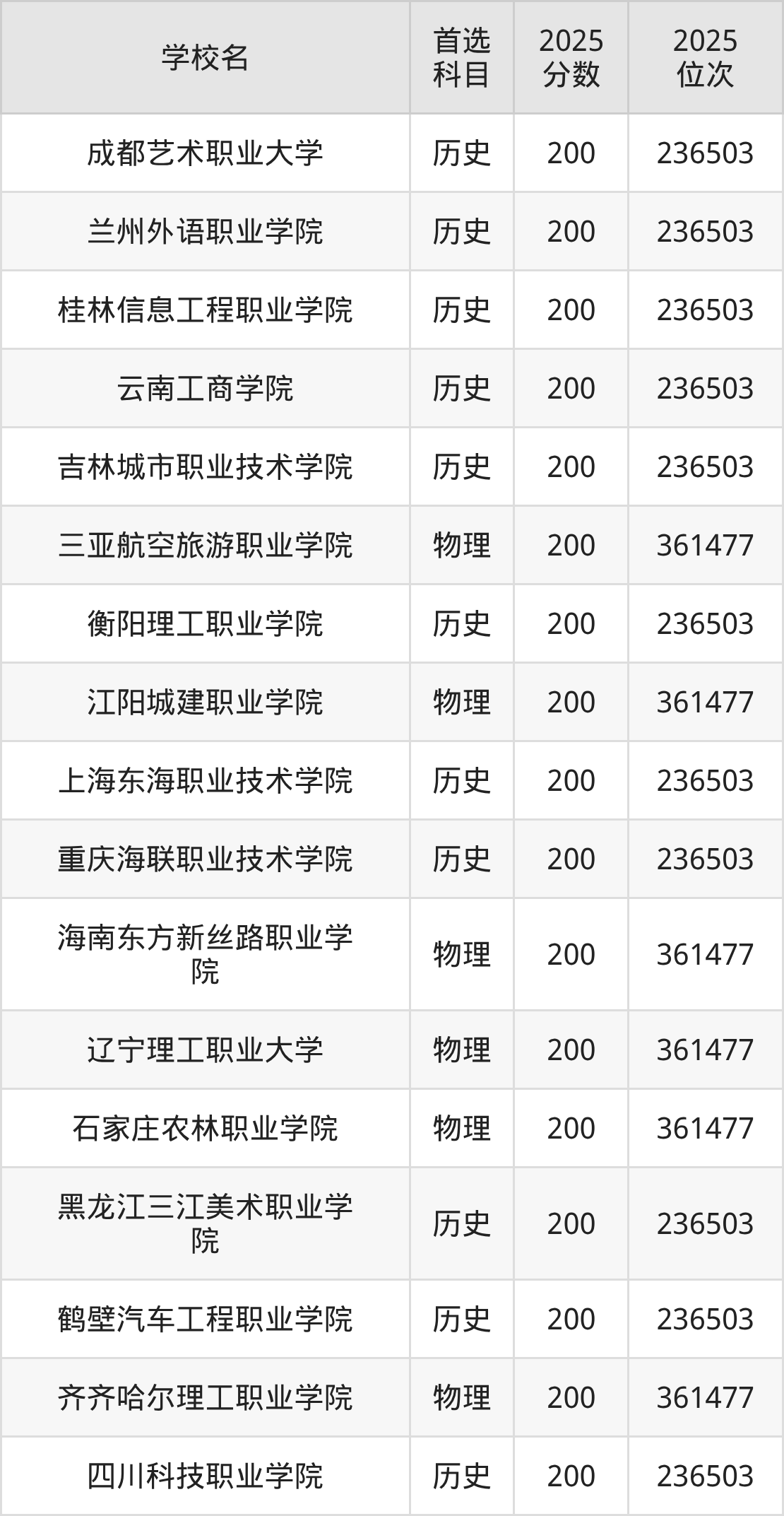 2025年在河北高考历史类录取分数线是200分的大学有成都艺术职业大学、兰州外语职业学院、桂林信息工程职业学院、云南工商学院、吉林城市职业技术学院、衡阳理工职业学院、上海东海职业技术学院、重庆海联职业技术学院、黑龙江三江美术职业学院、鹤壁汽车工程职业学院等。物理类录取分数线是200分的大学有三亚航空旅游职业学院、江阳城建职业学院、海南东方新丝路职业学院、辽宁理工职业大学、石家庄农林职业学院、齐齐哈尔理工职业学院、四川西南航空职业学院、贵州铜仁数据职业学院、江海职业技术学院、南充科技职业学院等。