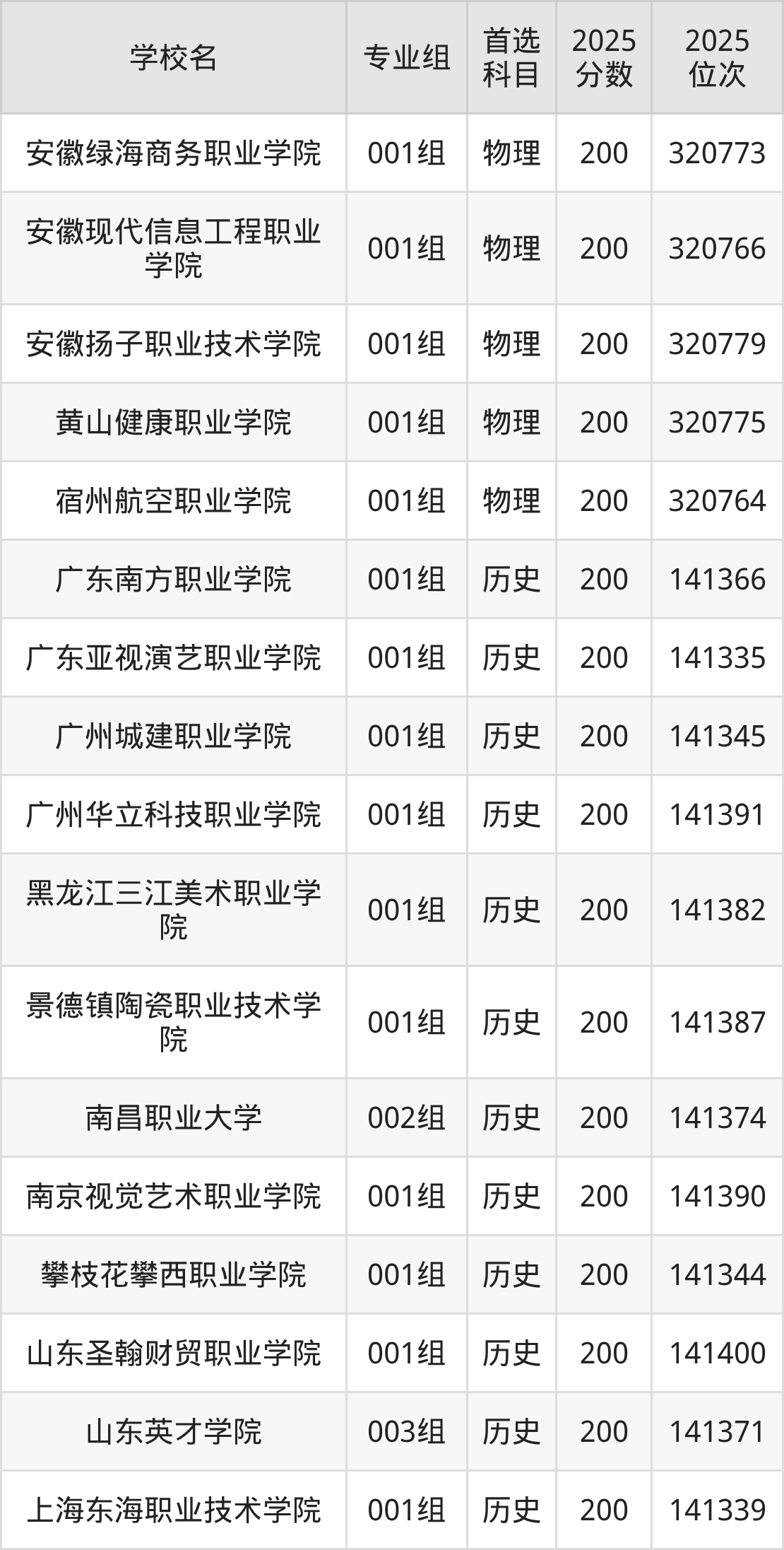2025年在安徽高考物理类录取分数线是200分的大学有宝鸡中北职业学院、滨州科技职业学院、广东南方职业学院、昆山登云科技职业学院、山东工程职业技术大学、安徽绿海商务职业学院、安徽现代信息工程职业学院、安徽扬子职业技术学院、黄山健康职业学院、宿州航空职业学院。历史类录取分数线是200分的大学有广东南方职业学院、广东亚视演艺职业学院、广州城建职业学院、广州华立科技职业学院、黑龙江三江美术职业学院、景德镇陶瓷职业技术学院、南昌职业大学、南京视觉艺术职业学院、攀枝花攀西职业学院、山东圣翰财贸职业学院等。
