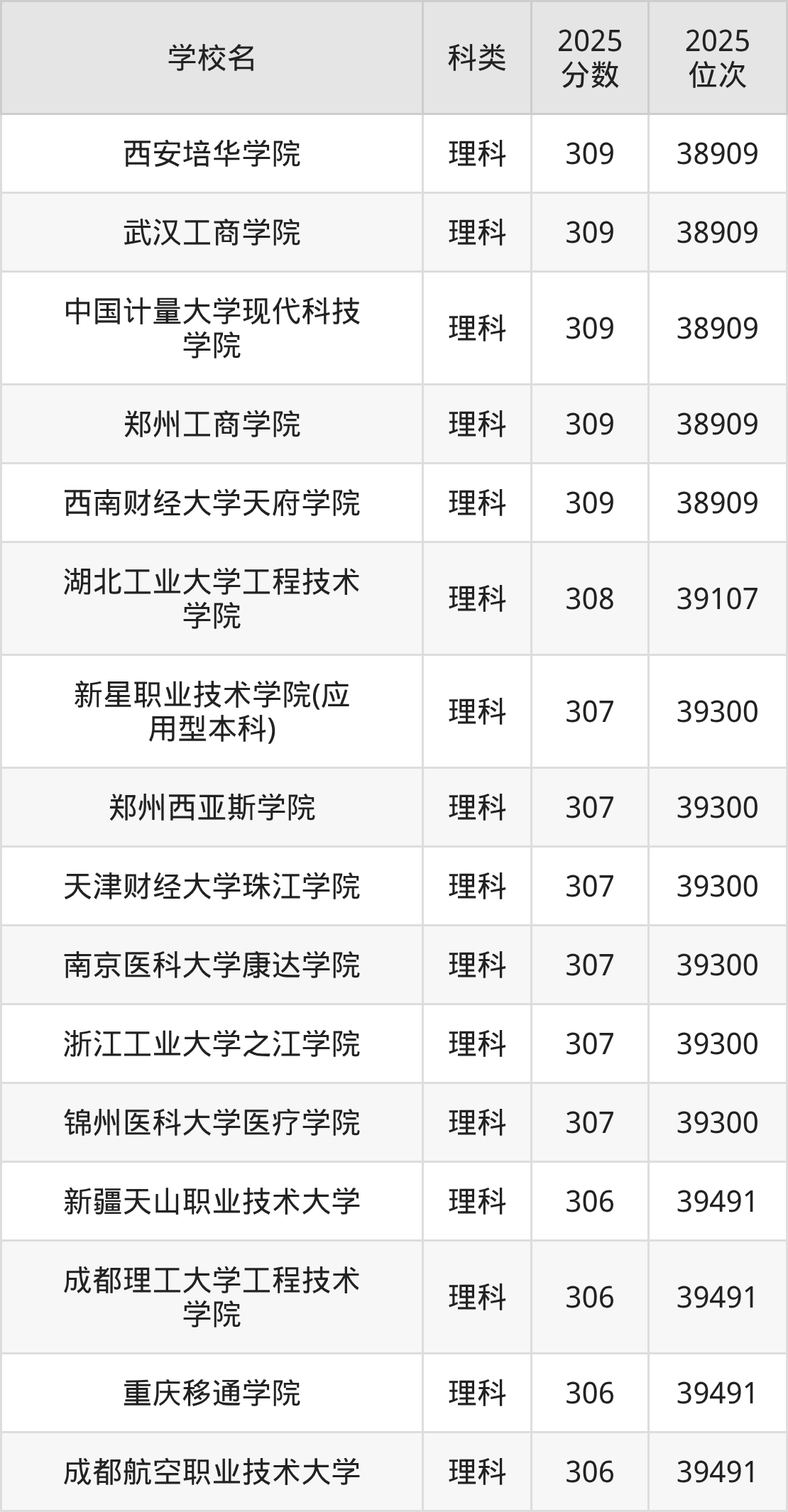 2025年在新疆高考录取分数线是307分的大学一共有6所,分别是新星职业技术学院(应用型本科)、郑州西亚斯学院、天津财经大学珠江学院、南京医科大学康达学院、浙江工业大学之江学院、锦州医科大学医疗学院。