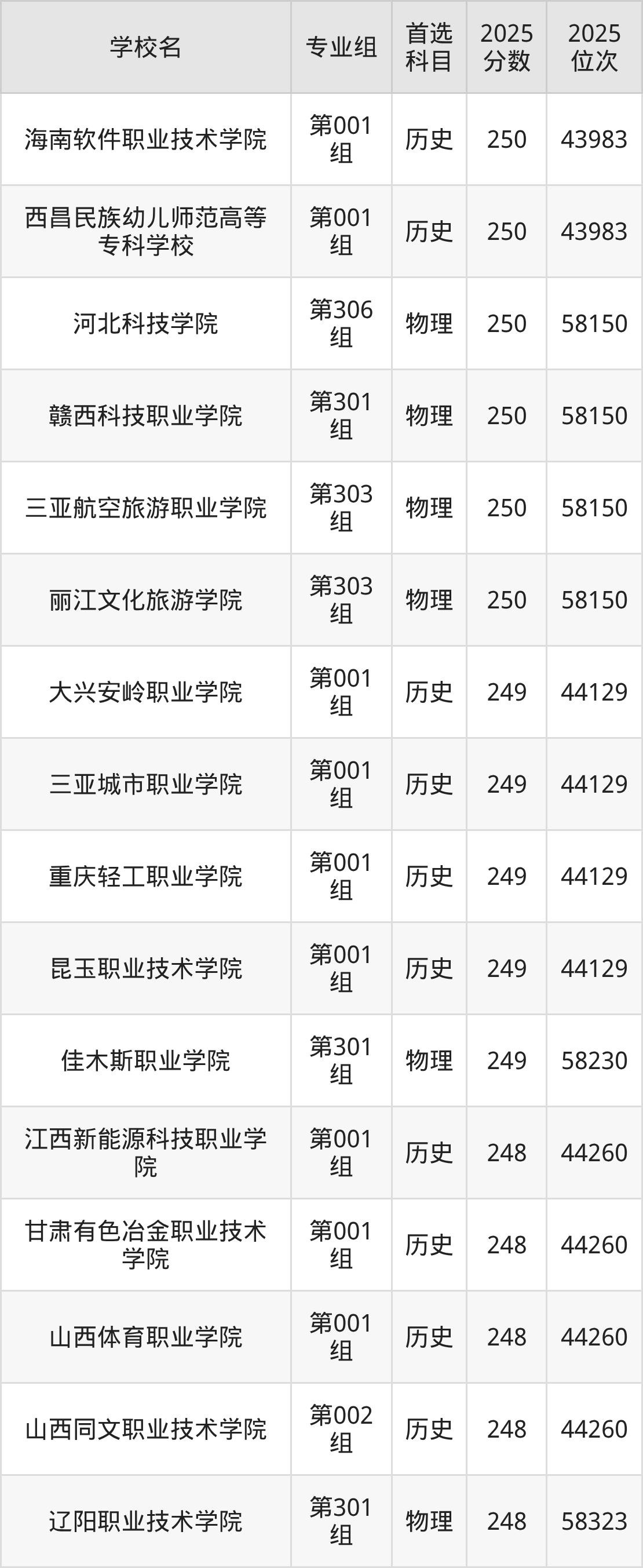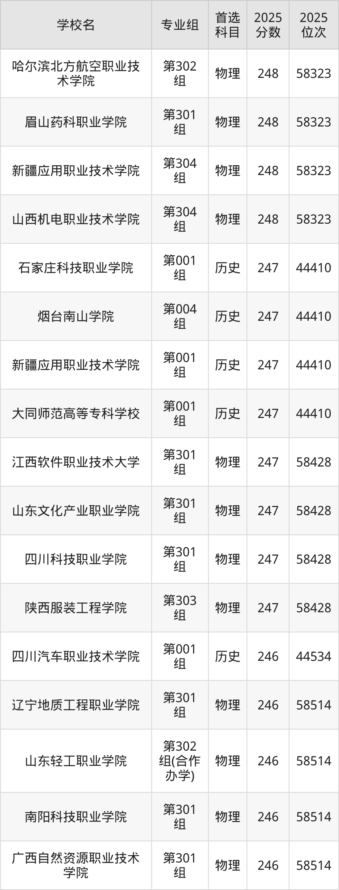 2025年在山西高考历史类录取分数线是248分的大学有江西新能源科技职业学院、甘肃有色冶金职业技术学院、山西体育职业学院、山西同文职业技术学院。物理类录取分数线是248分的大学有辽阳职业技术学院、哈尔滨北方航空职业技术学院、眉山药科职业学院、新疆应用职业技术学院、山西机电职业技术学院。