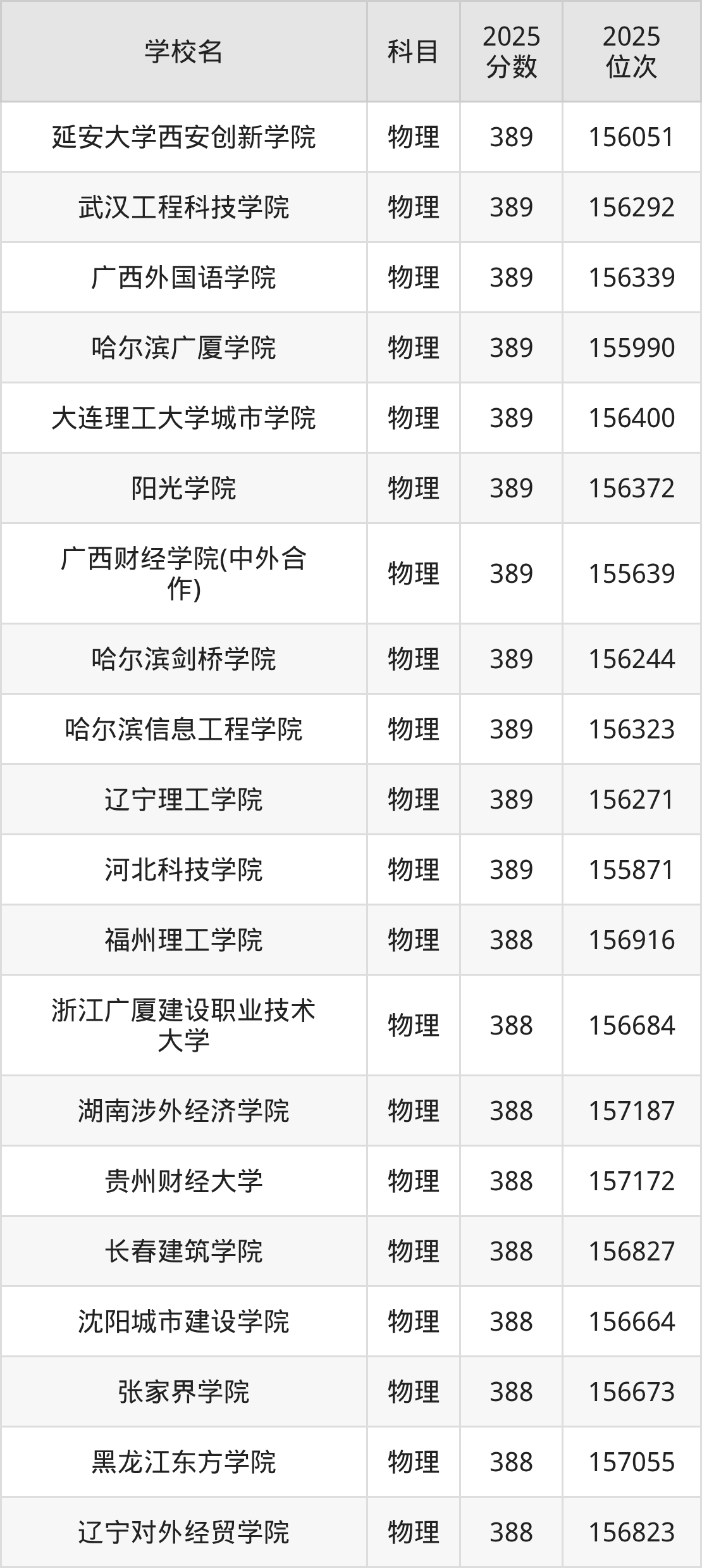 387分可以冲一冲的大学:延安大学西安创新学院389分、武汉工程科技学院389分、广西外国语学院389分、哈尔滨广厦学院389分等;