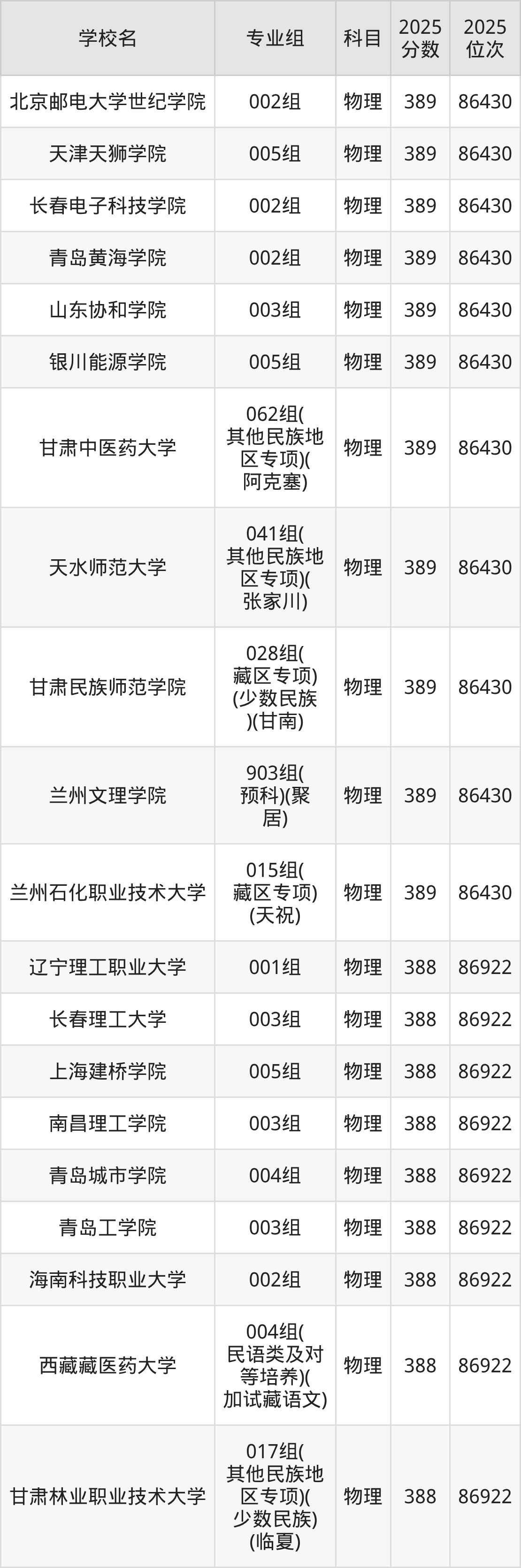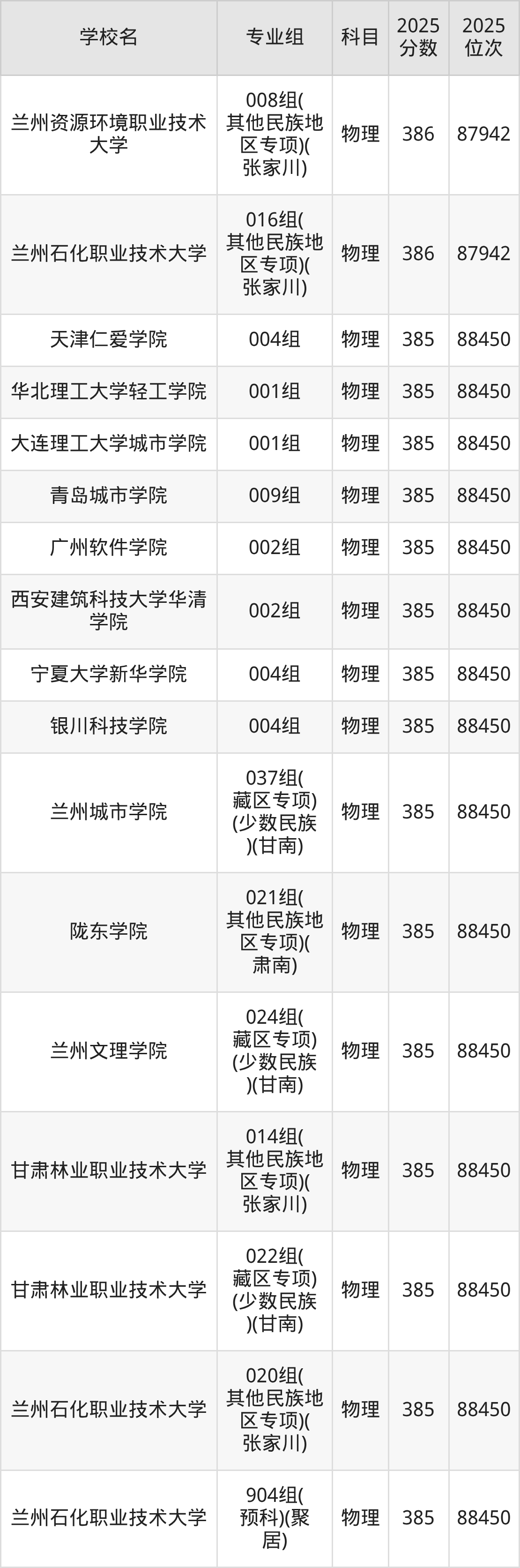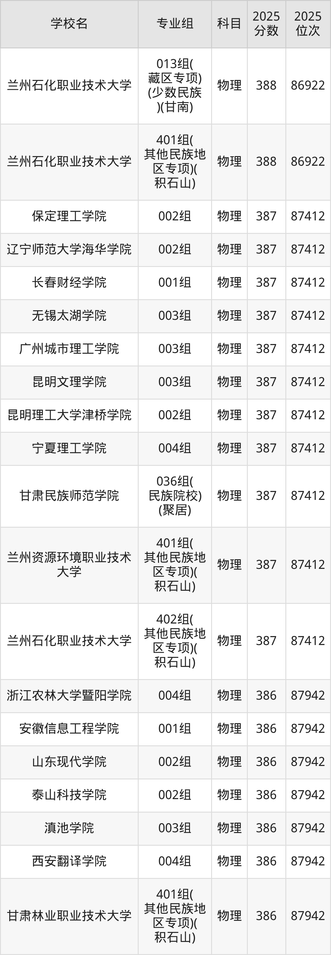 甘肃物理类387分对应的位次排名是87412名,因此建议2026年位次排在这附近的考生考虑这些大学。