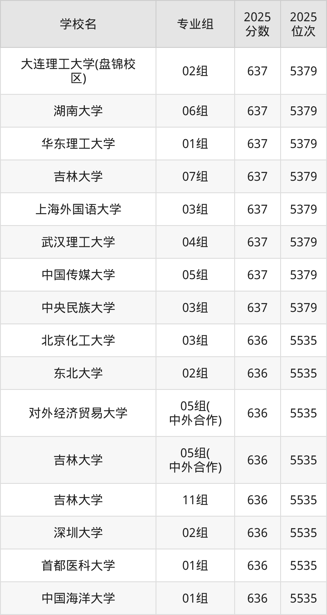 635分可以冲一冲的大学:大连理工大学(盘锦校区)637分、湖南大学637分、华东理工大学637分、吉林大学637分等;