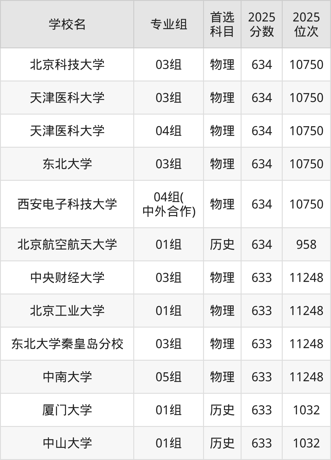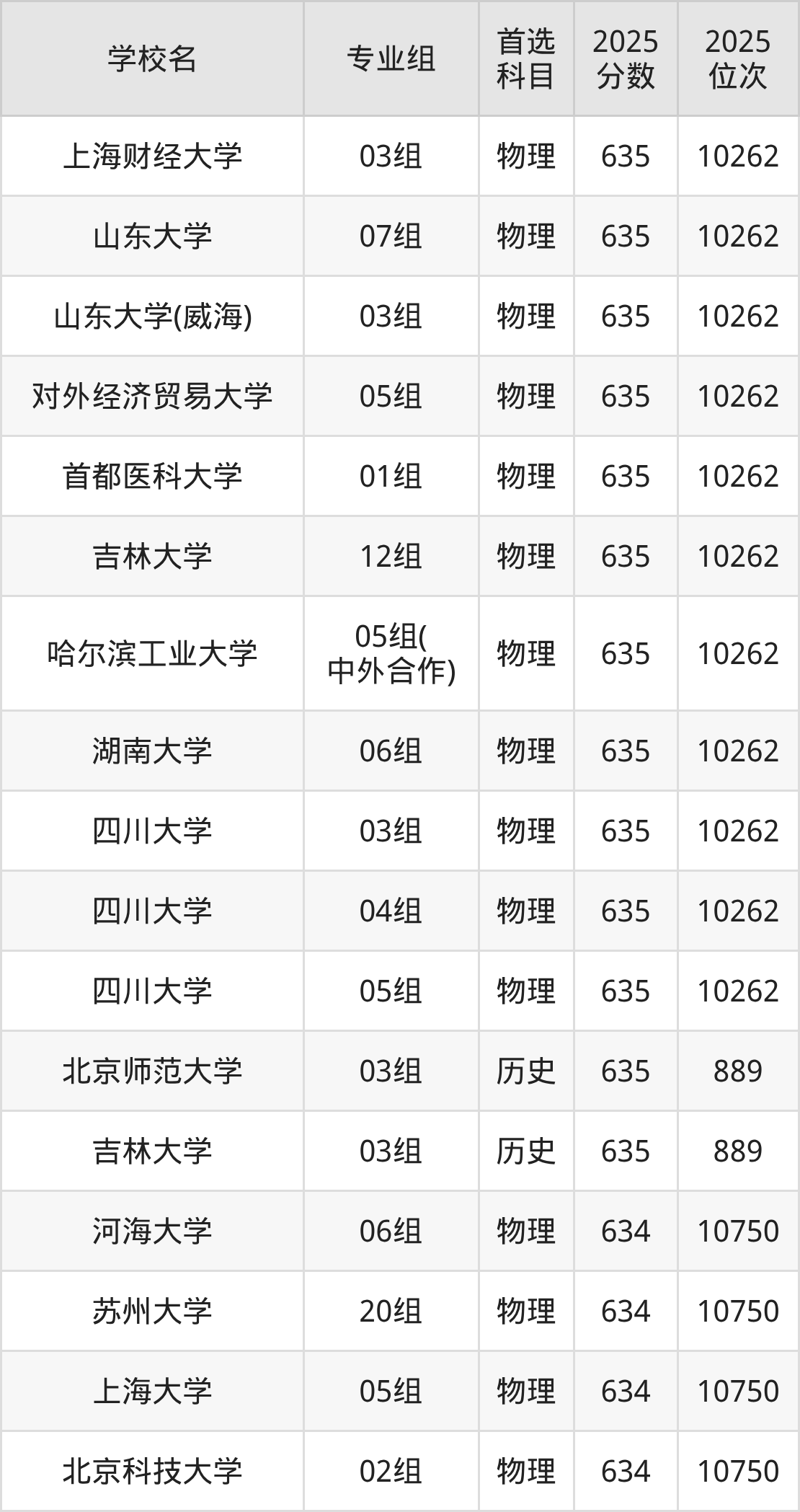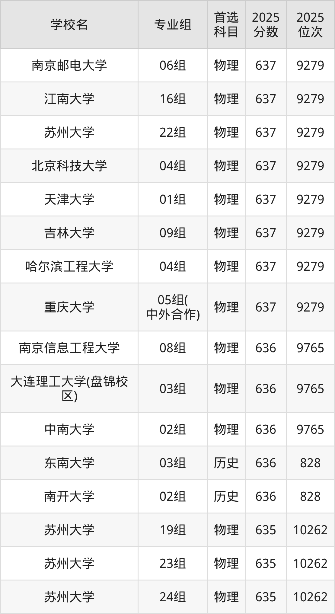 江苏高考物理类635分对应的位次排名是10262名,历史类635分对应的位次排名是889名,因此建议2026年位次排在这附近的同学考虑这些大学。