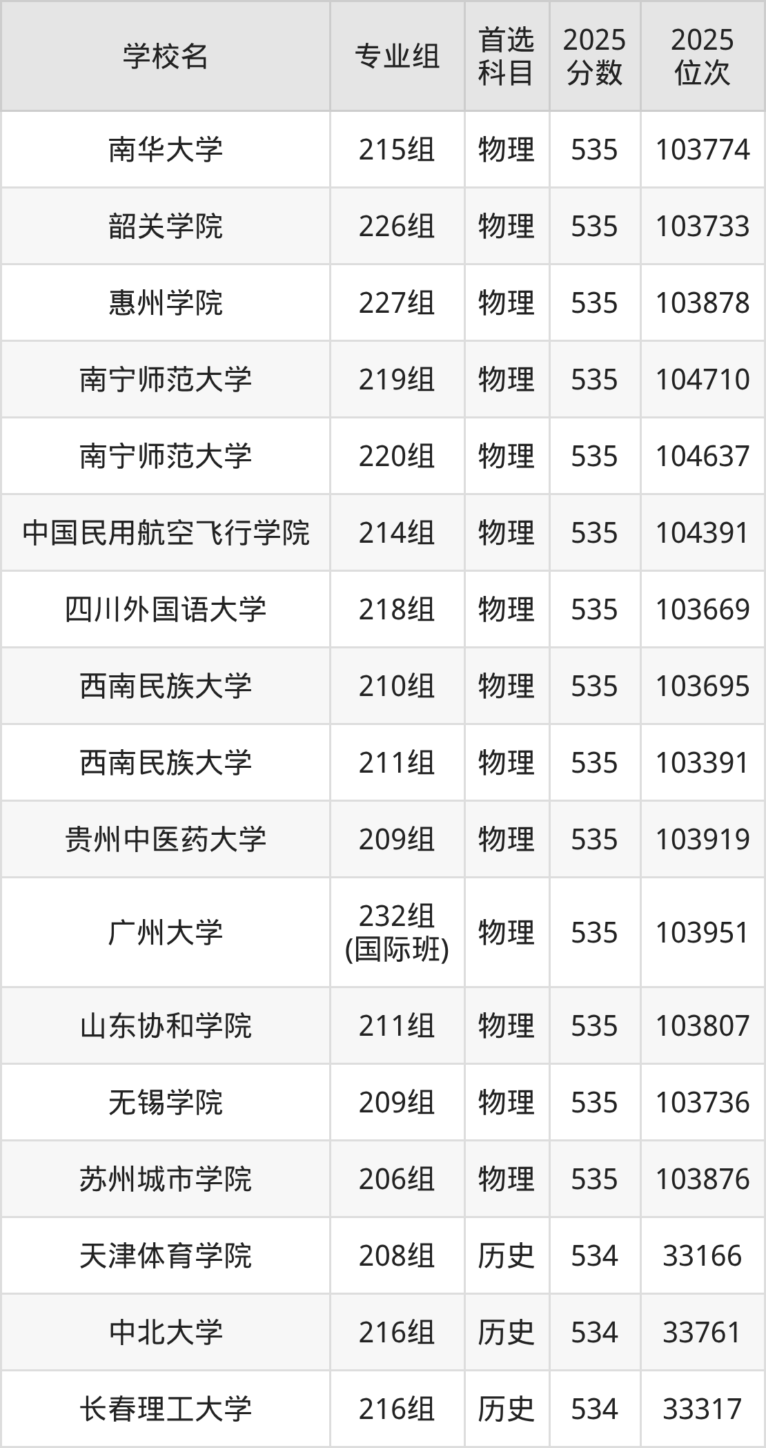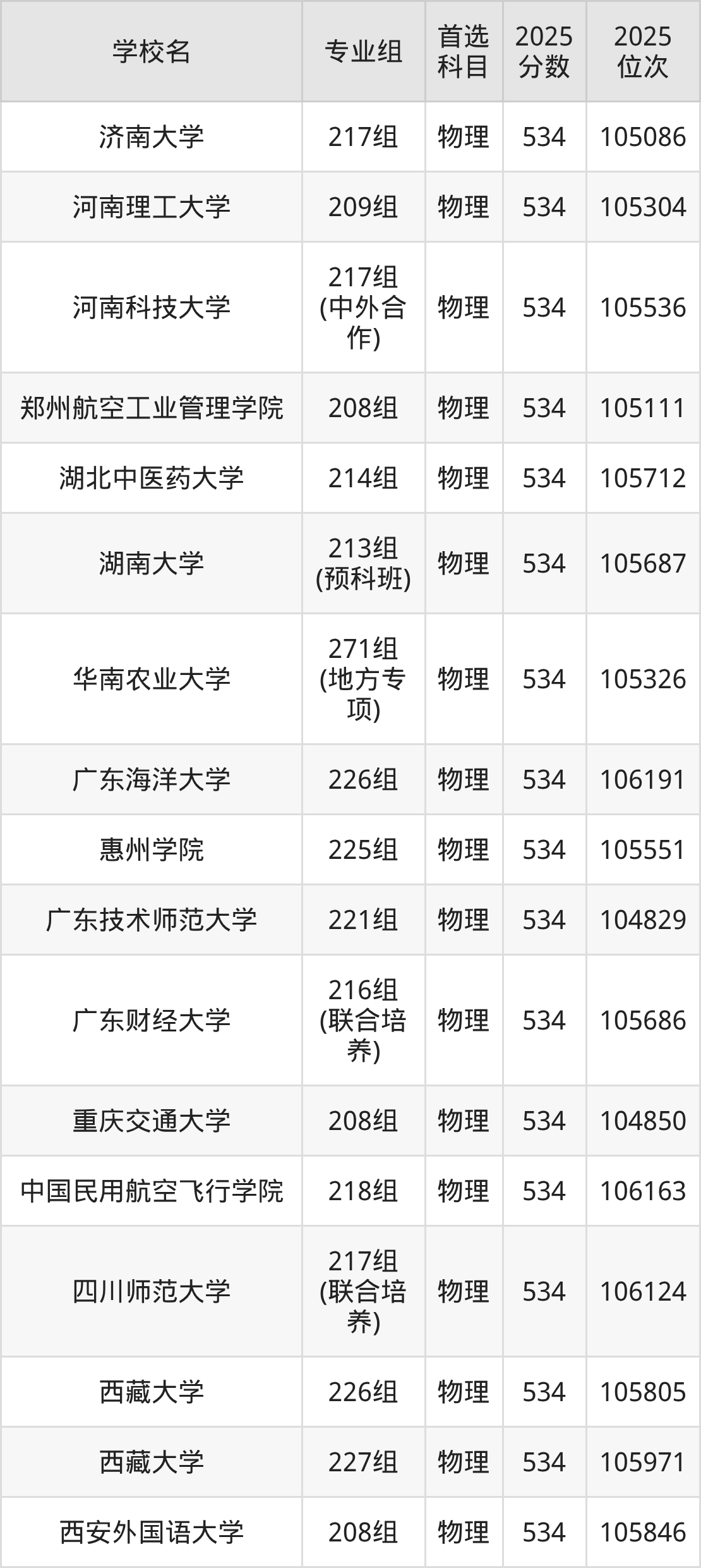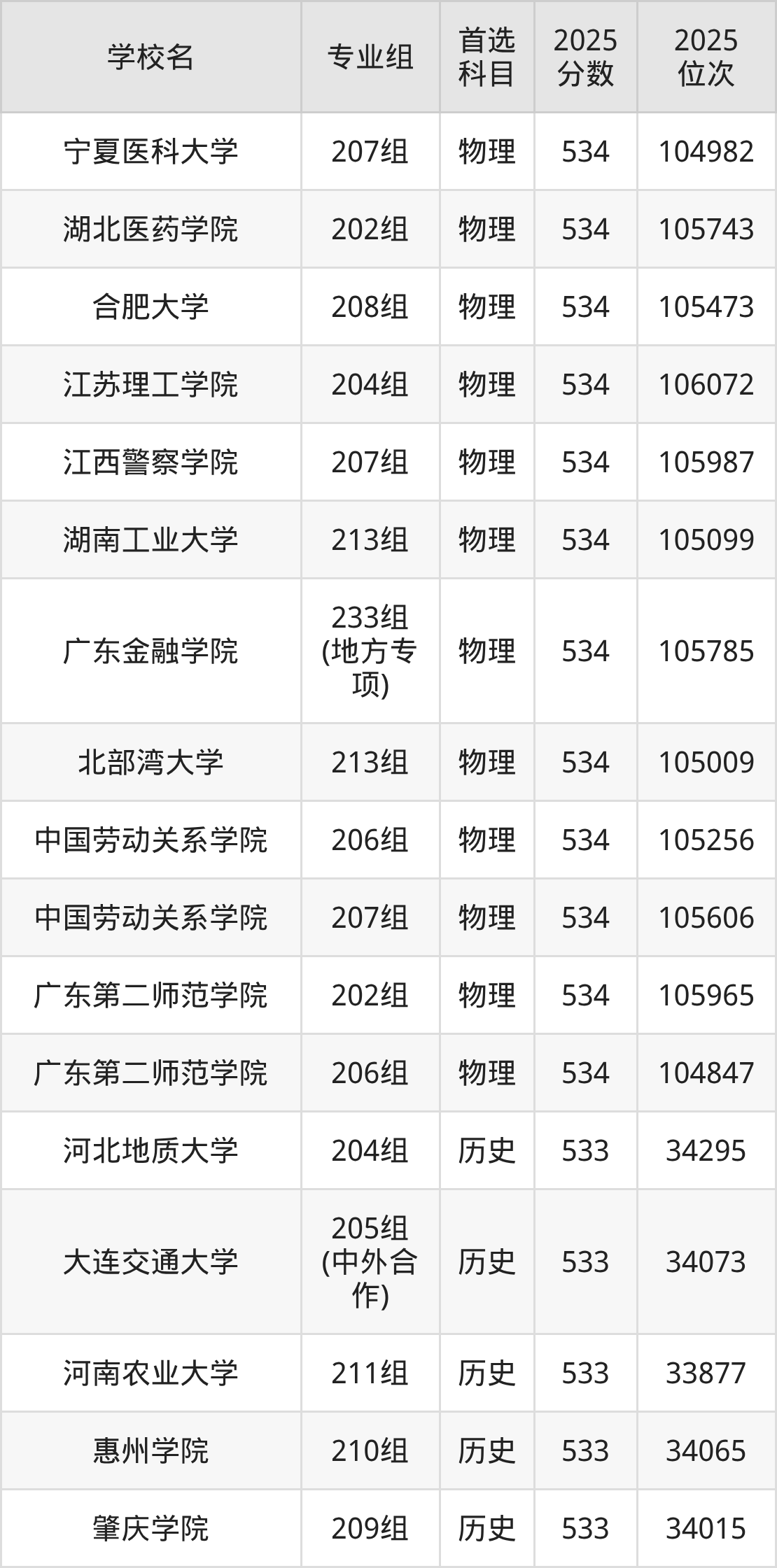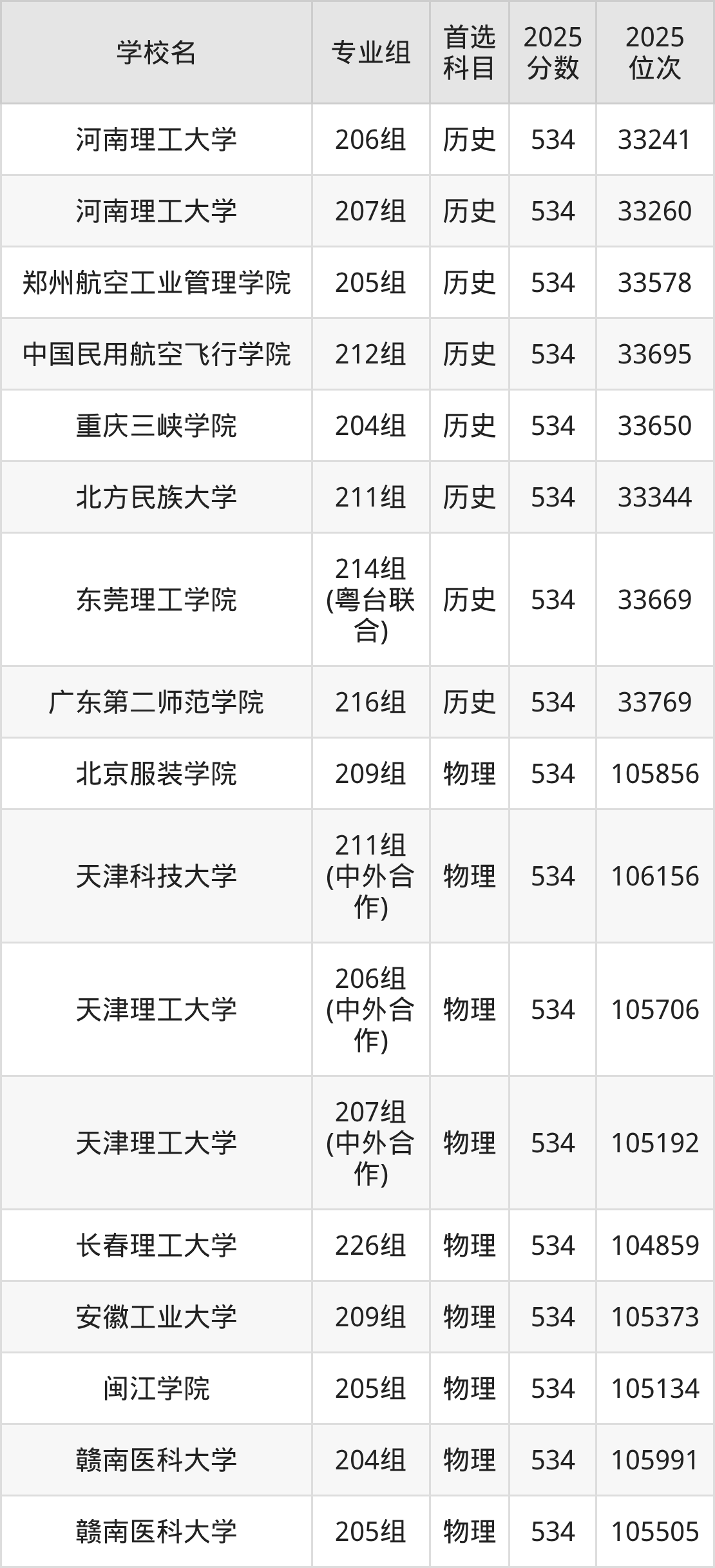 广东高考历史类534分对应的位次排名是33166名-33769名,物理类534分对应的位次排名是104829名-106191名,因此建议2026年位次排在这附近的同学考虑这些大学。