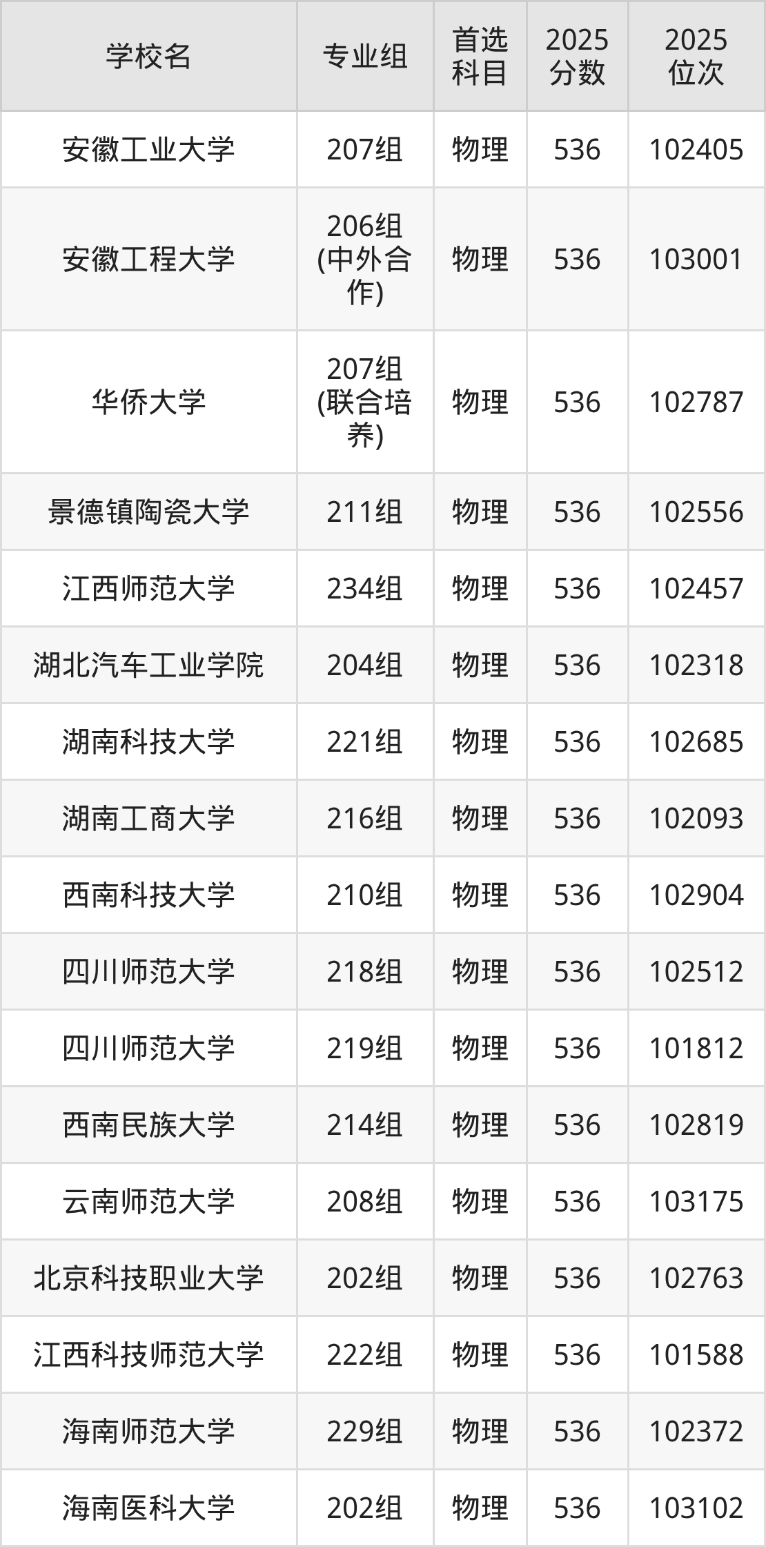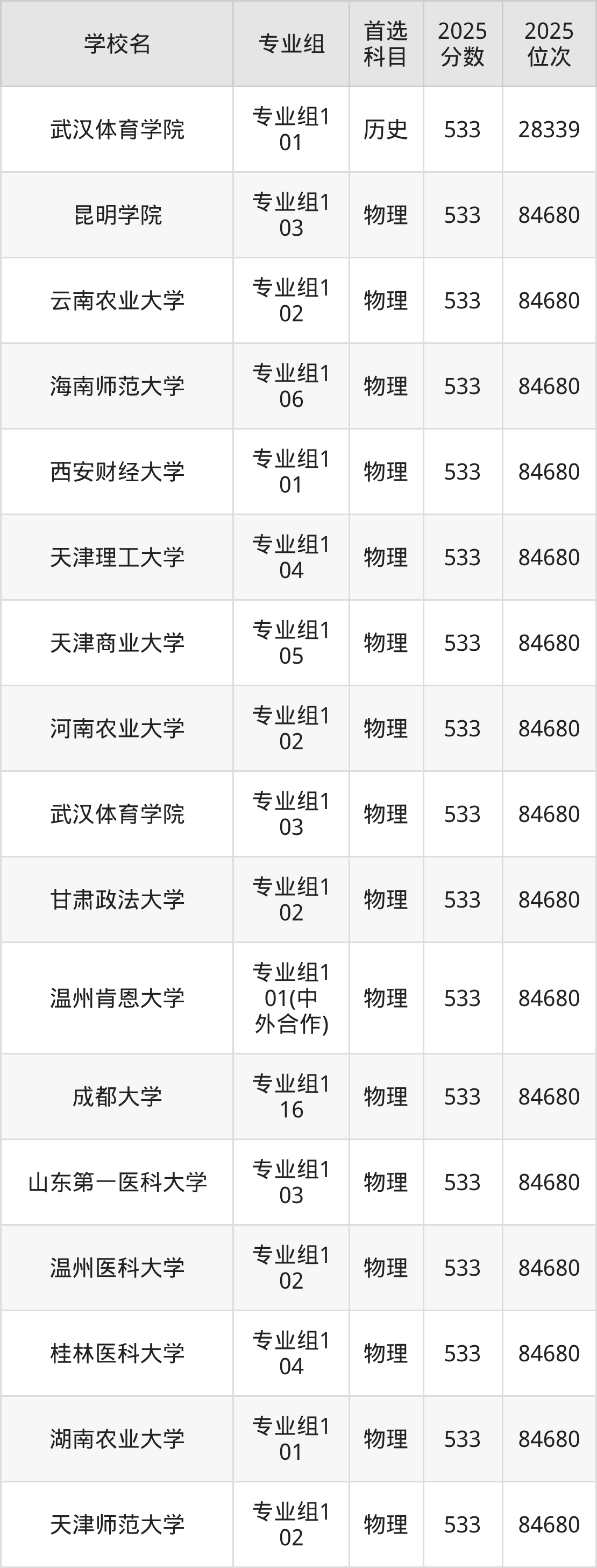物理类534分可以冲的大学:厦门医学院536分、江西师范大学536分、重庆科技大学536分、川北医学院536分等;较稳妥的大学:昆明学院533分、云南农业大学533分、海南师范大学533分、西安财经大学533分等。