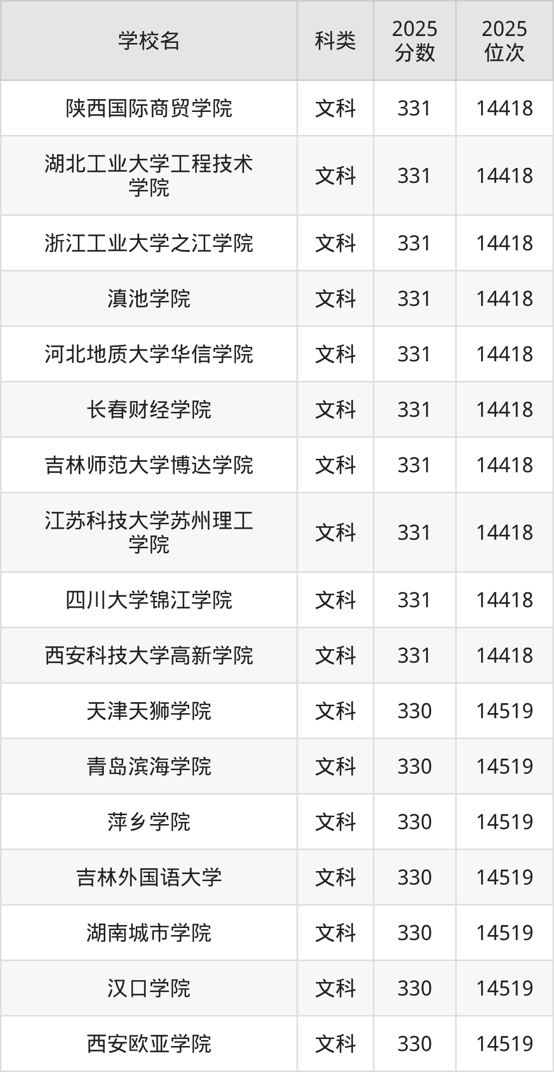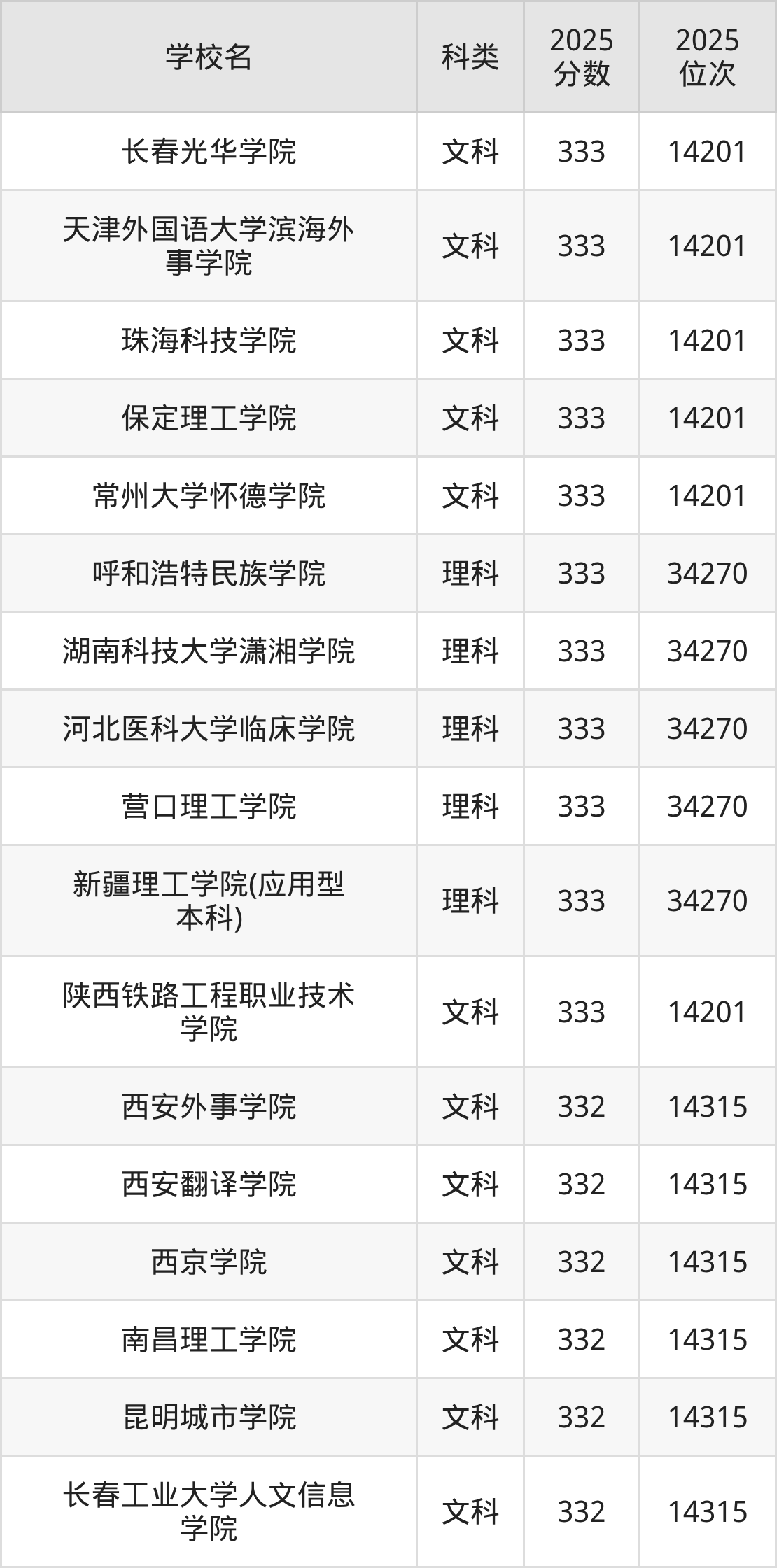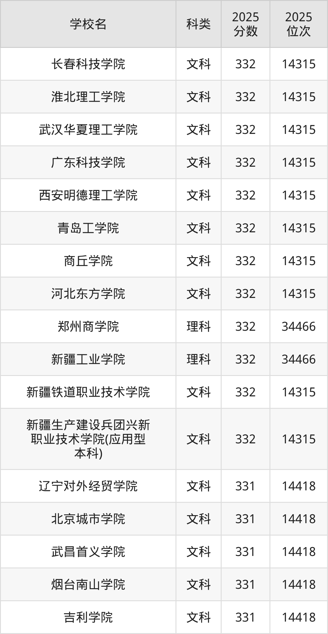 2025年在新疆高考文科录取分数线是332分的大学有西安外事学院、西安翻译学院、西京学院、南昌理工学院、昆明城市学院、长春工业大学人文信息学院、长春科技学院、淮北理工学院、武汉华夏理工学院、广东科技学院等。理科录取分数线是332分的大学有郑州商学院、新疆工业学院。