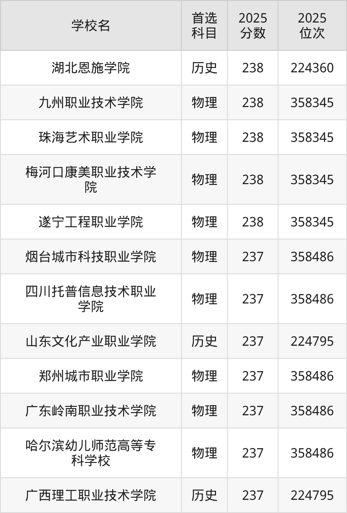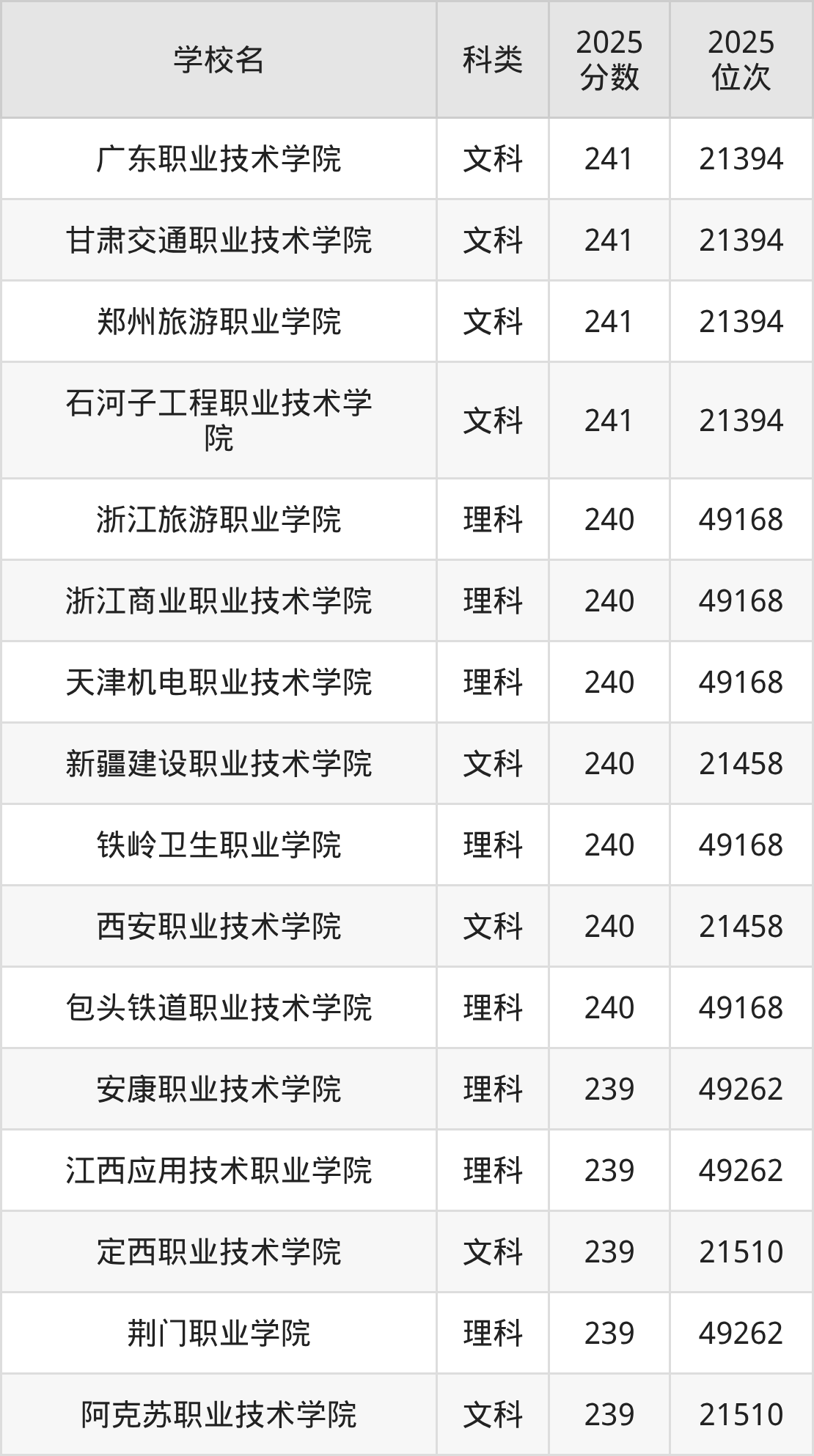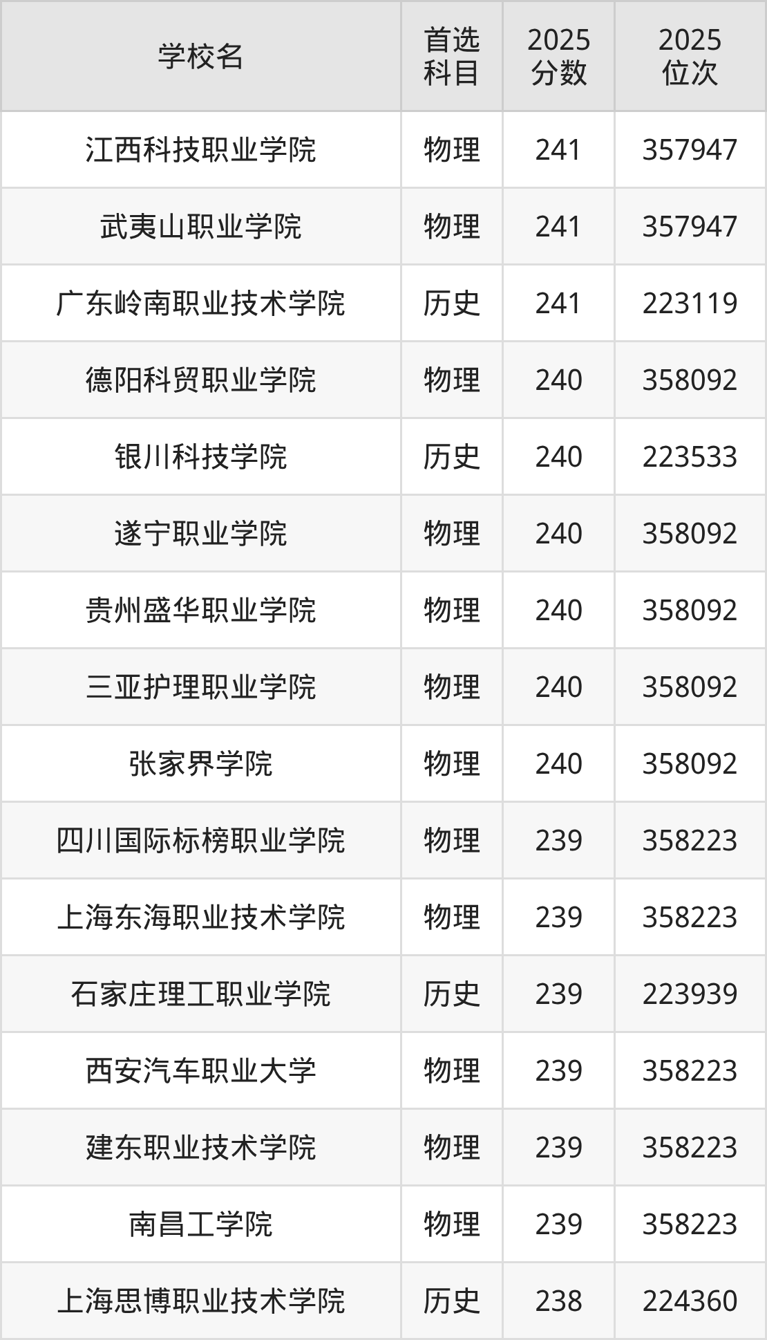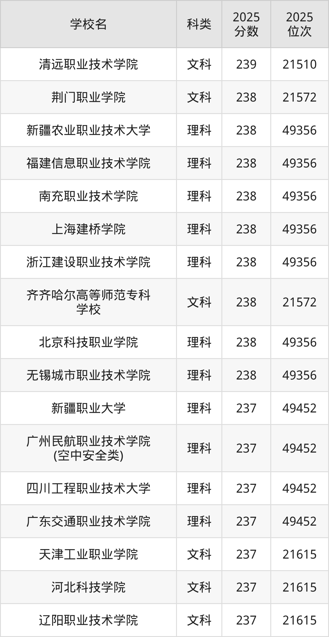 下面老师将以上文整理的其中两个省份为例,为大家具体展示239分左右能上的专科大学名单。