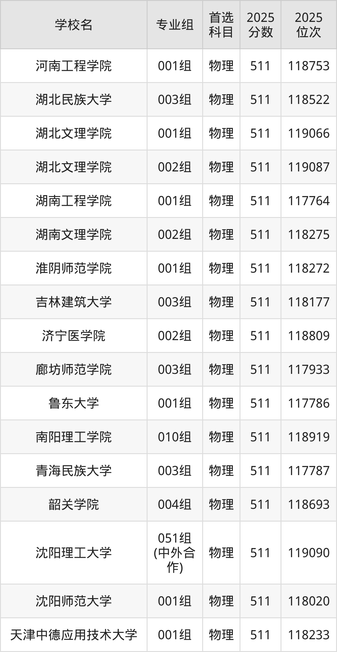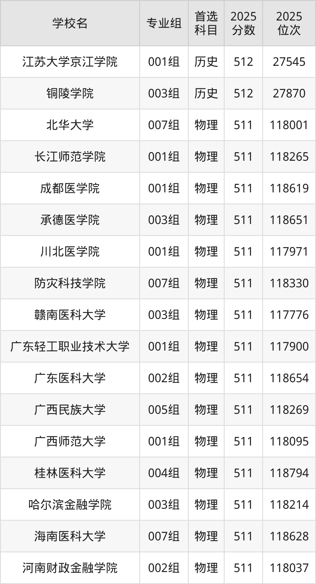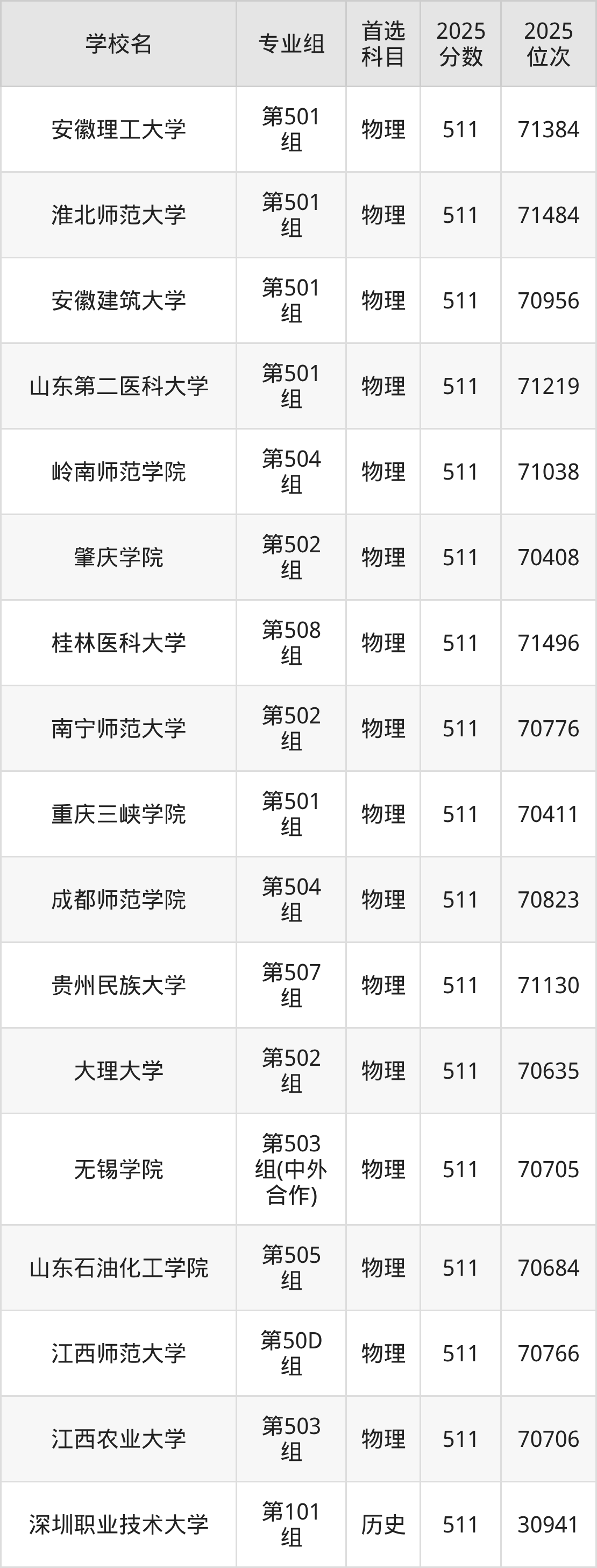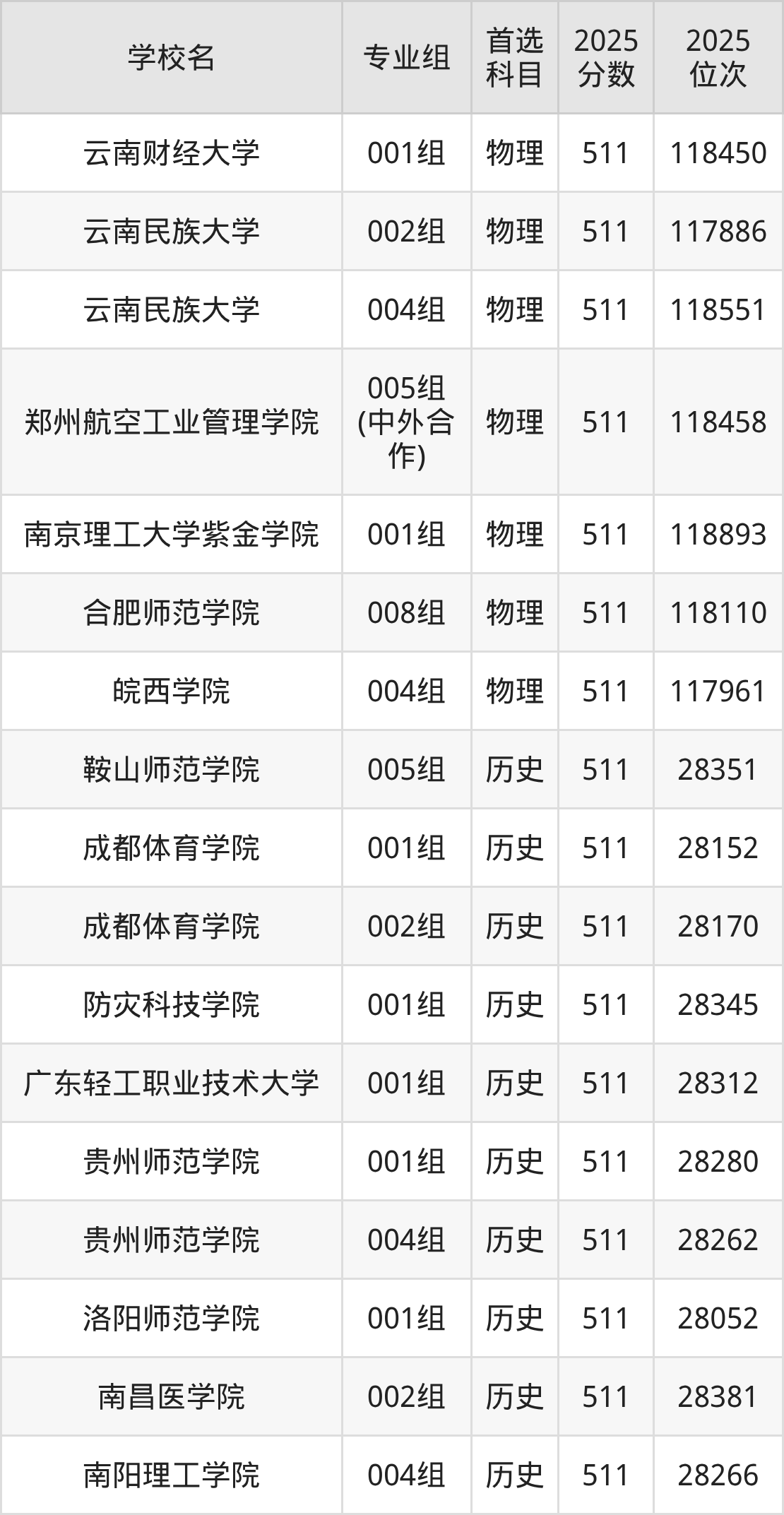 安徽高考物理类511分对应的位次排名是117764名-119090名,历史类511分对应的位次排名是28039名-28407名,因此建议2026年位次排在这附近的同学考虑这些大学。