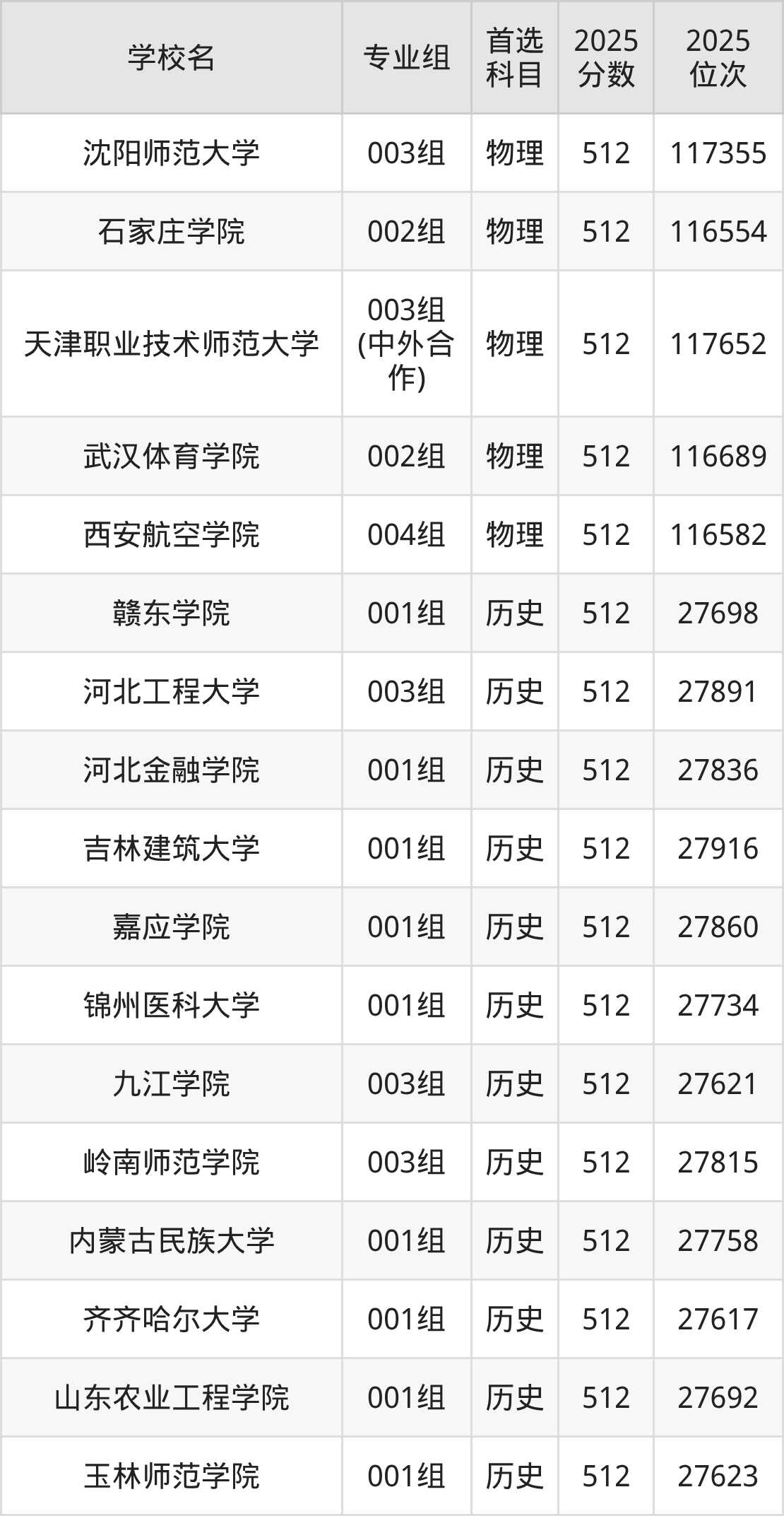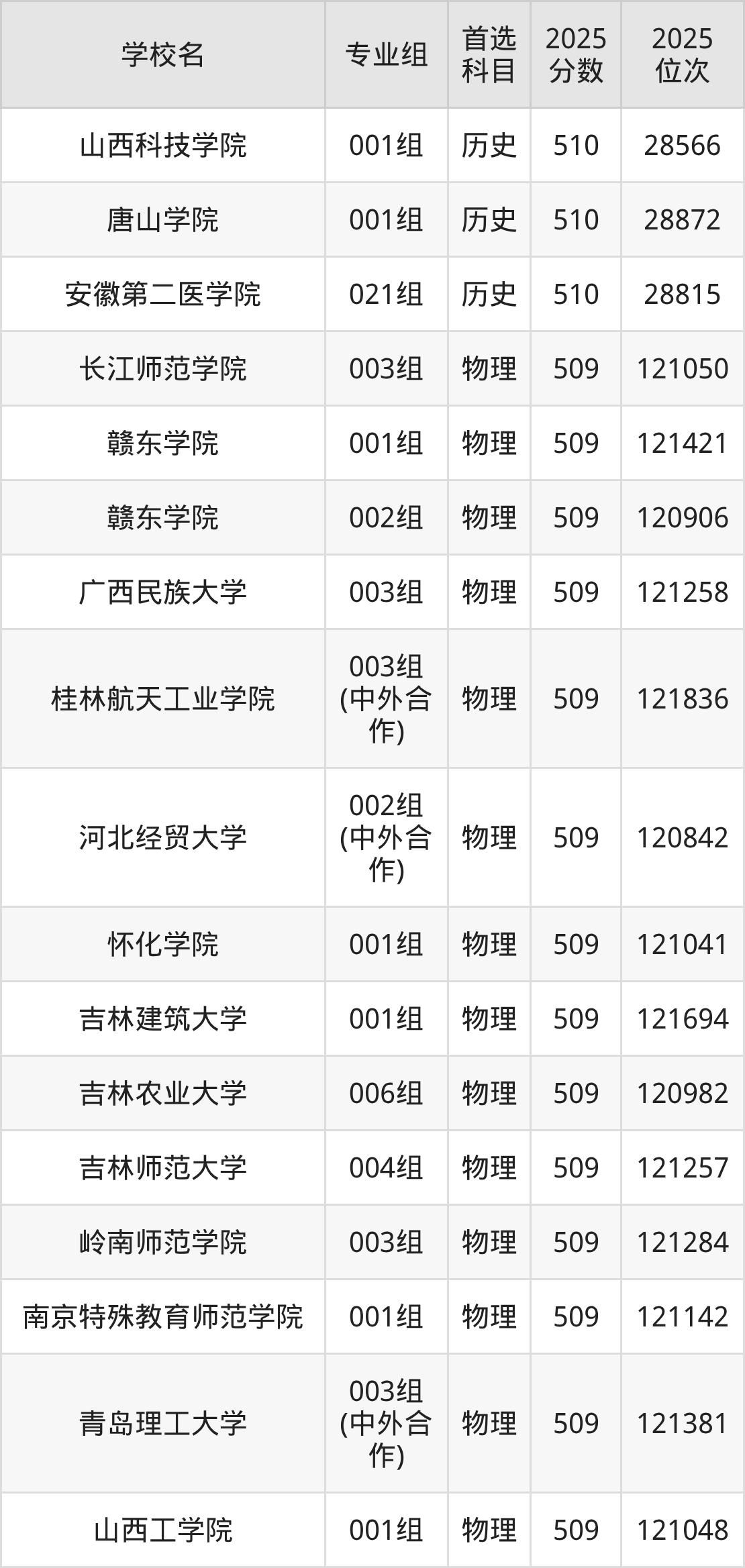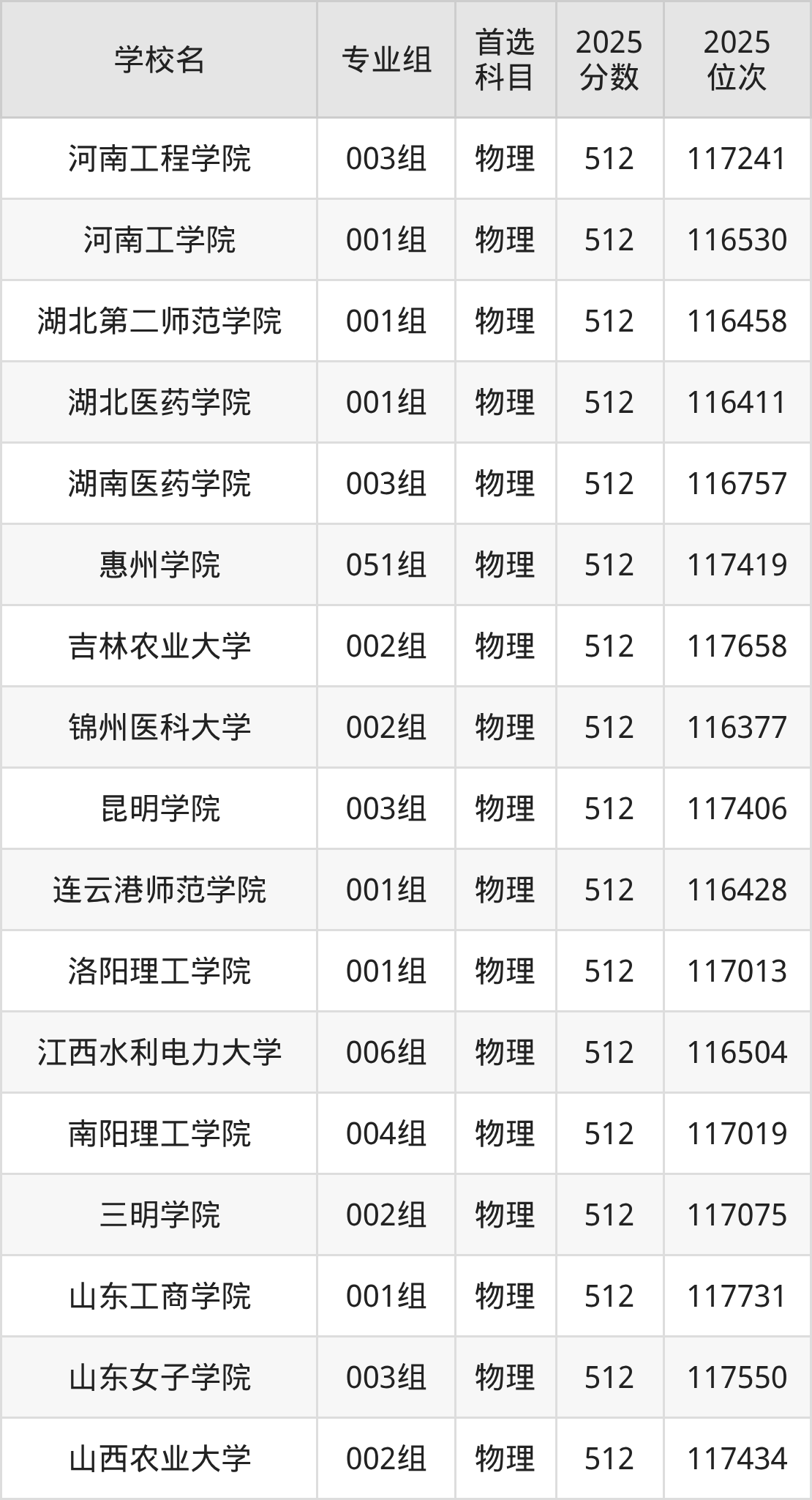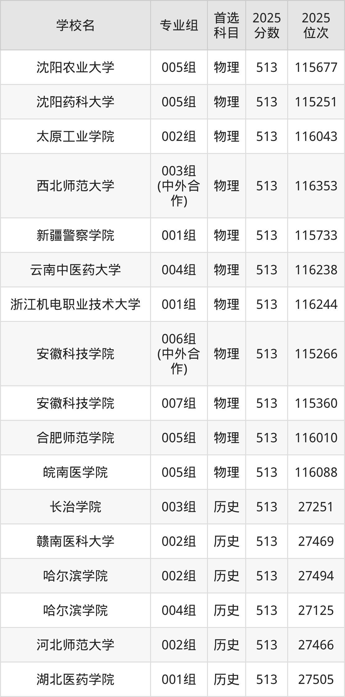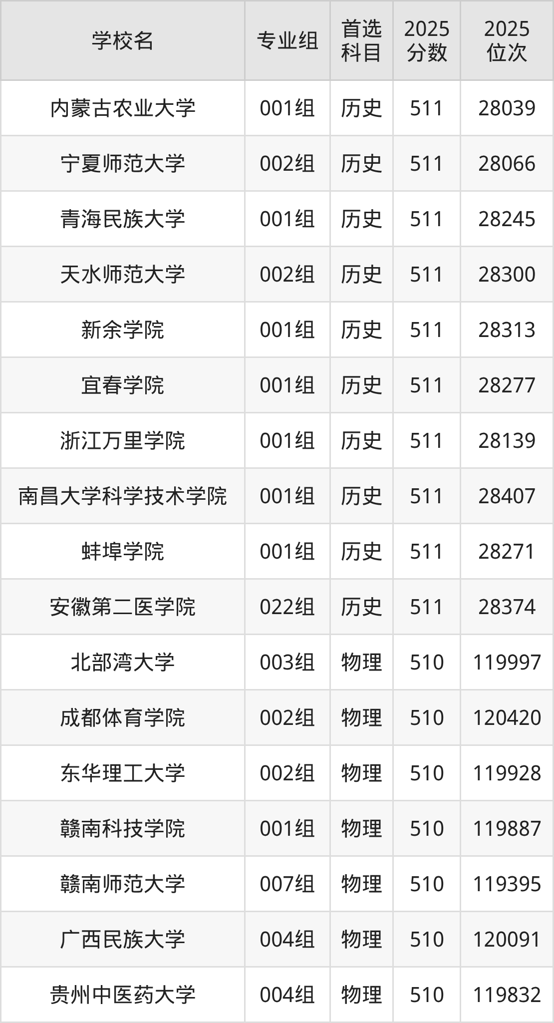 安徽高考物理类511分对应的位次排名是117764名-119090名,历史类511分对应的位次排名是28039名-28407名,因此建议2026年位次排在这附近的同学考虑这些大学。