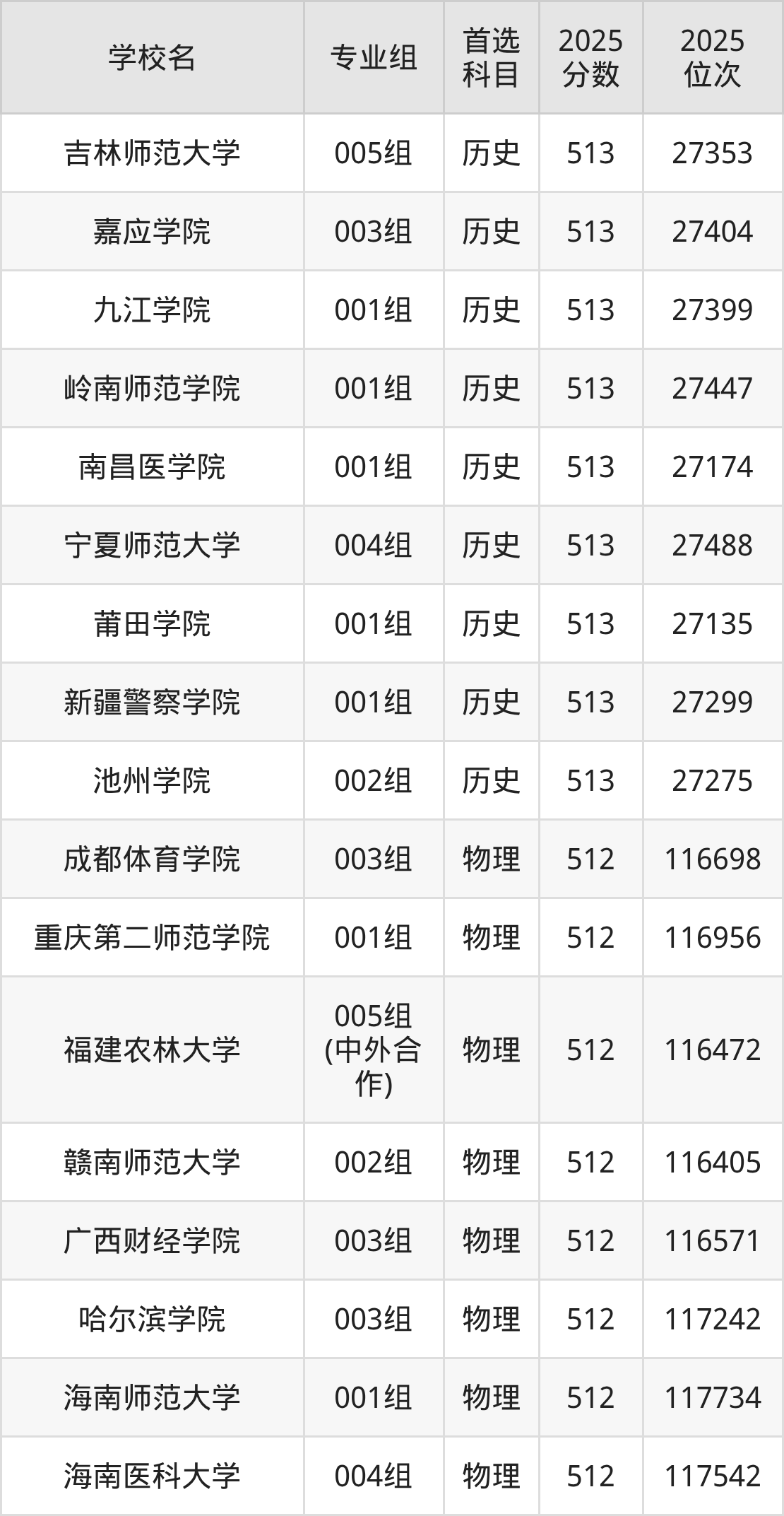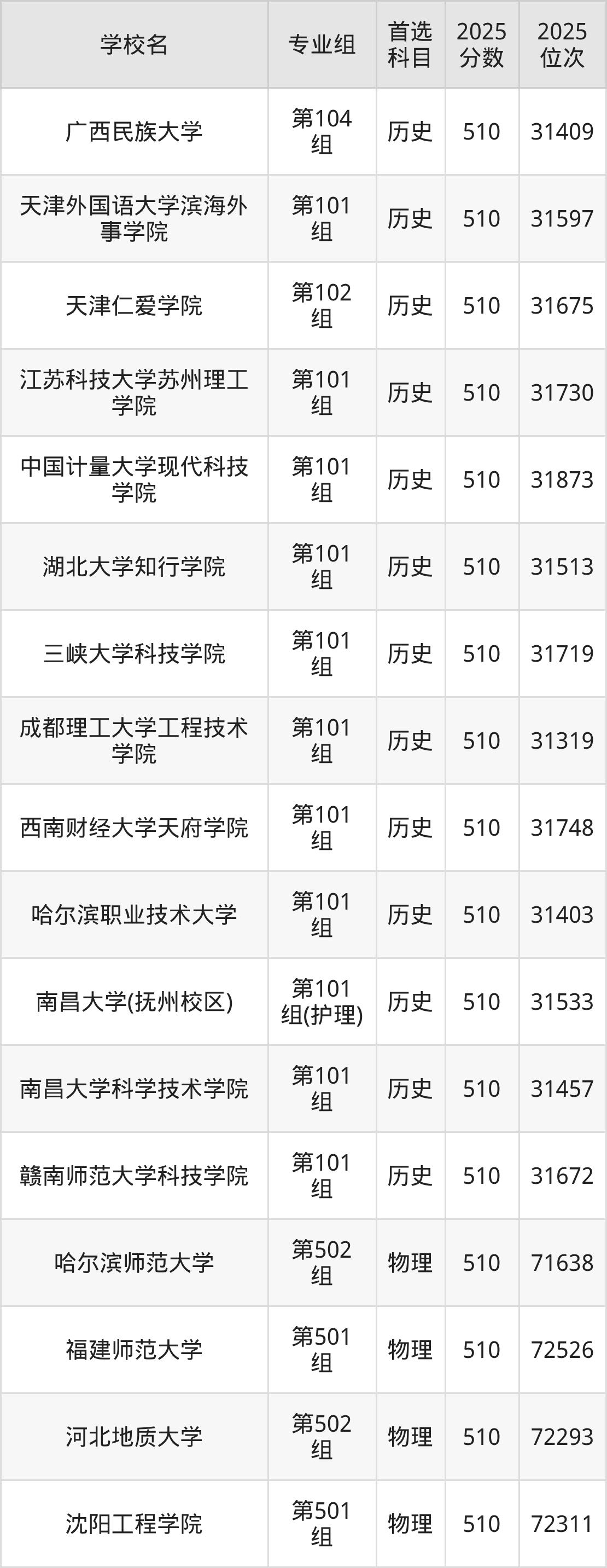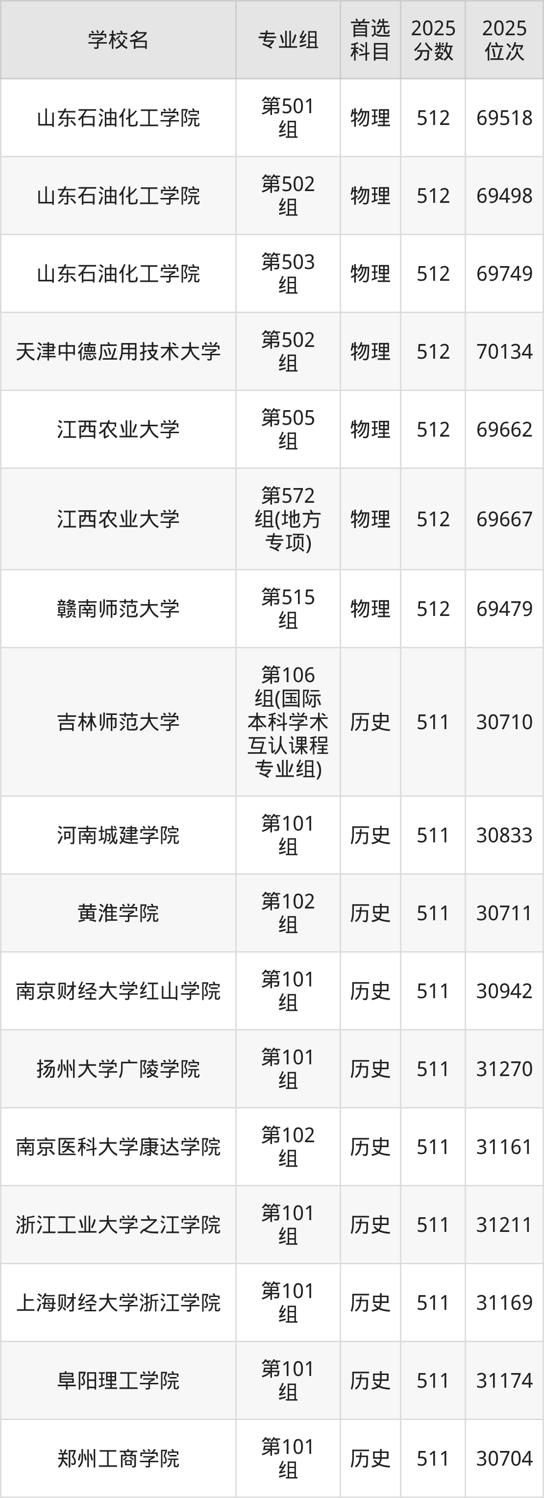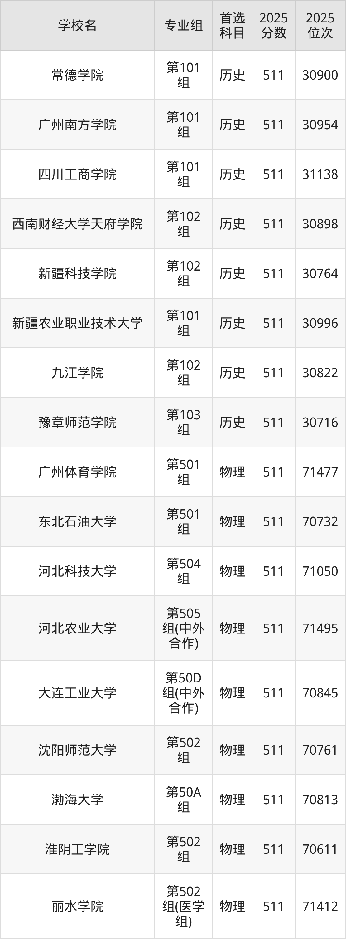 江西高考历史类511分对应的位次排名是30704名-31270名,物理类511分对应的位次排名是70408名-71496名,因此建议2026年位次排在这附近的同学考虑这些大学。