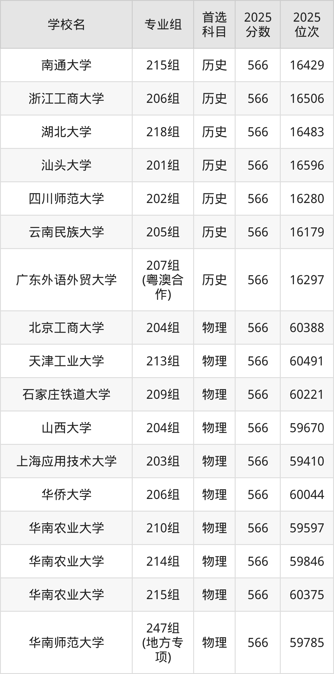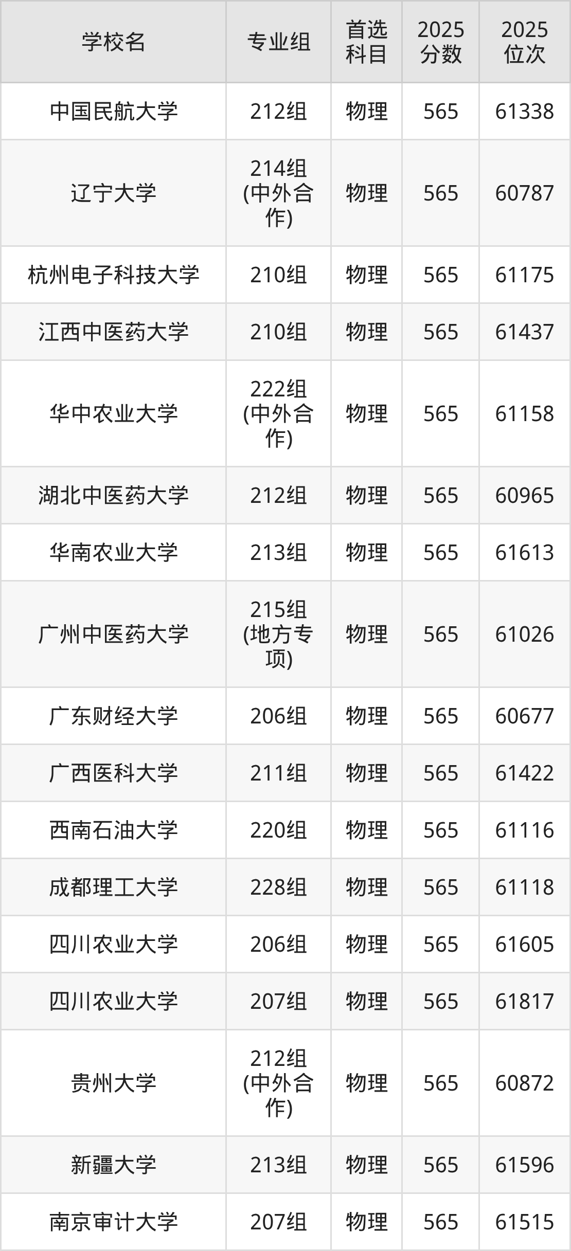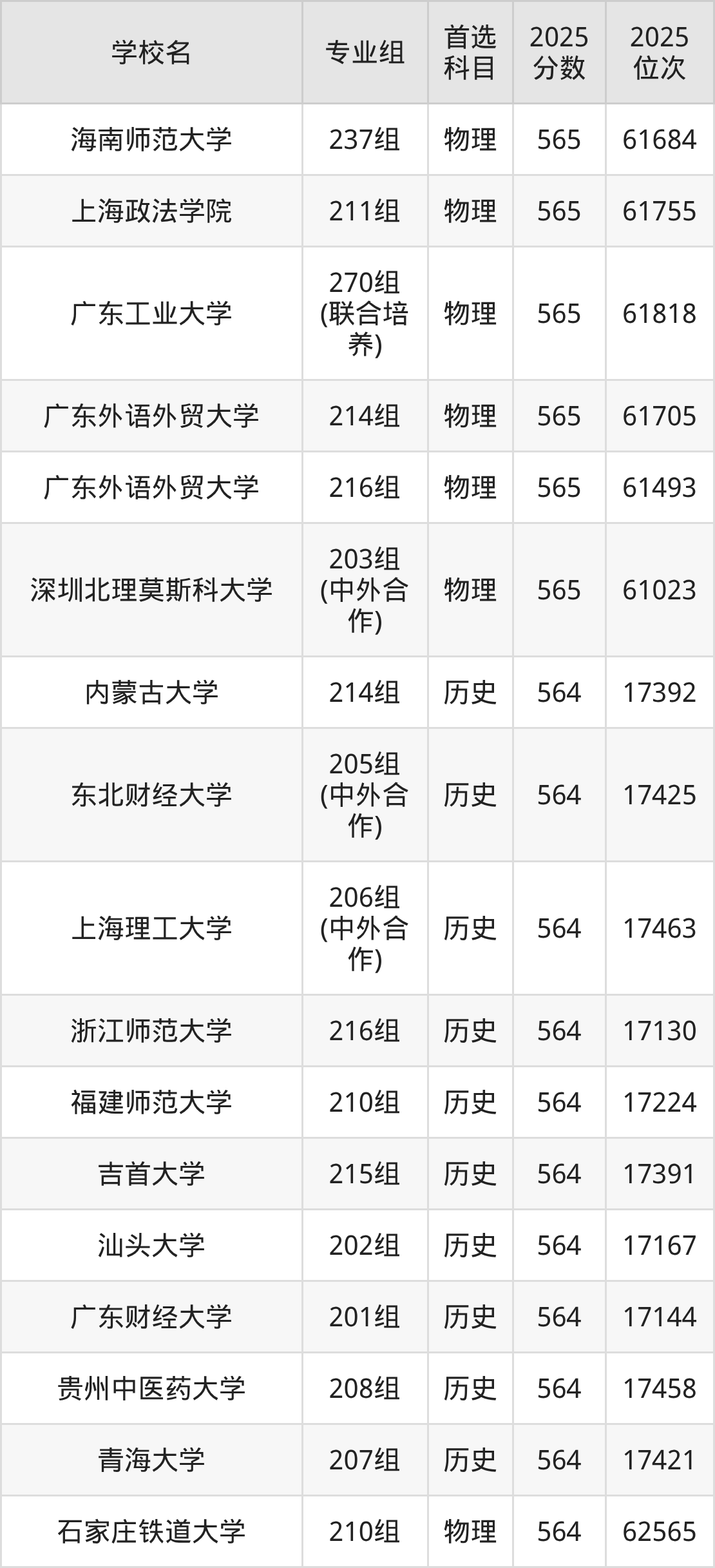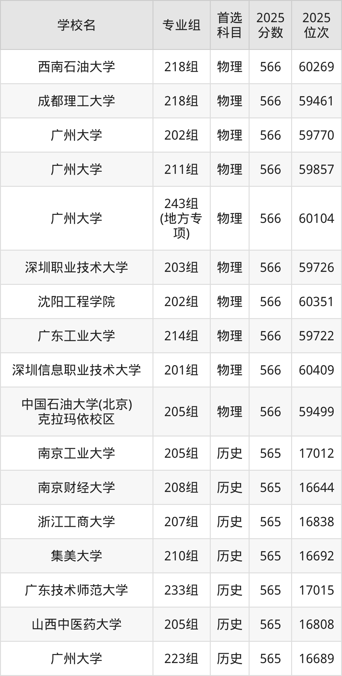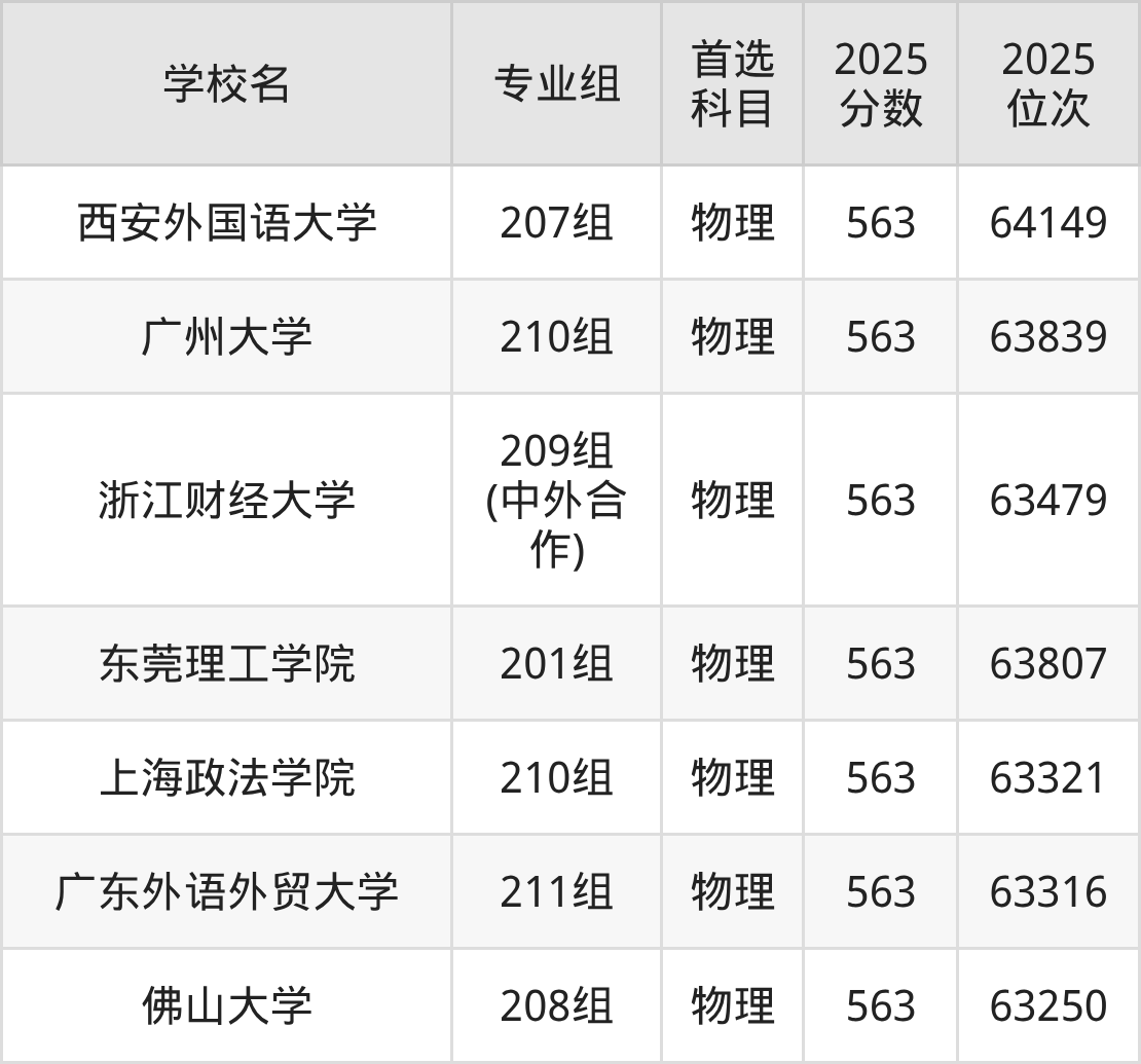 广东高考物理类565分对应的位次排名是60677名-61818名,历史类565分对应的位次排名是16644名-17015名,因此建议2026年位次排在这附近的同学考虑这些大学。