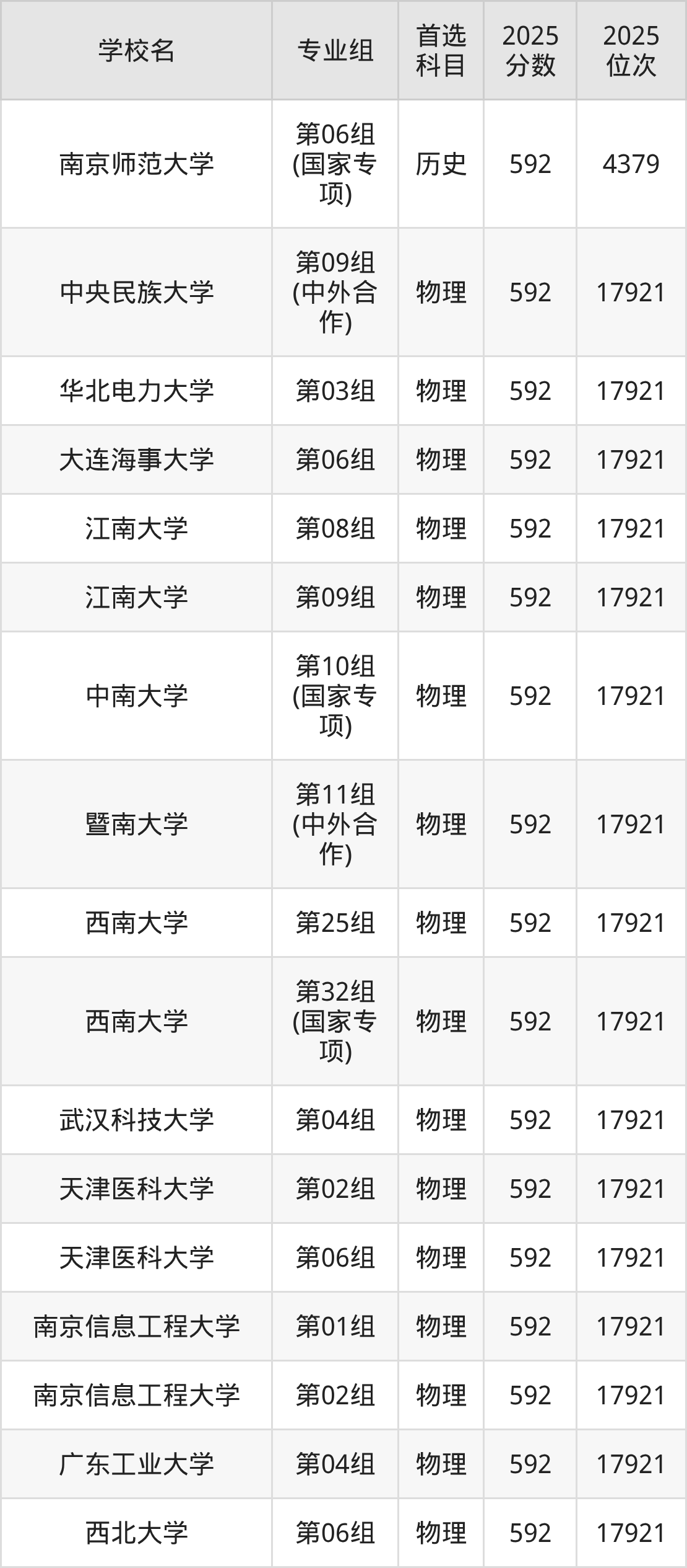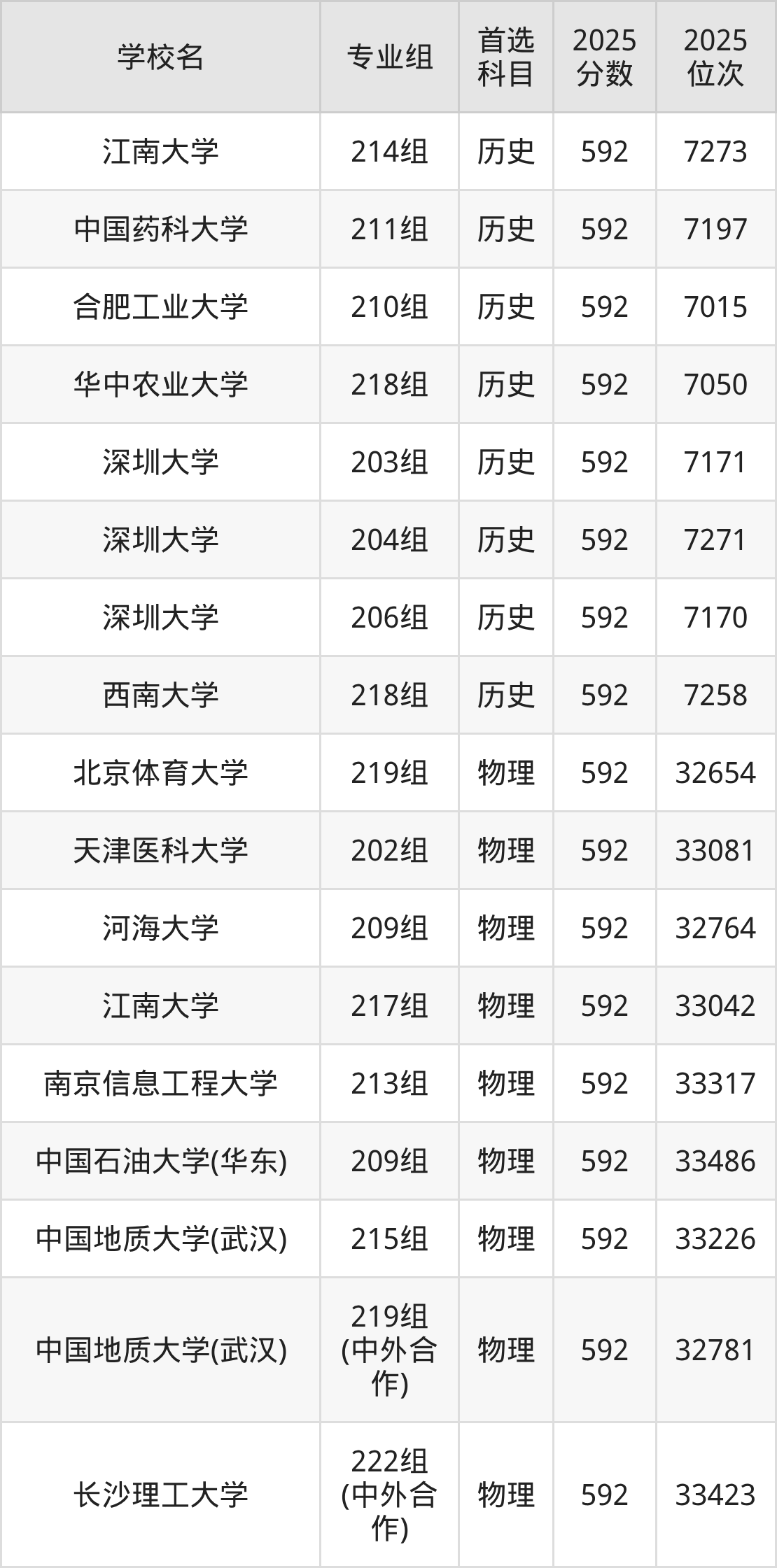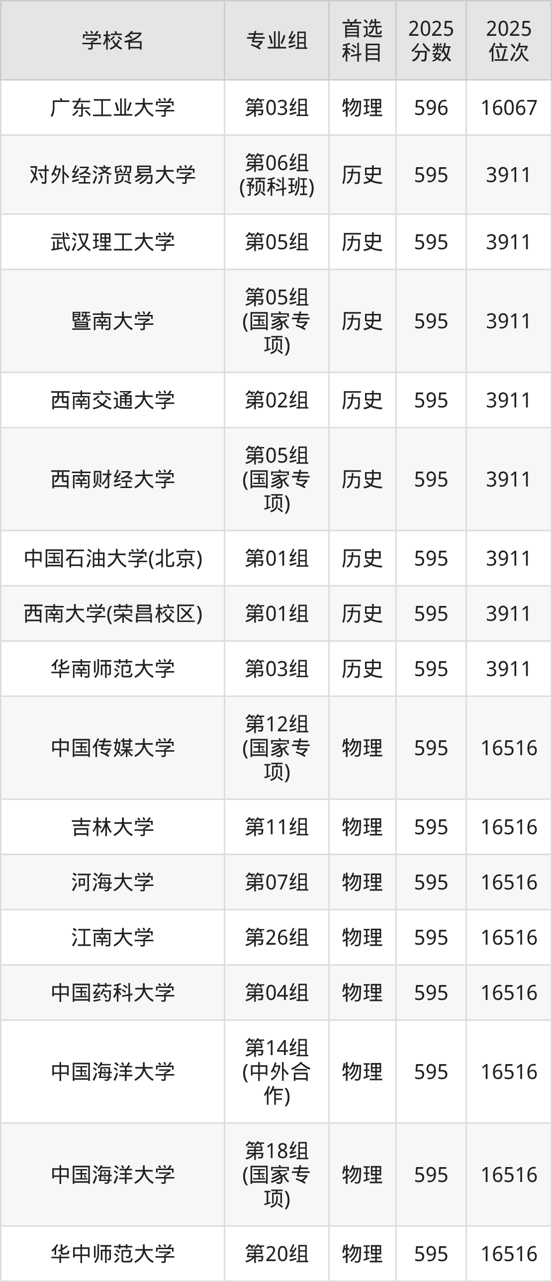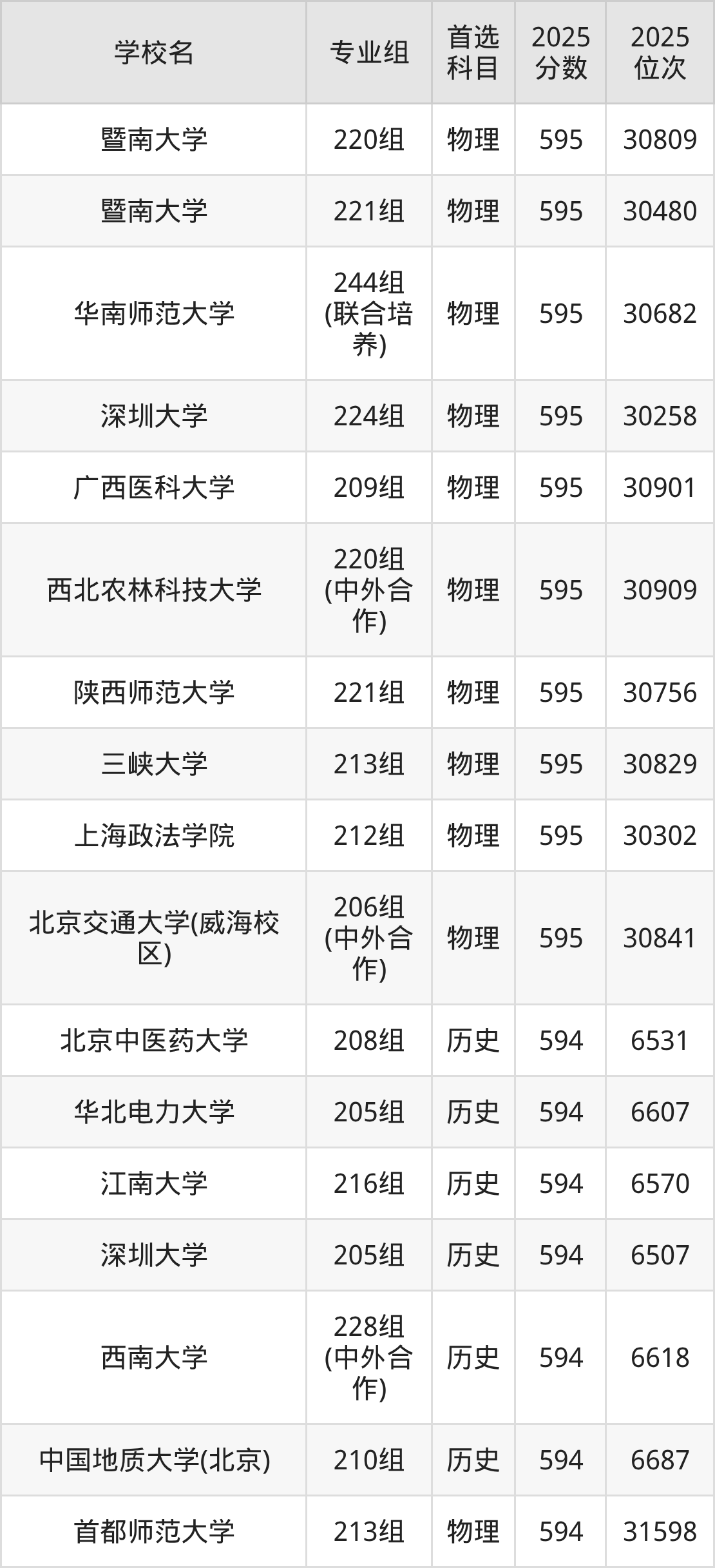 2025年在广东高考历史类录取分数线是594分的大学有北京中医药大学、华北电力大学、江南大学、深圳大学、西南大学、中国地质大学(北京)。物理类录取分数线是594分的大学有首都师范大学、北京电影学院、中国美术学院、南昌大学、郑州大学、暨南大学、华南师范大学、深圳大学、贵州大学、西北农林科技大学等。