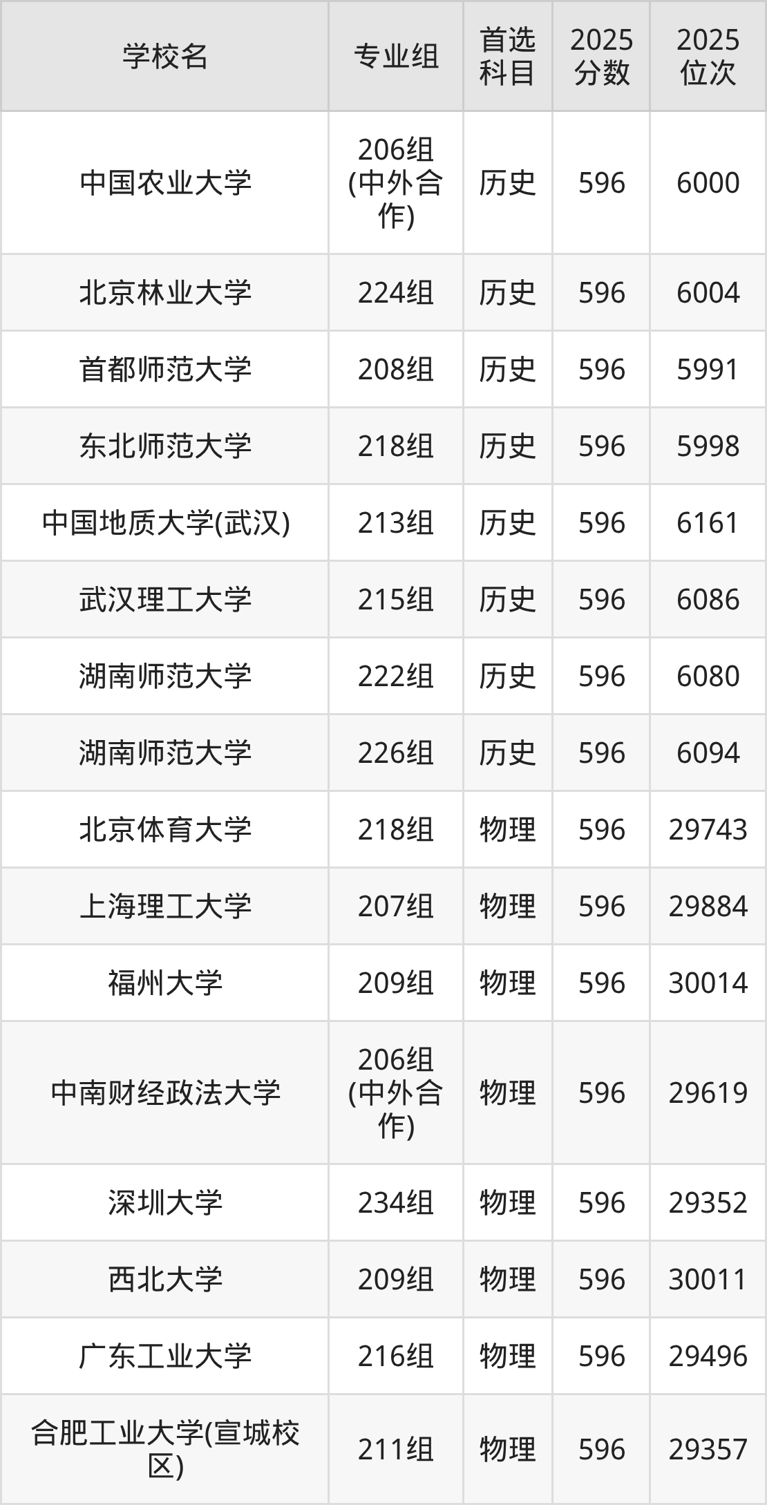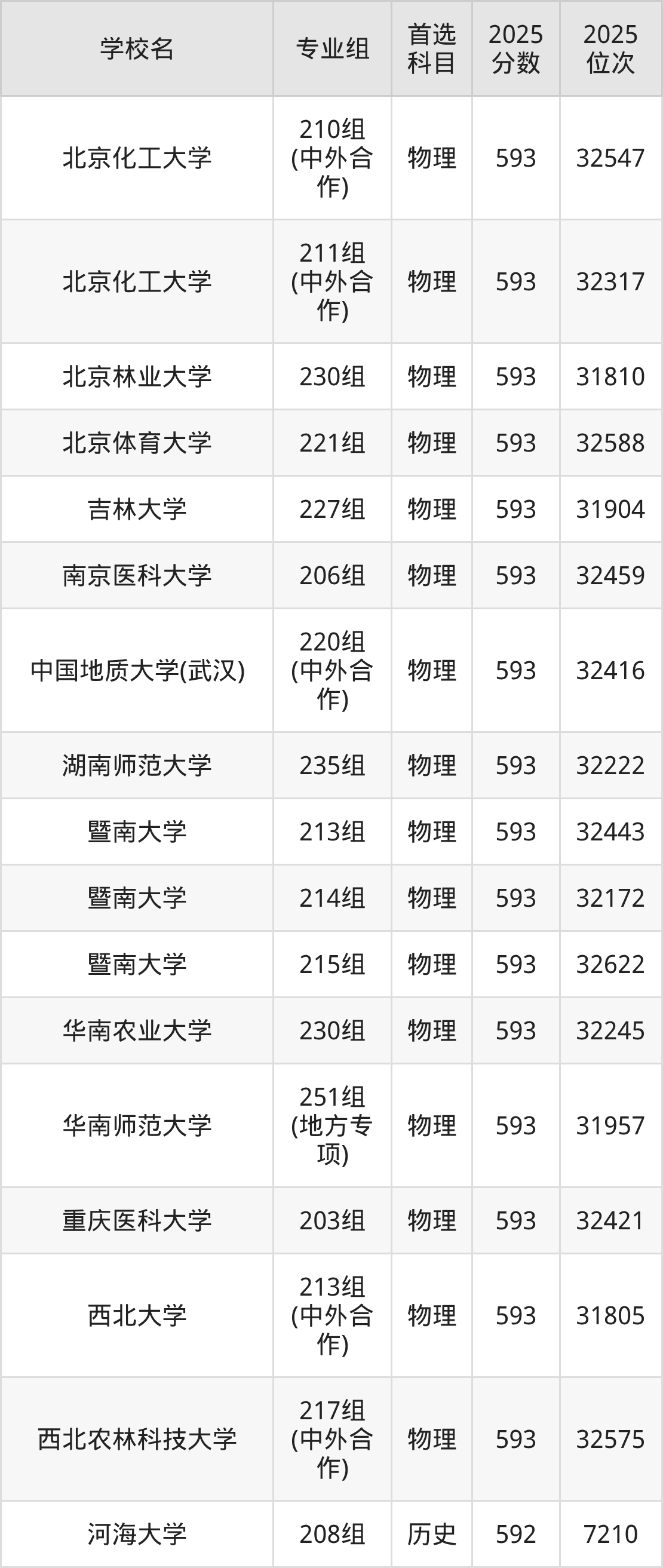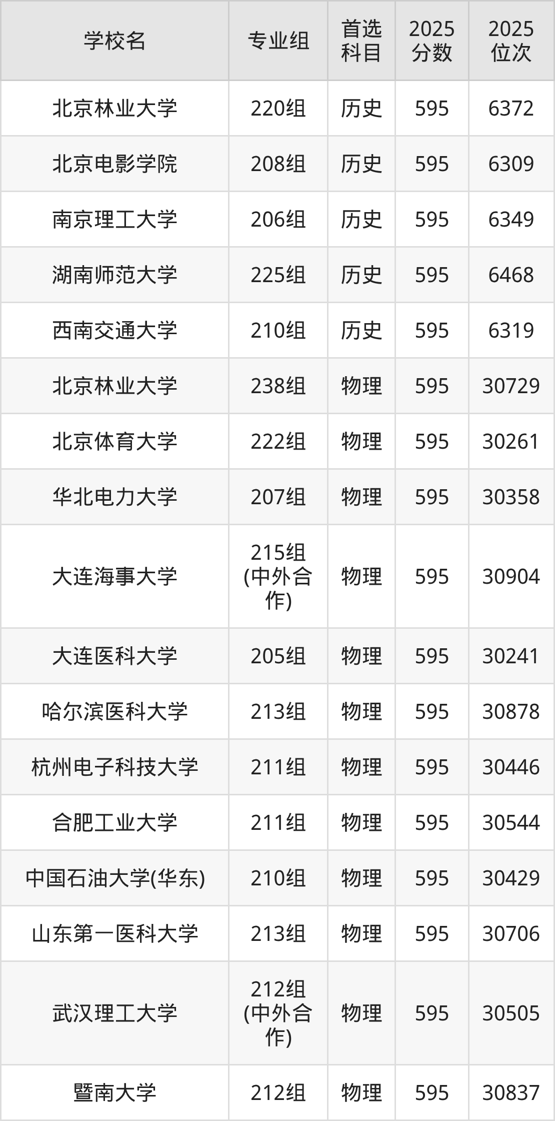 2025年在湖北高考历史类录取分数线是594分的大学有北京化工大学、中国农业大学、北京中医药大学、中国传媒大学、江南大学、西南大学、长安大学、陕西师范大学、湖南师范大学、海南大学等。物理类录取分数线是594分的大学有北京化工大学、北京体育大学、中央民族大学、吉林大学、华东理工大学、河海大学、厦门大学、华中农业大学、西北农林科技大学、兰州大学等。