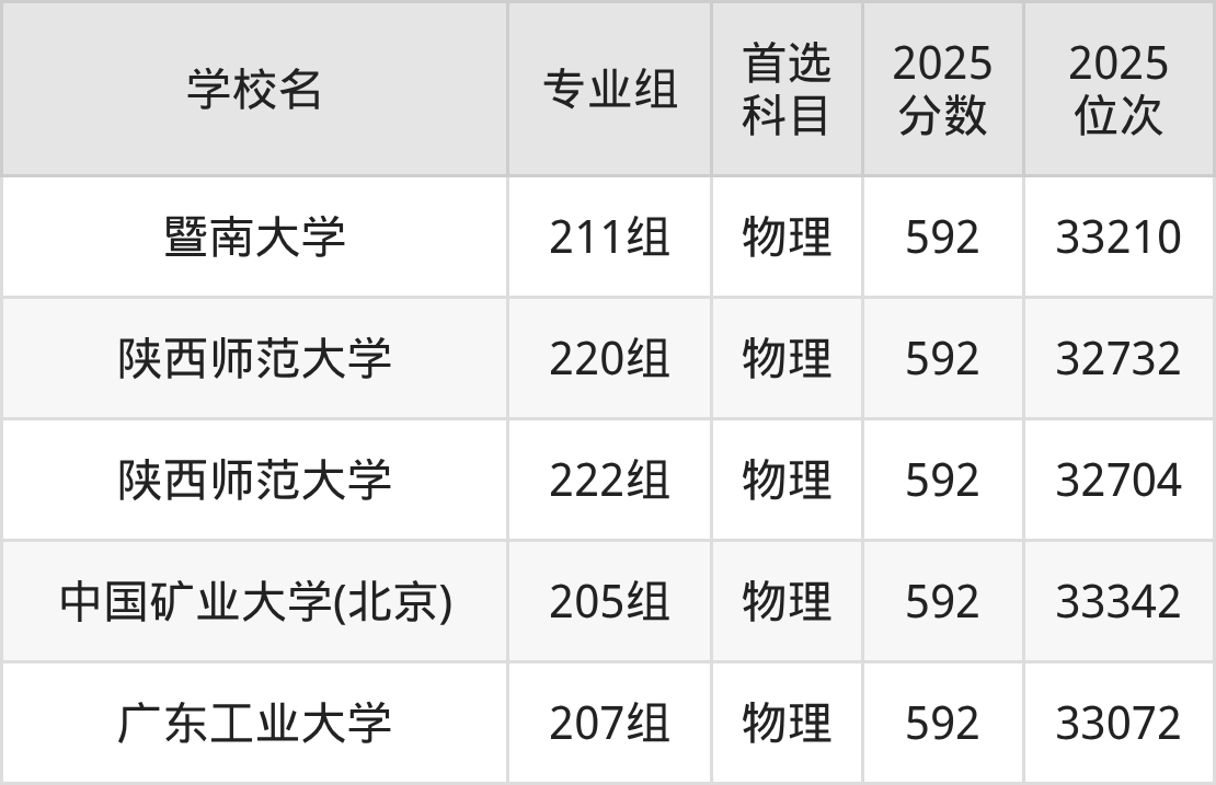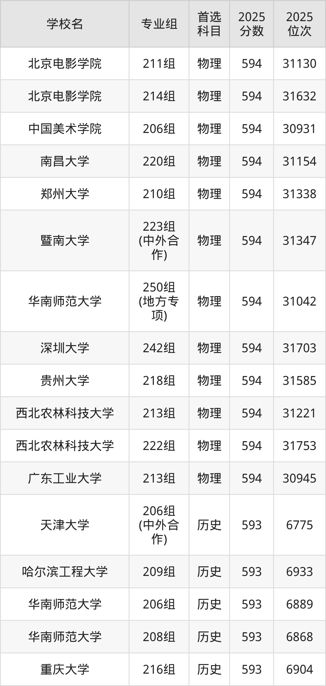 广东高考历史类594分对应的位次排名是6507名-6687名,物理类594分对应的位次排名是30931名-31753名,因此建议2026年位次排在这附近的同学考虑这些大学。