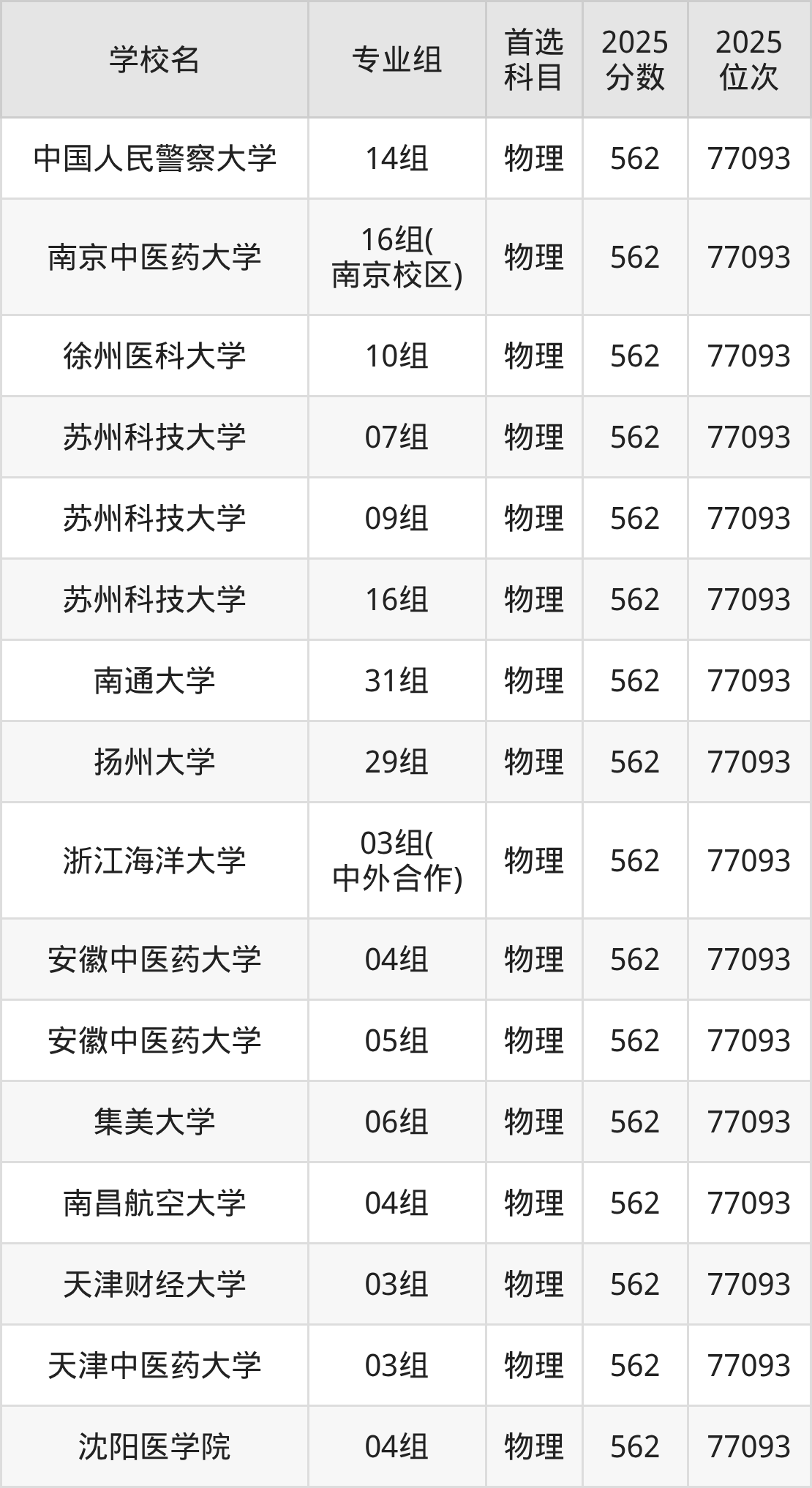 物理类560分可以冲的大学:中国人民警察大学562分、南京中医药大学562分、徐州医科大学562分、苏州科技大学562分等;较稳妥的大学:苏州科技大学559分、南通大学559分、扬州大学559分、上海立信会计金融学院559分等。